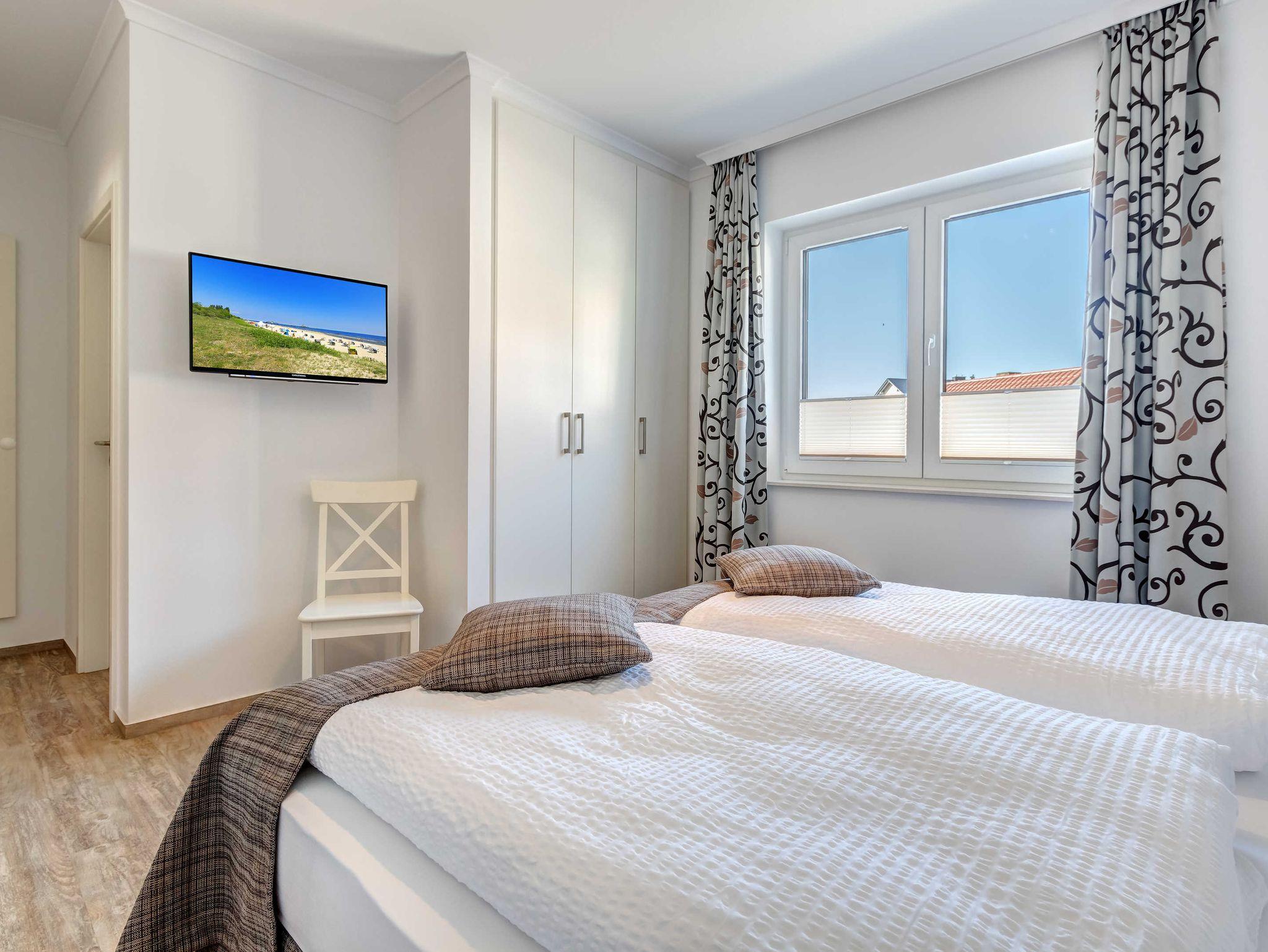 Neubau 2018 mit Fußbodenheizung. Modern eingerichtete 4-Zimmer-Wohnung mit Terrasse und Garten! Die Wohnung ist speziell für Familien mit (kleinen) Kindern gedacht, bietet aber auch bei Belegung mit 6 Erwachsenen den gewünschten Komfort.. Die Wohnung verfügt über drei separate Schlafzimmer (2 Doppelbetten, 1 Doppelschrankbett), jeweils mit zugehörigem ensuite-Bad, Wohnzimmer mit Küchenzeile und Essplatz. Von den drei Bädern sind zwei Duschbäder und eines mit Wanne und Dusche. Im eingezäunten Garten befindet sich ein kleiner Privat-Spielplatz mit Sandkasten und Spielgerät. Eines der drei Schlafzimmer (mit dem Wannenbad ensuite) verfügt über zwei Kinderreisebetten, 2 Kinderhochstühle, Wickelkommode, eine kleine Auswahl Spielzeug und ein hochwertiges ausklappbares Schrankbett, damit es auch erwachsene Gäste bequem nutzen können. Zwei Pkw-Stellplätze sind inklusive.