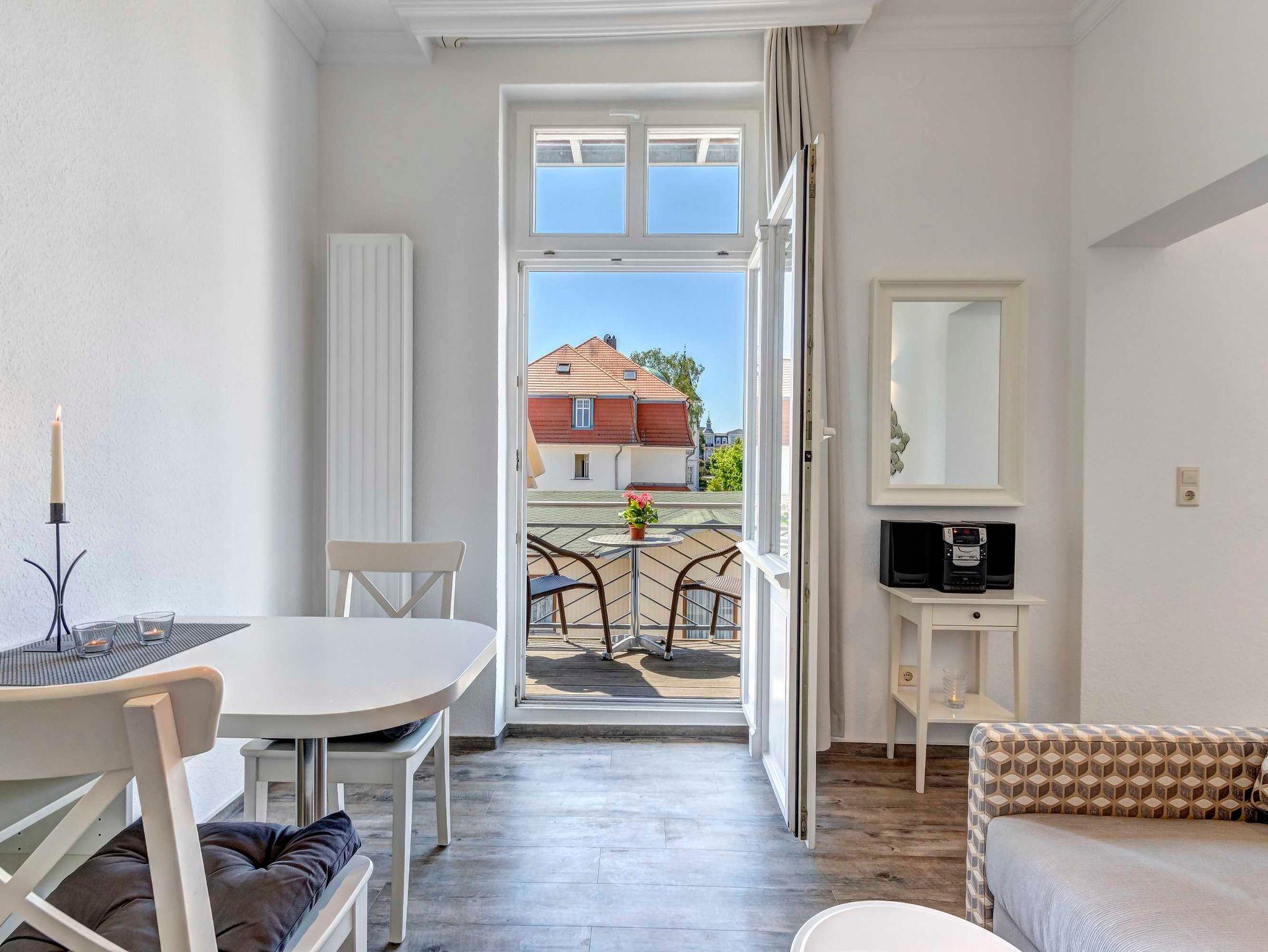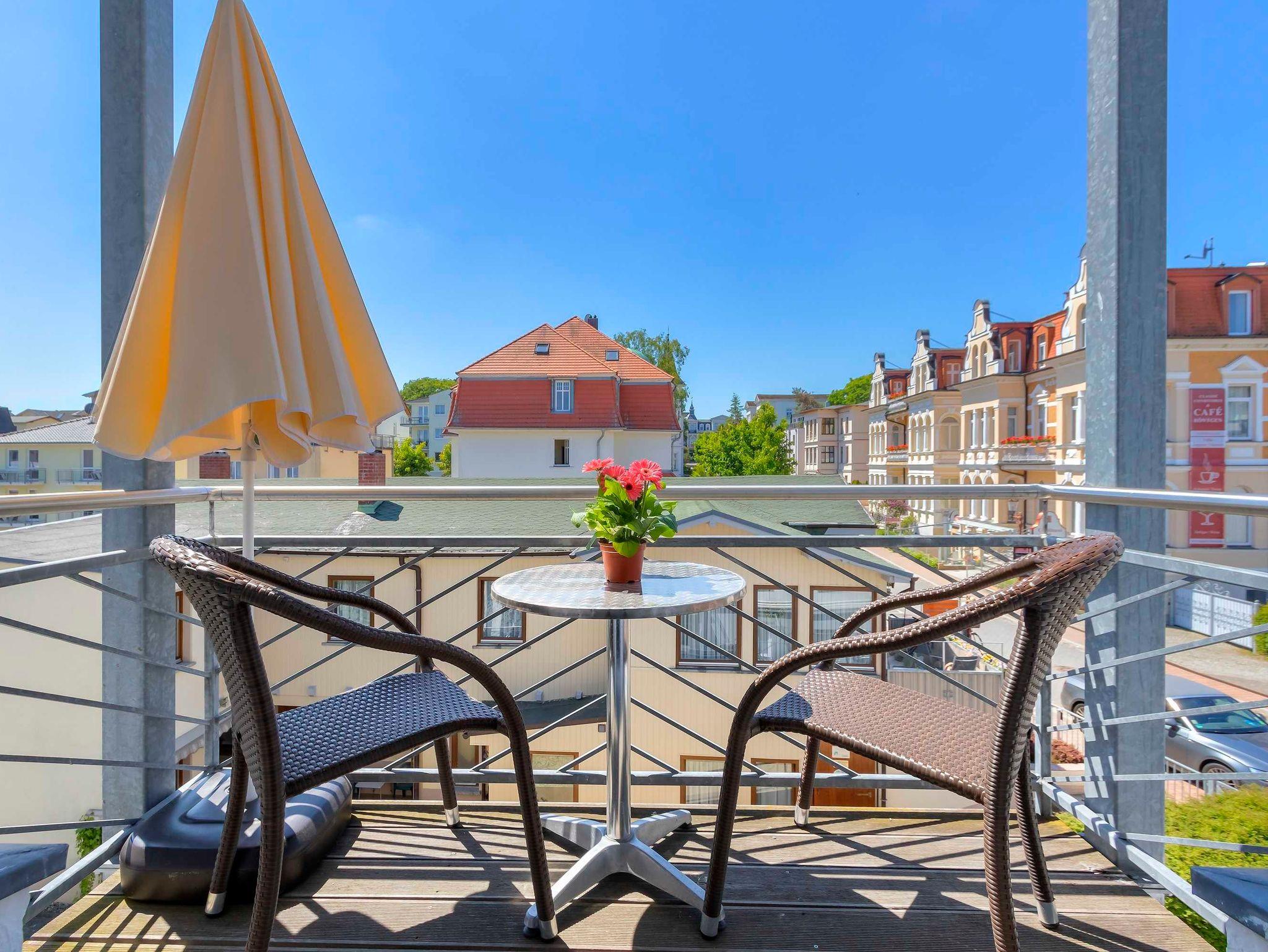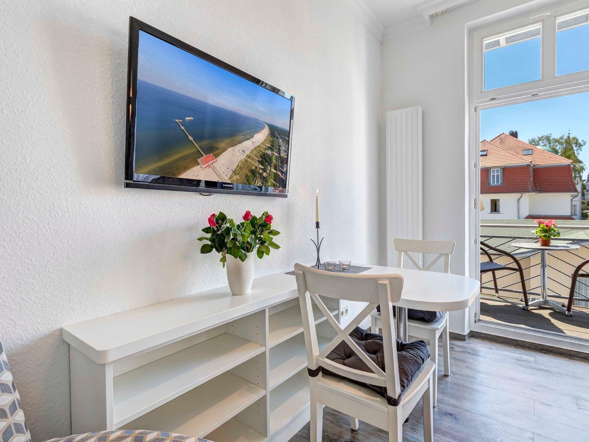 Direkt an der Strandpromenade - 1. Reihe mit SÜDBALKON - ein schönes 2 - Zimmer - Apartment im I. OG mit moderner Einrichtung, separater Küchennische (mit Kaffeemaschine, Wasserkocher, Toaster, Mikrowelle), Duschbad, Südbalkon mit Sonne bis abends. Die Wohnung verfügt über einen Pkw-Stellplatz. In der Garage können Fahrräder und ähnliches untergestellt werden. Im Haus gibt es eine Sauna sowie Waschmaschine und Trockner (alles mit Münzern). Von der Villa Germania aus können Sie das Ortszentrum und die bekannte Ahlbecker Seebrücke in ca. 3 Minuten zu Fuß erreichen. Zum Strand sind es 50 m.