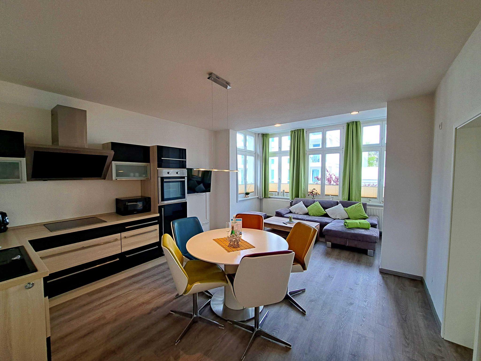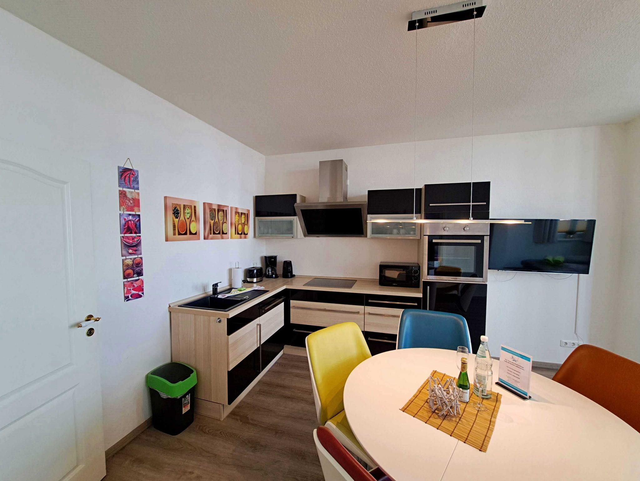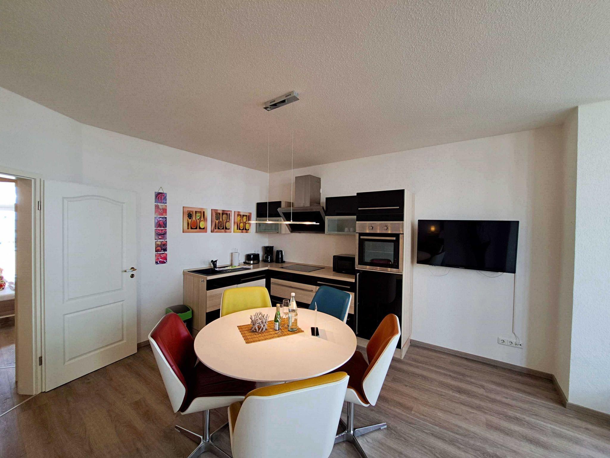 Der helle Wohnbereich ist mit einer komfortablen Couch, einem Flachbild-TV und seitlichem Ostseeblick ausgestattet - perfekt für entspannte Abende. Die offene Küchenzeile mit Essbereich ist voll ausgestattet und lädt dazu ein, kulinarische Köstlichkeiten selbst zuzubereiten.