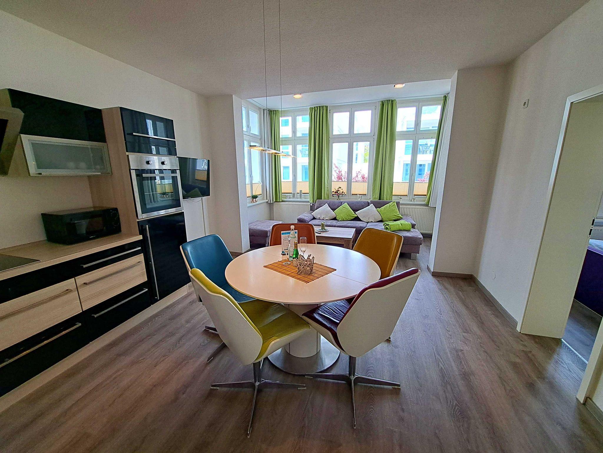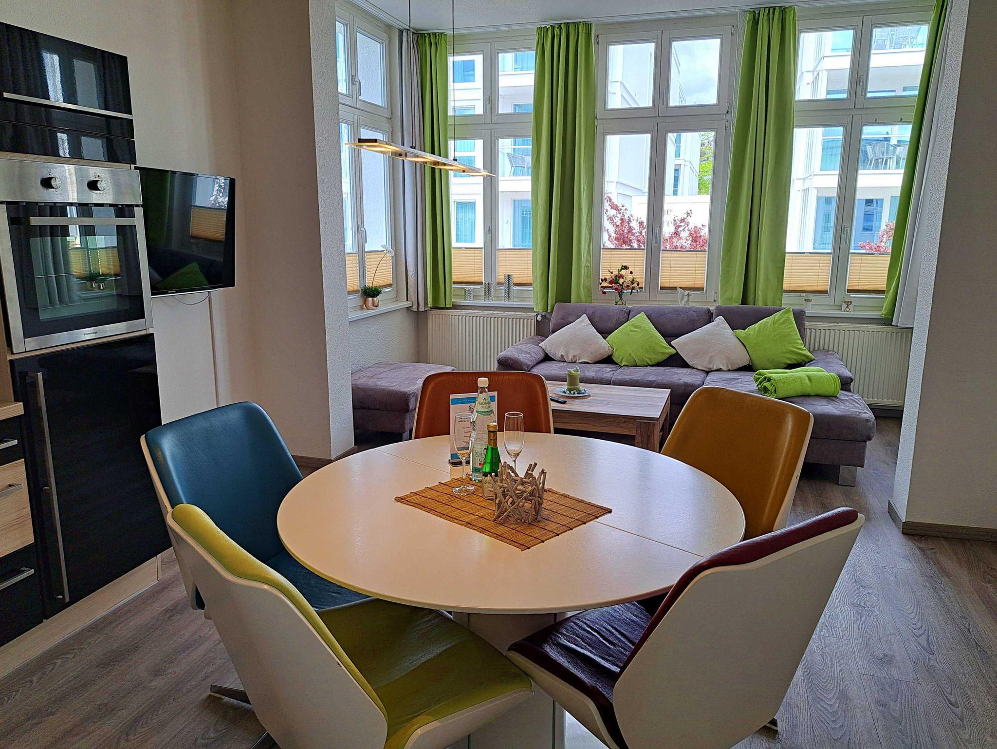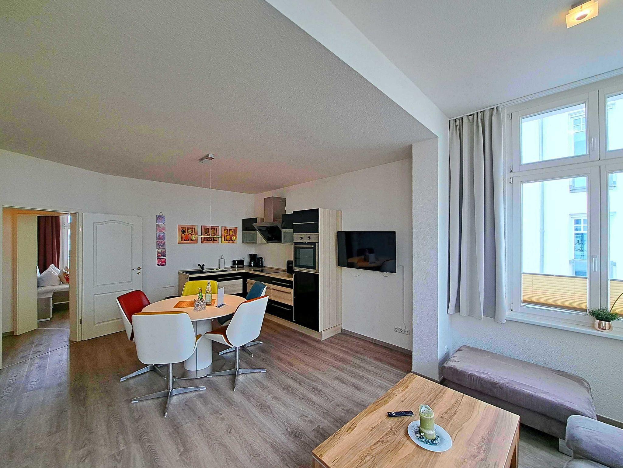 Der helle Wohnbereich ist mit einer komfortablen Couch, einem Flachbild-TV und seitlichem Ostseeblick ausgestattet - perfekt für entspannte Abende. Die offene Küchenzeile mit Essbereich ist voll ausgestattet und lädt dazu ein, kulinarische Köstlichkeiten selbst zuzubereiten.