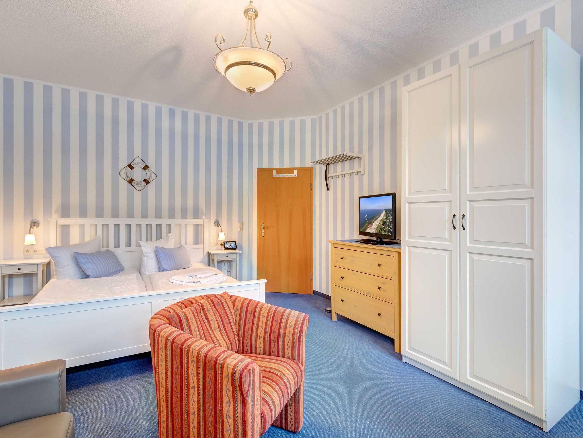 Doppelzimmer zur Landseite mit Doppelbett, Couchgruppe, Kühlmöglichkeit, Kabel-TV, Tablet-PC, Bad mit Fenster.