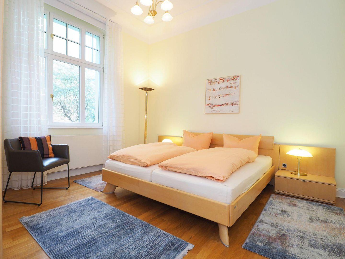 Die beiden Schlafzimmer bieten mit hochwertigen Doppelbetten, Kleiderschränken, Verdunklungsmöglichkeiten und verstellbaren Lattenrosten beste Voraussetzungen für erholsame Nächte. Zwei moderne Bäder – eines mit bodentiefer Dusche, das zweite mit Dusche und Badewanne – sorgen für zusätzlichen Komfort. Zur weiteren Ausstattung gehören eine Waschmaschine und ein Trockner zur Eigennutzung, sodass auch längere Aufenthalte problemlos möglich sind.