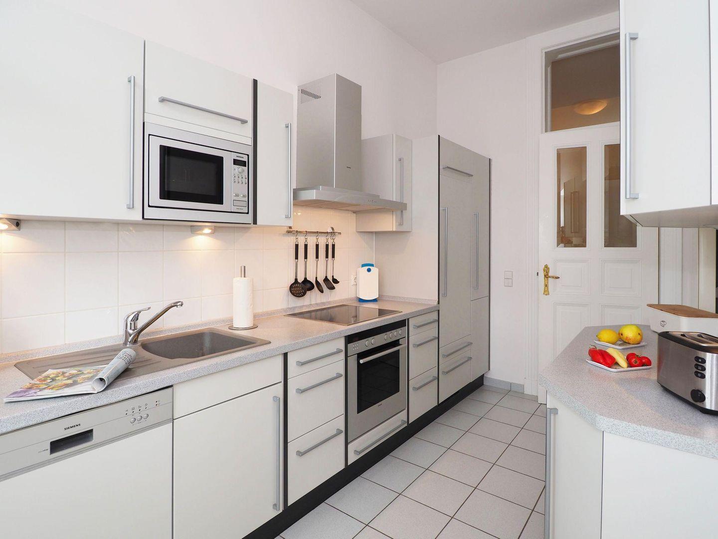 Die Küche der Ferienwohnung ist separat vom Wohnbereich angelegt und mit modernen Geräten wie Backofen, Ceranfeld, Spülmaschine, Mikrowelle und einem Kühlschrank mit Gefrierfach ausgestattet. Angrenzend befindet sich das elegante Esszimmer mit großem Tisch für bis zu sechs Personen. Von der Küche aus gelangen Sie direkt auf den möblierten Balkon mit Südausrichtung, der bei Sonne zum Frühstücken oder Verweilen einlädt. Beide Wohnbereiche sind mit komfortablen Sitzgelegenheiten und jeweils einem TV-Gerät ausgestattet – einer der Wohnräume verfügt zudem über eine bequeme Schlafcouch für zwei weitere Gäste.