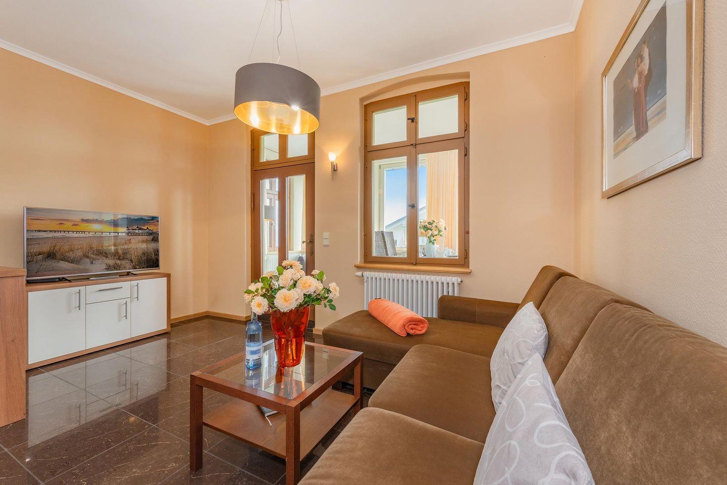 Erleben Sie unvergessliche Urlaubstage mit einem atemberaubenden Ostseeblick in der exklusiven Ferienwohnung "Villa Bella 06", gelegen im Herzen des traditionsreichen Seebads Ahlbeck auf Usedom. Diese 49 Quadratmeter große, im zweiten Obergeschoss der stilvollen Villa befindliche Ferienwohnung, ist der perfekte Ort für Paare, die einen romantischen Urlaub direkt an der Ostseeküste verbringen möchten. Das helle und einladende Wohnzimmer bildet das Herzstück der Wohnung. Hier verschmelzen moderner Komfort und stilvolles Design zu einer harmonischen Einheit. Die offene Küchenzeile mit hochwertigen Geräten wie Backofen, Ceranfeld und Spülmaschine ermöglicht es Ihnen, auch im Urlaub kulinarische Köstlichkeiten zuzubereiten. Ein besonderes Highlight ist die Loggia, die direkt vom Wohnzimmer zugänglich ist und einen unvergleichlichen Panoramablick auf die Ostsee bietet. Hier können Sie nicht nur Ihr Frühstück in maritimer Atmosphäre genießen, sondern auch entspannte Abende bei Sonnenuntergang verbringen. Das Wohnzimmer ist zudem mit einer bequemen Schlafcouch ausgestattet, die bei Bedarf eine zusätzliche Schlafgelegenheit für eine Person bietet, sowie einem modernen TV-Gerät.
