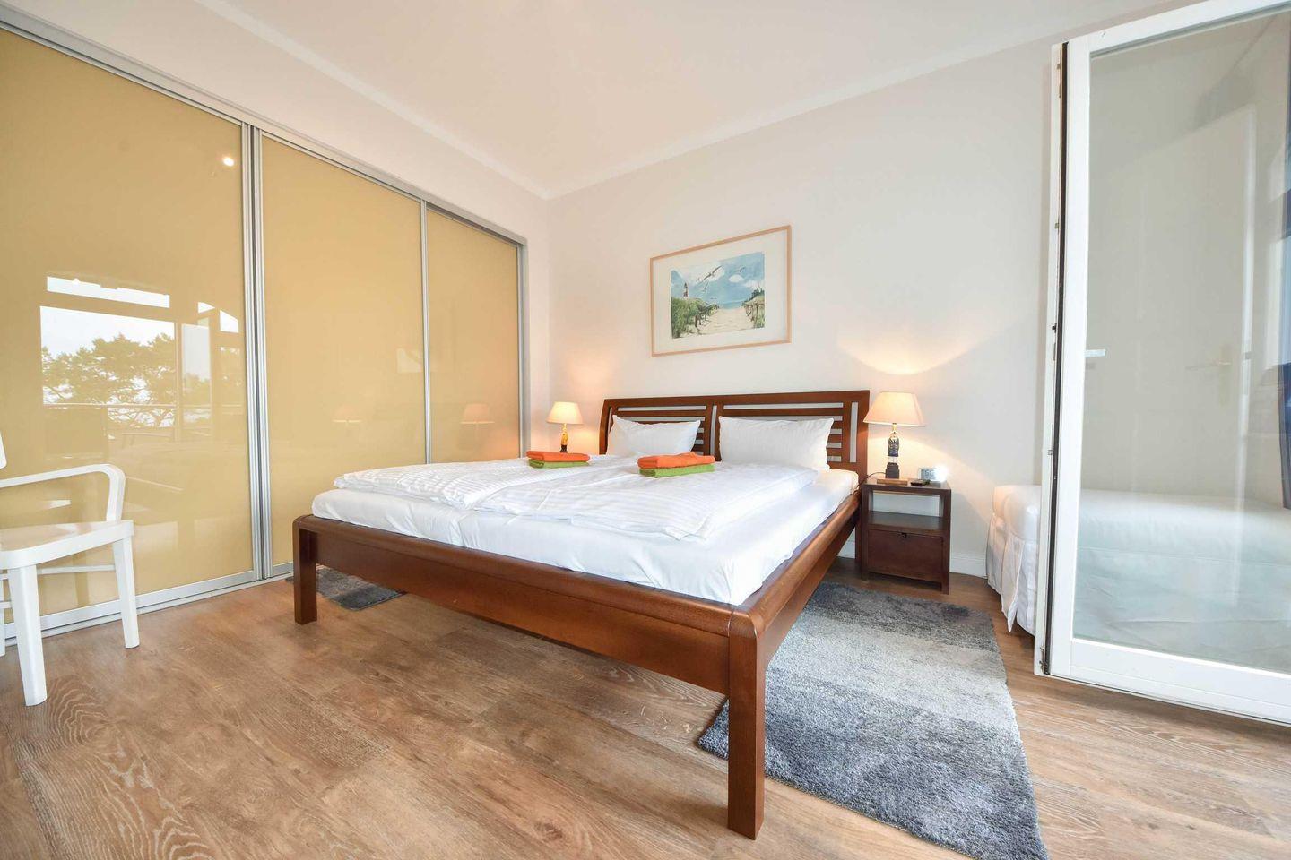 Im separaten Schlafzimmer finden Sie ein großes Doppelbett mit verstellbaren Lattenrosten für erholsamen Schlaf, einen geräumigen Kleiderschrank sowie Verdunklungsmöglichkeiten für ungestörte Ruhe. Für ein Kind steht ein praktischer Schlafsessel zur Verfügung, der sich bei Bedarf einfach ausklappen lässt. Ein weiteres Highlight ist der möblierte Balkon mit traumhaftem Ostseeblick, der direkt vom Schlafzimmer aus zugänglich ist – hier erleben Sie entspannte Stunden mit dem Blick auf die weite See. Auch ein zweites TV-Gerät steht im Schlafzimmer zur Verfügung.