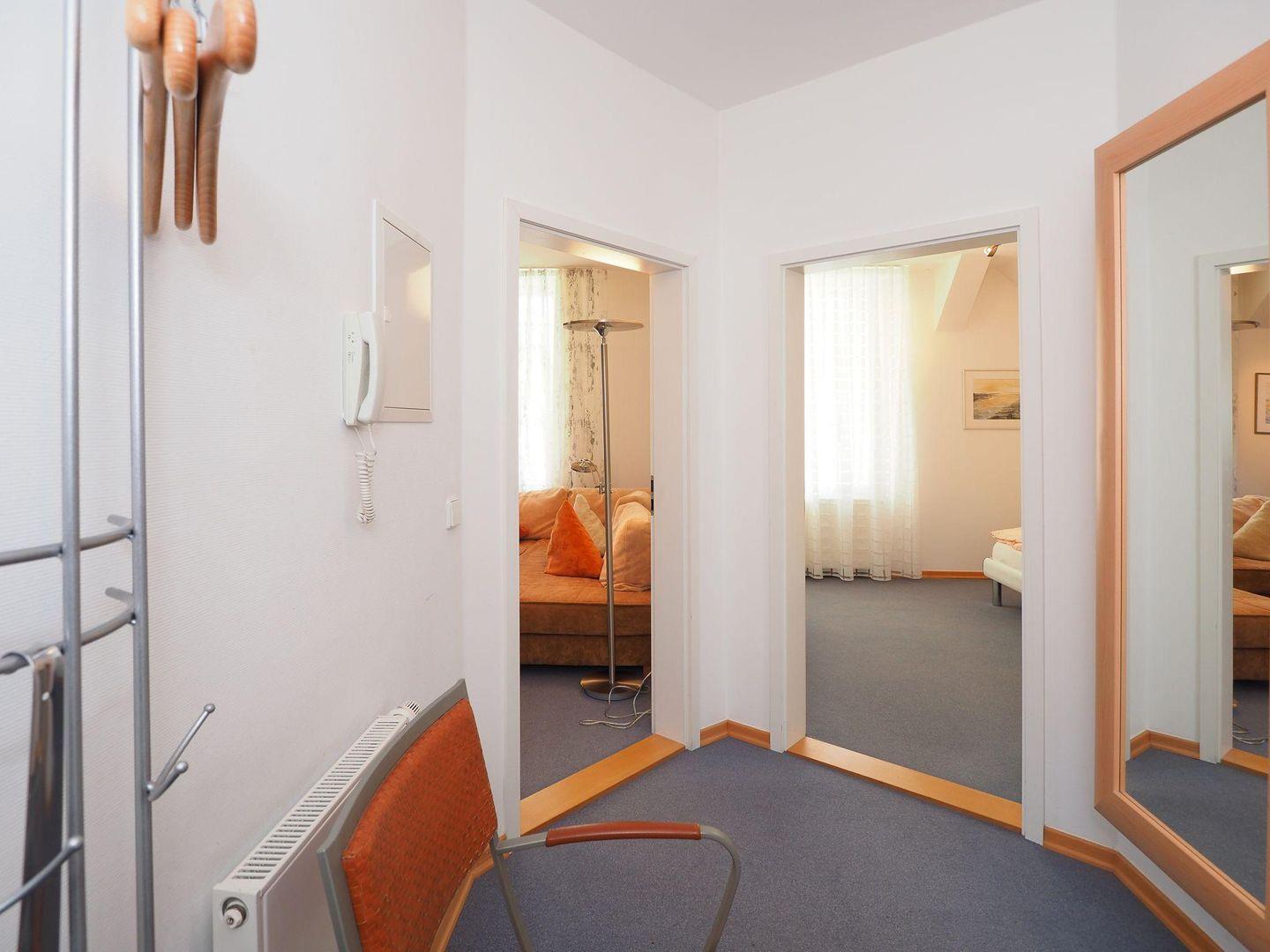 Zur Wohnung gehört ein eigener Pkw-Stellplatz auf dem Grundstück sowie ein ebenerdig erreichbarer, abschließbarer Fahrradraum. Das kostenfreie WLAN ermöglicht Ihnen auch im Urlaub eine flexible Internetnutzung. Ein besonderes Extra ist die gemeinschaftlich nutzbare Sauna im Keller der Villa, die Ihnen gegen eine einmalige Gebühr von 45 Euro pro Aufenthalt zur Verfügung steht – ideal zum Entspannen nach einem erlebnisreichen Tag. Ein Aufzug im Haus erleichtert das Erreichen der Wohnung zusätzlich. Die Ferienwohnung wurde vom Deutschen Tourismusverband mit 4 Sternen ausgezeichnet und bietet Ihnen ein hochwertiges Urlaubsdomizil direkt am Meer.