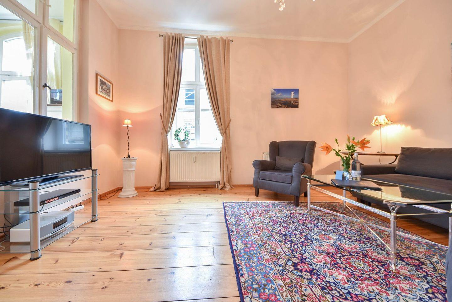 Im geräumigen Wohnzimmer erwartet Sie eine gemütliche Couch mit Schlaffunktion (Liegefläche 200?cm x 140?cm), die sich ideal für die Aufbettung von zwei weiteren Gästen eignet. Ein TV-Gerät und ein DVD-Player sorgen für entspannte Abende nach einem Tag am Meer. Der angrenzende möblierte Balkon lädt dazu ein, die frische Ostseeluft zu genießen – sei es beim Frühstück in der Morgensonne oder bei einem Glas Wein am Abend. Das Schlafzimmer ist mit einem komfortablen Doppelbett (200?cm x 180?cm), verstellbaren Lattenrosten und einem geräumigen Kleiderschrank ausgestattet und bietet beste Voraussetzungen für erholsamen Schlaf. Das modern geflieste Bad verfügt über eine Dusche, ein Waschbecken und ein WC.
