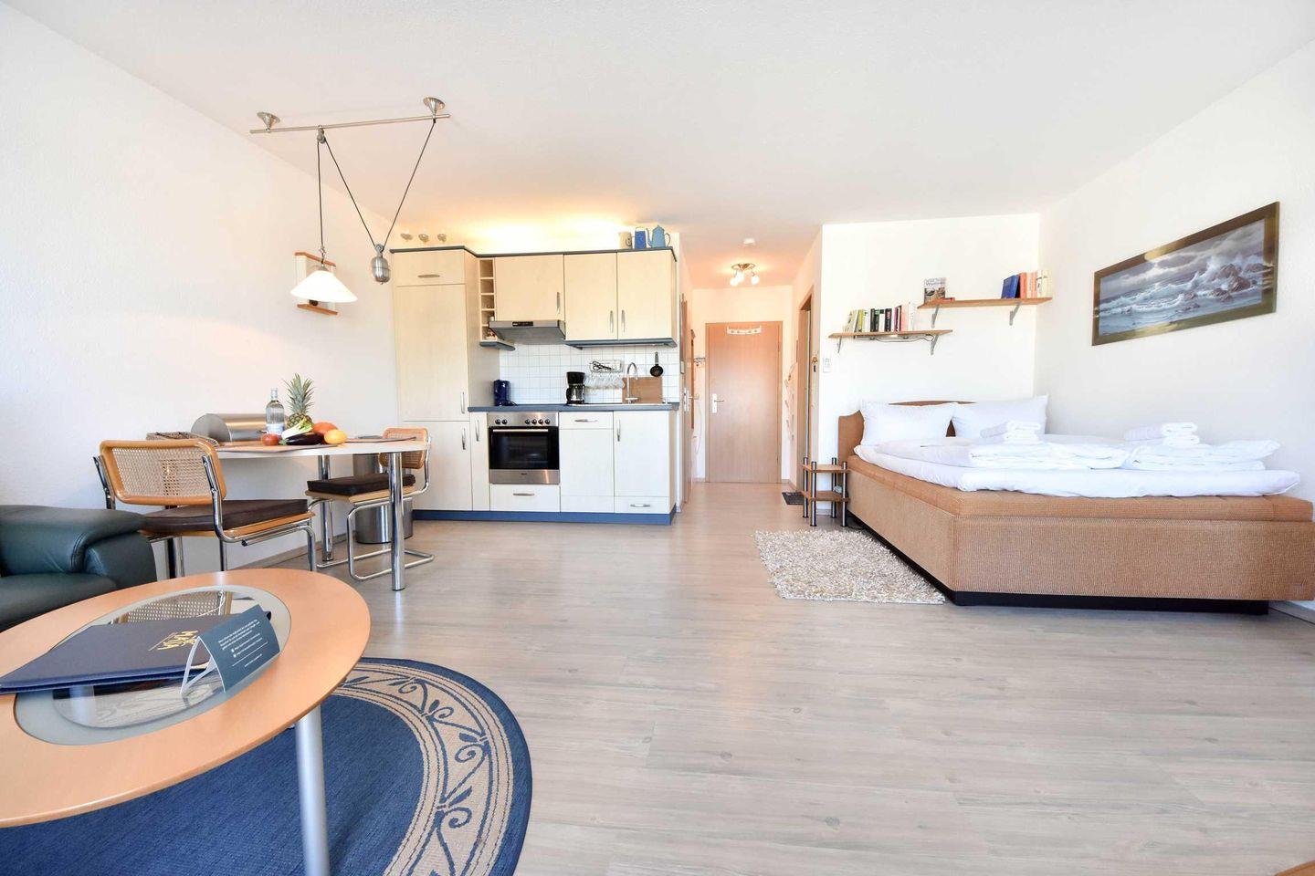 Diese hochwertig und modern eingerichtete Einraum-Ferienwohnung begrüßt Sie in zentraler Lage im Seebad Ahlbeck. In der zweiten Etage genießen Sie aus allen Bereichen der Wohnung einen schönen Meerblick. Ideal für 2 Personen verfügt die Wohnung über ein Doppelbett und einen angrenzenden Wohnraum. Die Küche ist offen, ein Essplatz für zwei Personen ist vorhanden. Bei der Einrichtung wurde der Fokus auf Ihre Erholung gelegt. Die komfortable Ledercouch, der neue Flachbild-TV und die angenehme Fußbodenheizung in der gesamten Wohnung unterstreichen dies. Zusätzlich zur Heizung ist eine Klimaanlange sowohl zum Wärmen, als auch zum Kühlen vorhanden.