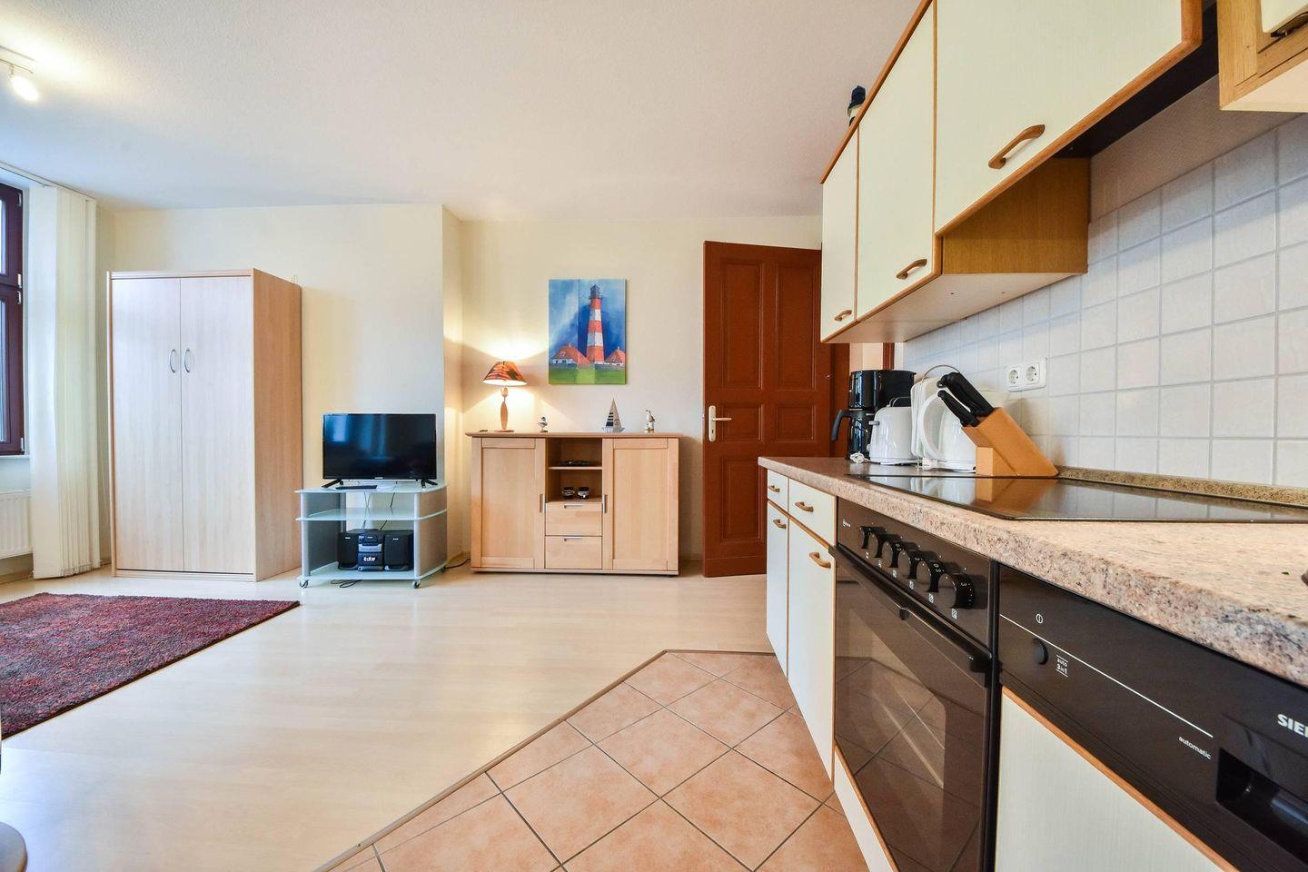 Nur wenige Schritte von der Promenade entfernt erwartet Sie diese Ferienwohnung im Erdgeschoss der Villa Medici. Die Wohnung verfügt über einen offenen Wohn-Essbereich mit hochwertiger Couchlandschaft, Esstisch, Küchenzeile und Flachbild-TV. Ein Einzel-Wandbett kann herunter geklappt werden und bietet so einer dritten Person eine Schlafgelegenheit, während das Bett tagsüber wieder verstaut werden kann. Die Küche ist mit Backofen, Geschirrspüler sowie Ceranfeld und Mikrowelle ausgestattet. Das Schlafzimmer mit großzügigem Doppelbett und zweitem TV bietet zusätzlich Zugang zur Terrasse. In den Sommermonaten steht Ihnen auf der Terrasse ein eigener Strandkorb zur Verfügung. Das Bad ist mit einer Dusche sowie einem Waschtisch ausgestattet. Ein abschließbarer Fahrradunterstand ist vorhanden. Ihren PKW parken Sie kostenfrei auf dem zugeordneten Stellplatz am Haus. Die WLAN-Nutzung ist kostenfrei. Besonders familienfreundlich sind der bereits in der Wohnung vorhandene Hochstuhl, sowie das Baby-Reisebett inklusive Matratze aber ohne Wäsche.