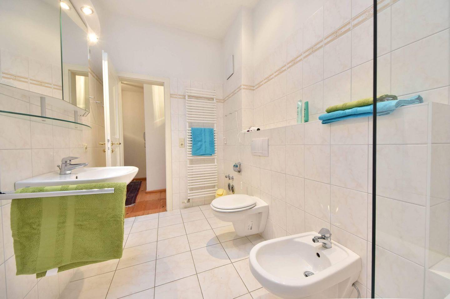 Ein großes Badezimmer mit Badewanne und Duschabtrennung sowie Toilette und Bidet rundet das Angebot ab. Für unsere kleinen Gäste stehen ein Kinderreisebett (ohne Wäsche) und ein Kinderhochstuhl bereit.