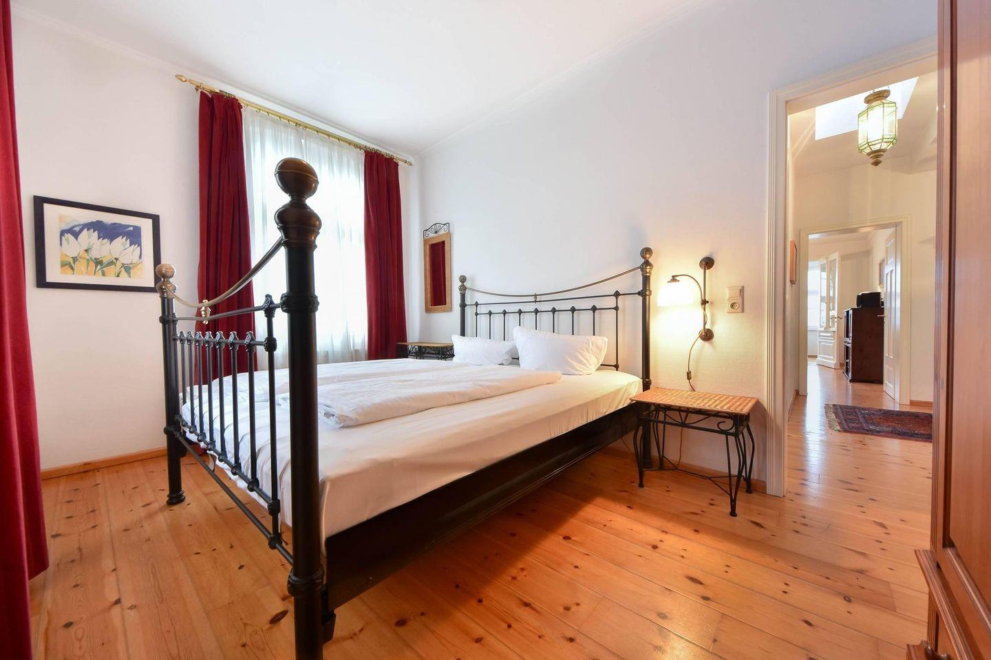 Die Wohnung besitzt zwei Schlafzimmer. Das größere der beiden Schlafzimmer verfügt über ein Doppelbett und einen massiven Kleiderschrank. Im kleineren Schlafzimmer befinden sich zwei Einzelbetten und der Zugang zum West-Balkon. Durch die Häuser können Sie hier einen Blick auf die Ostsee erhaschen und sonnige Abende genießen.