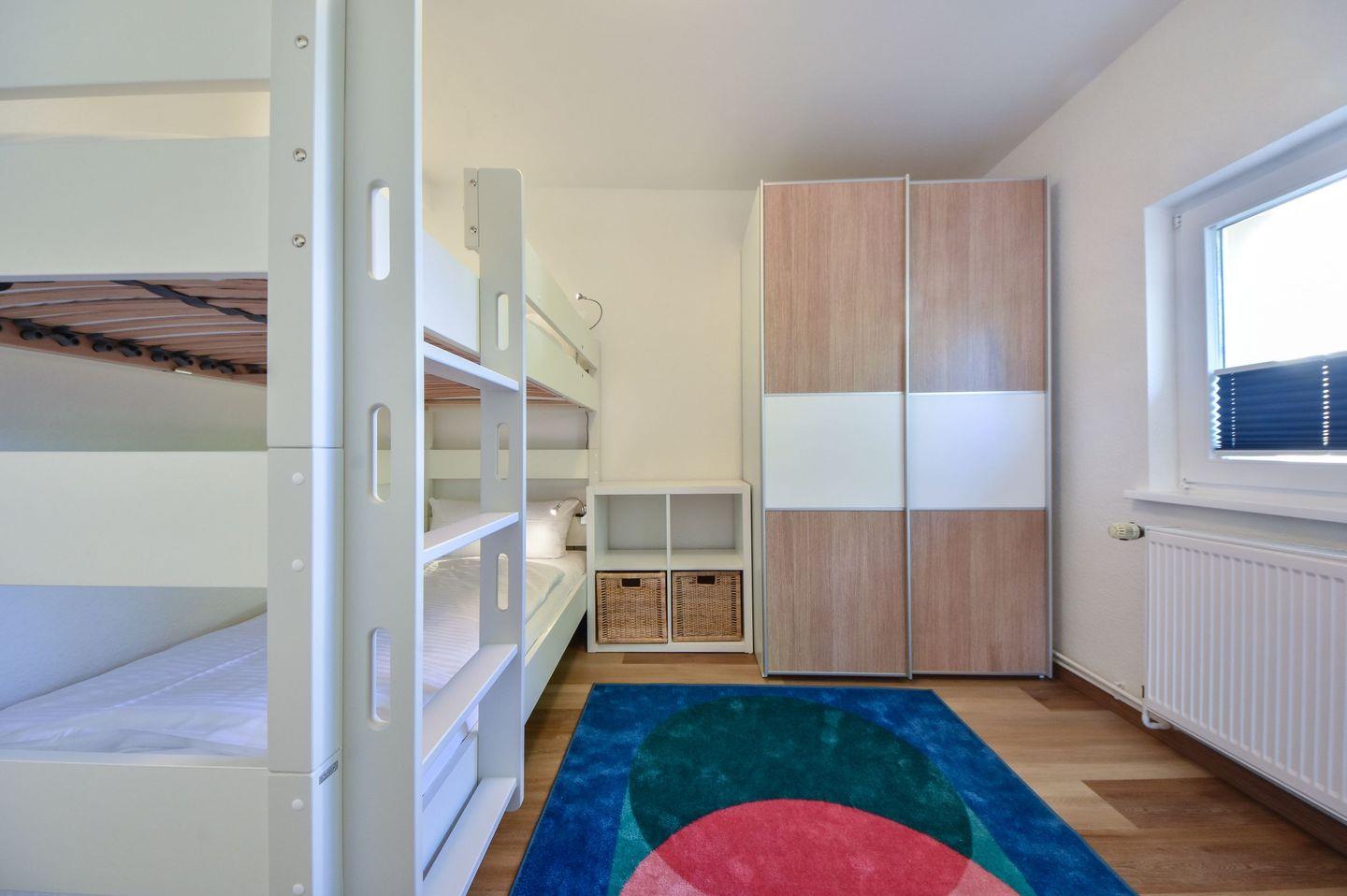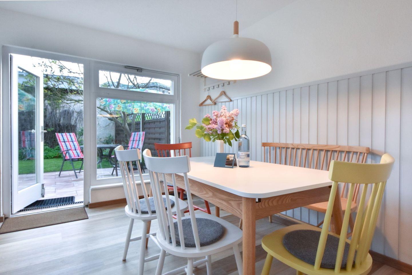 Usedom To Hus - hier ist der Name Programm, denn schnell werden Sie sich in diesem Ferienhaus wohlfühlen. Bei der Renovierung im Jahr 2021 wurde viel Wert auf eine stimmige Einrichtung gelegt; moderne Elemente verbinden sich mit den hochwertigen Echtholzmöbeln zu einem passenden Gesamtkonzept. Das Ferienhaus ist freistehend auf dem umzäunten Grundstück eines historischen Mehrfamilienhauses und bietet viel Platz und Privatsphäre für bis zu vier Personen. Die 78 Quadratmeter Wohnfläche verteilen sich geschickt auf zwei Etagen. Im unteren Bereich des Hauses befindet sich der große, helle Eingangsbereich mit großzügigem Esstisch, sowie der offen gestaltete Wohn- und Küchenbereich. Dank der großen Fensterfronten zum Garten gelangt viel Licht in den Raum. Die Küche ist komplett ausgestattet und verfügt über eine Mikrowelle, Geschirrspüler, Backofen und Ceranfeld. Alle Dinge des täglichen Bedarfs wie Kaffeemaschine und Toaster sind natürlich vorhanden. Der TV samt Soundbar ist geschickt angebracht und kann zur Couch ausgerichtet werden. Vom Wohnraum erreichen Sie eine kleine Terrasse. Die große Terrasse mit Sonnenschirm und Gartenmöbeln befindet sich vor dem Wohnungseingang. WLAN ist kostenfrei nutzbar. Ebenfalls zur ebenen Erde befindet sich das große Duschbad mit bodentiefer Dusche und Tageslicht. Über eine schmale Treppe gelangen Sie in die obere Etage, die die beiden Schlafzimmer beherbergt. Ein Schlafzimmer verfügt über ein Doppelbett, das zweite Schlafzimmer ist mit einem Doppelstockbett eingerichtet und dient idealerweise als Kinderzimmer. Das Bett besitzt Standardmaße (je 200cm x 90cm) und ist belastbar, sodass auch erwachsene Personen hier übernachten könnten. Beide Zimmer können mit Plissees abgedunkelt werden und verfügen über Stauraum für Ihre Garderobe. Für kleine Gäste steht eine Kinderausstattung mit Trip Trap Kinderstuhl oder alternativ Antilop-Hochstuhl, Kinderreisebett (ohne Wäsche aber mit Matratze), Nachtlicht, Wickelauflage und Babybadewanne zur Verfügung. Ein PKW-Stellplatz am Haus ist für die Wohnung reserviert. Sollten Sie Ihre eigenen Räder mitbringen, so können Sie diese in einem abschließbaren Fahrradschuppen unterstellen.