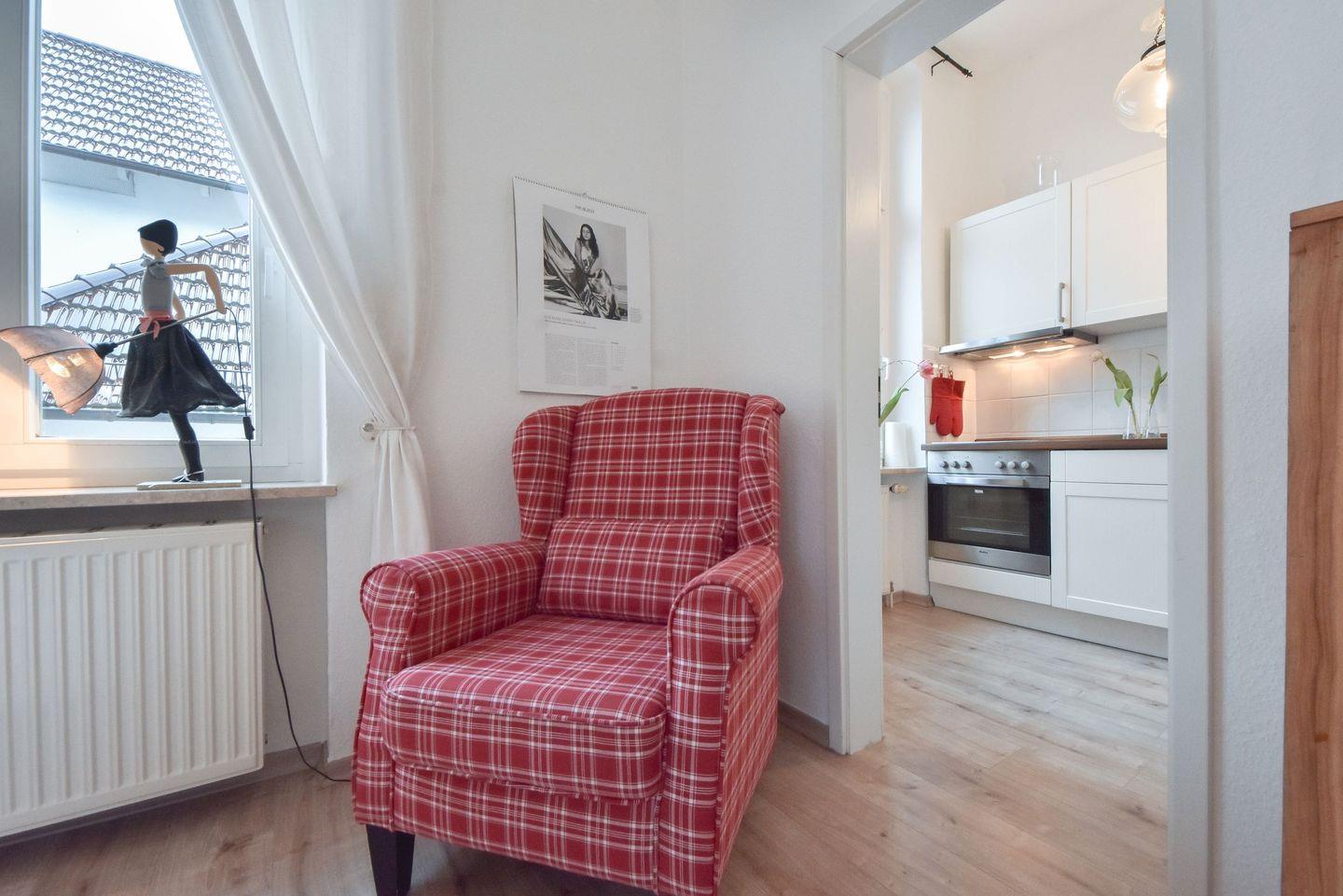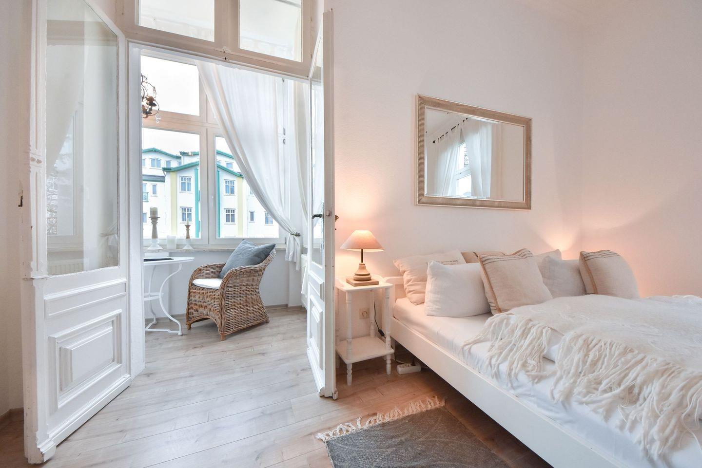 Helle Cremetöne und eine angenehme Atmosphäre erwarten Sie in dieser Ferienwohnung, in der ersten Etage der historischen Villa Schloss Hohenzollern. Das lichtdurchflutete Einraum-Appartement befindet sich in bester Lage im Seebad Ahlbeck und bietet auf etwa 33 Quadratmetern einen besonderen Wohlfühl-Faktor. Schnell werden Sie sich wie Zuhause fühlen und bemerken, wie viel Liebe in die Ausstattung und die Details der Wohnung geflossen sind. Der offen gestaltete Schlafraum verfügt über ein großes Doppelbett (1,90m x 2,00m) sowie einen Flachbild-TV, DVD-Player und Radio. Die helle Loggia schließt sich an und bietet einen schönen Blick entlang der Goethestraße. Die bequemen Sessel werden diesen Ort schnell zu Ihrem Lieblingsplatz in der Wohnung machen. Hier genießen Sie das morgendliche Frühstück oder lassen den Tag bei einem Glas Wein ausklingen. Eine kleine, separate Küche verfügt über alle Dinge des täglichen Bedarfs, sodass Sie sich während Ihres Aufenthaltes selbst versorgen können. Ein Geschirrspüler, Kühlschrank mit Gefrierfach, Ceranfeld und Backofen sind ebenso vorhanden wie Wasserkocher, Kaffeemaschine, eine French Press, Toaster und Wasserkocher. Ein kleines Duschbad mit Waschtisch und WC rundet das Angebot ab.