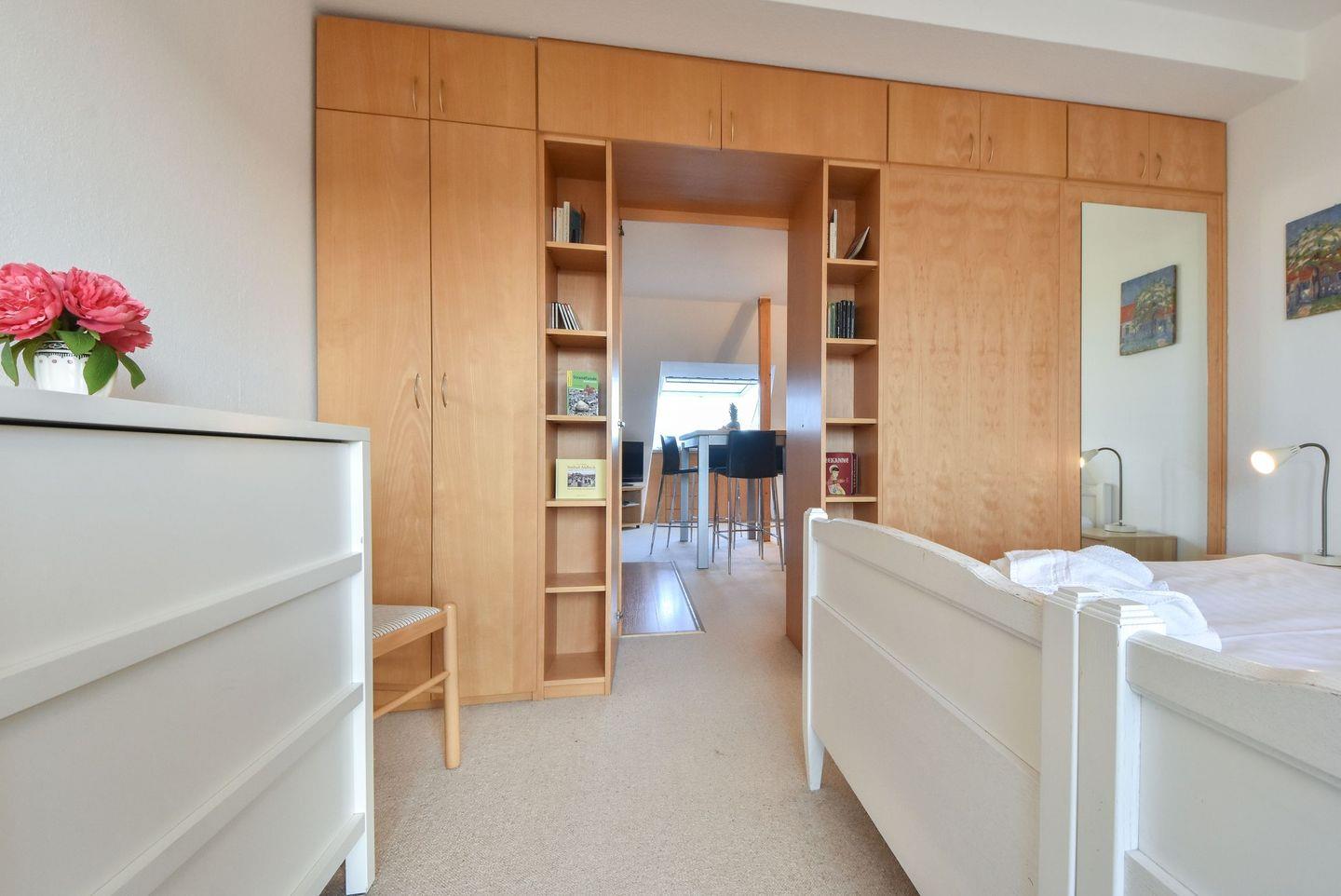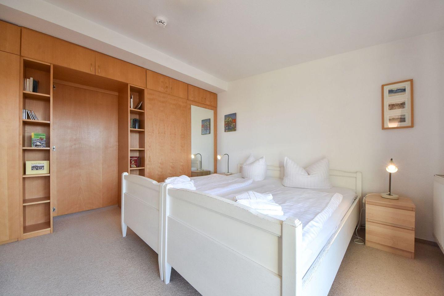 Das separate Schlafzimmer ist mit einem komfortablen Doppelbett und einem geräumigen Kleiderschrank ausgestattet und bietet mit seinem französischen Balkon einen beeindruckenden Panoramablick über Ahlbeck bis hin zur nahen Ostsee. Hier genießen Sie besondere Momente, sei es bei Sonnenaufgang oder unter dem klaren Sternenhimmel der Insel. Das Tageslichtbad ist ein weiteres Highlight der Wohnung: Es verfügt über eine Dusche, eine Badewanne sowie WC und Waschbecken – ideal, um den Tag entspannt zu beginnen oder gemütlich ausklingen zu lassen.