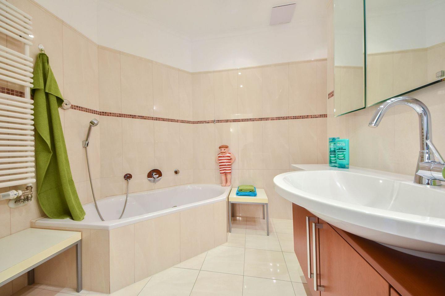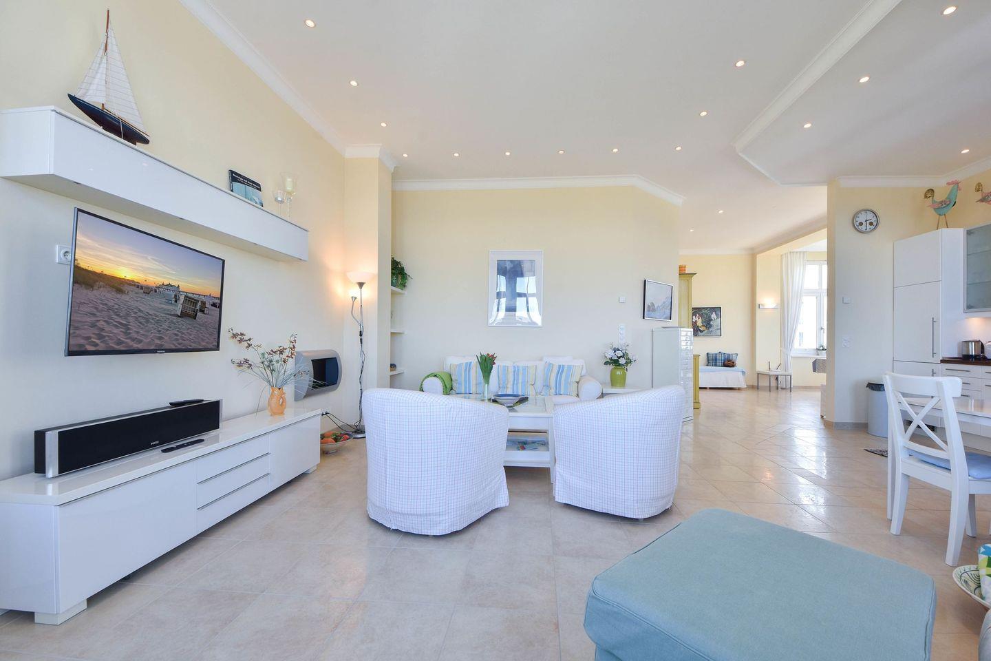 Im hell und freundlich eingerichteten Wohnbereich werden Sie sicher die meiste Zeit verbringen. Der Wohnbereich ist ausgestattet mit einem Sofa, drei Sesseln und einem Flachbild-Fernseher. Entspannen Sie mit einem Buch, lassen Sie bei geöffnetem Fenster das Meeresrauschen auf sich wirken oder genießen Sie die fantastische Aussicht auf die Ostsee und ihre Promenade. Anliegend finden Sie die vollwertig ausgestattete, offene Küche mit Mikrowelle, Kühl- und Gefrierschrank sowie einem Vier-Platten-Herd. Mit der ganzen Familie lässt es sich hervorragend am großen Esstisch in der Loggia dinieren. Beide Schlafzimmer sind mit je einem Doppelbett (Liegefläche 1,80 x 2,00 Meter), Nachttischen und einem Kleiderschrank eingerichtet. Eines der Schlafzimmer verfügt zusätzlich über einen kleinen TV. Sollten Sie sich in Ihrer morgendlichen Routine lieber aufteilen wollen, so ist dies dank des zweites Bades in der Wohnung möglich. Beide Bäder sind ausgestattet mit einem WC, Waschtisch und einer ebenerdigen Dusche. Das größere Bad besitzt zudem eine Badewanne.