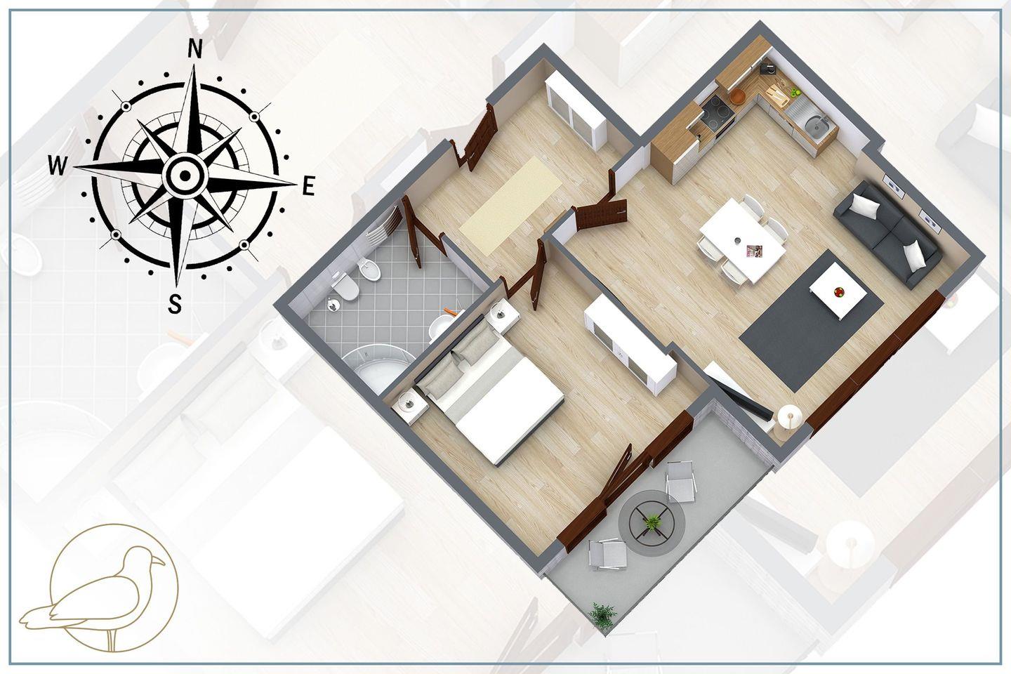 Auf einer Fläche von 57 Quadratmetern schafft dieses wunderschöne Urlaubsdomizil Platz für bis zu vier Personen. Die Wohnung befindet sich in der ersten Etage des Hauses.