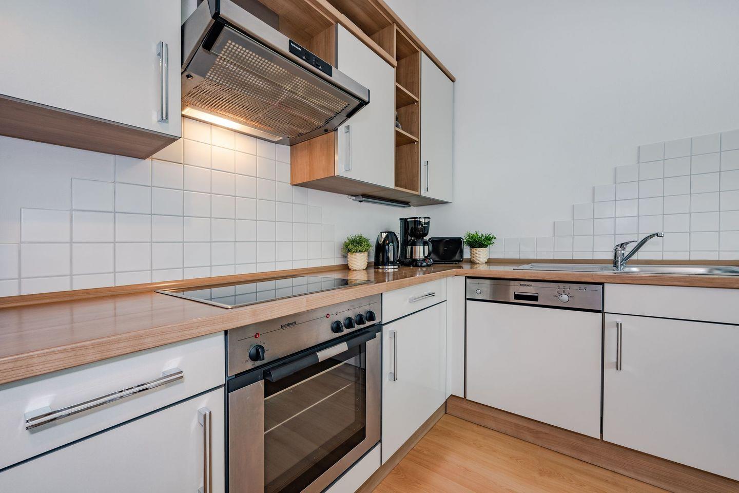 Das Wohnzimmer mit offener Küchenzeile ist in hellen und harmonischen Farbkombinationen stilvoll eingerichtet. So finden Sie dort die Schlafcouch für die dritte und vierte Person und einen ausreichend großen Flat-TV. Der Esstisch und die Küche fügen sich wunderbar in das Gesamtbild des Raumes. Liebevoll mit kleinen Details gestaltet und mit einer vollwertigen Küchenausstattung wird das Kochen auch im Urlaub zum Erlebnis. Umgeben von der einzigartigen Bäderarchitektur lässt es sich auf dem anliegenden Balkon wunderbar in ruhiger Lage ausspannen. Das Schlafzimmer ist mit einem bequemen Boxspringbett, einem platzbietenden Kleiderschrank und zudem mit einem weiteren Fernseher eingerichtet. Den Balkon erreichen Sie von diesem Raum aus. Das Badezimmer ist mit einem Waschbecken, WC und Dusche eingerichtet.