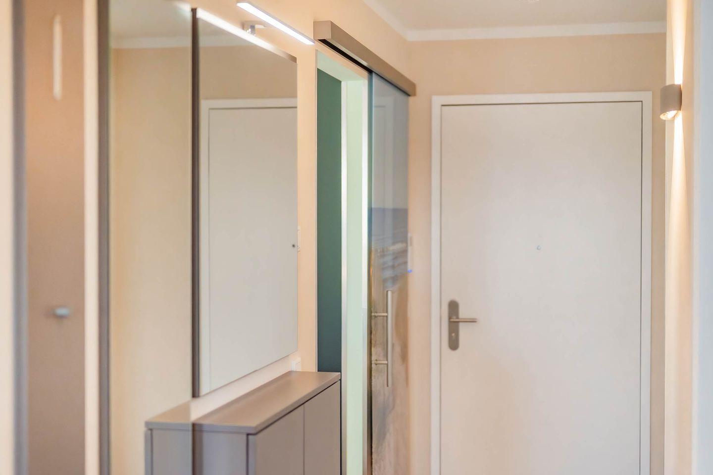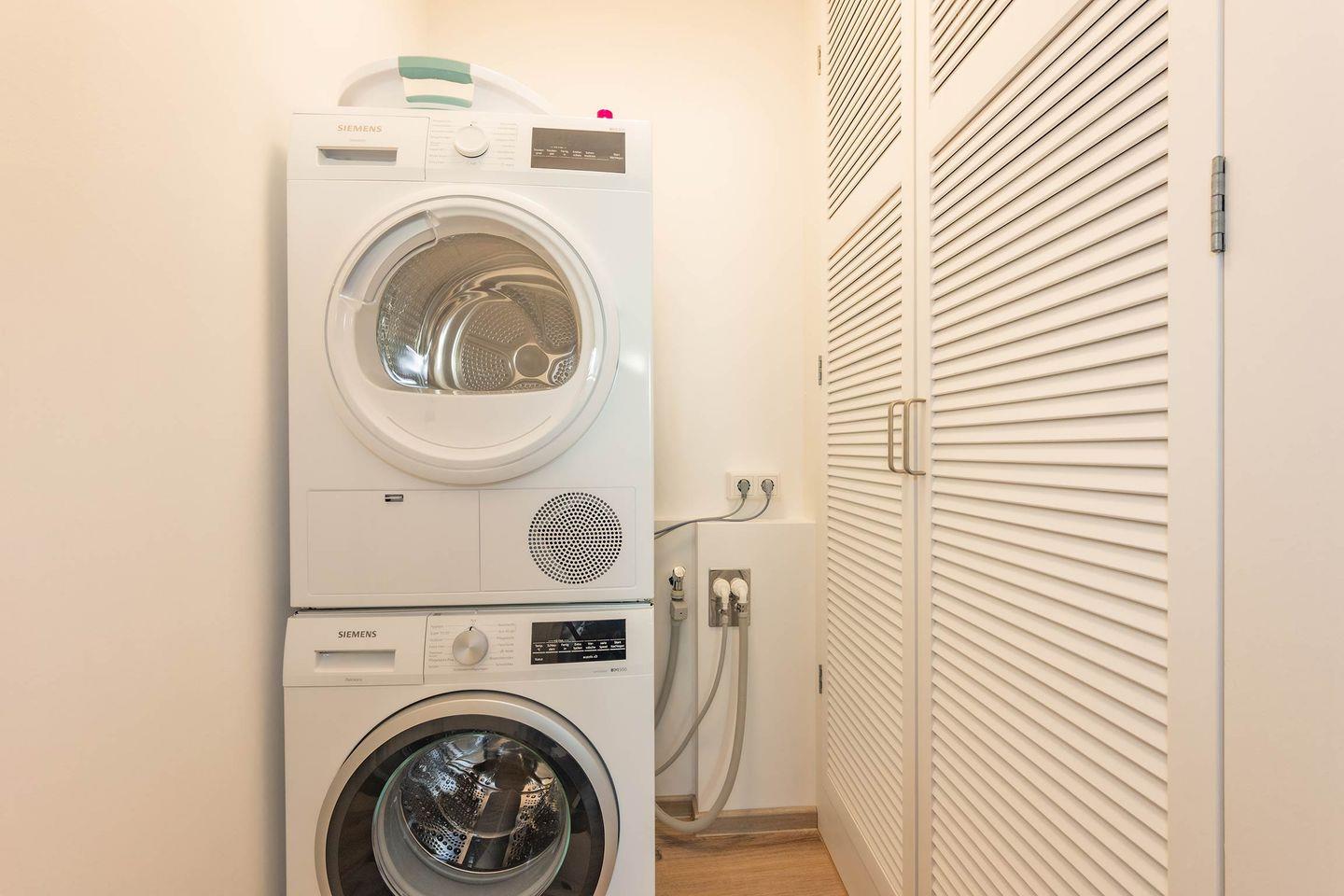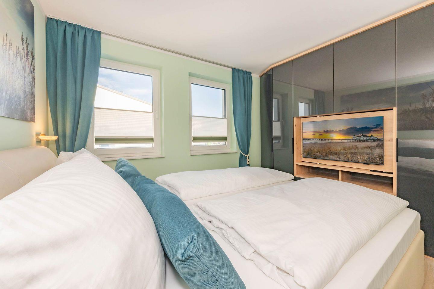 Das Schlafzimmer überzeugt mit einem komfortablen Doppelbett (1,80 m x 2,00 m), Verdunklungsmöglichkeiten, einem großen Kleiderschrank sowie einem eigenen TV. Die moderne, ruhige Gestaltung sorgt für erholsamen Schlaf und ein angenehmes Wohngefühl. Das stilvolle Badezimmer ist mit einer bodengleichen Dusche ausgestattet und bietet zeitgemäßen Komfort. Eine Waschmaschine und ein Trockner stehen im separaten Hauswirtschaftsraum zur Verfügung.