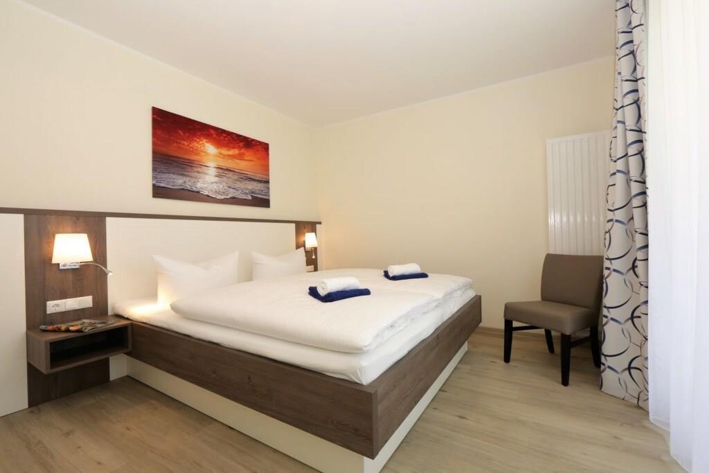 Der hell eingerichtete Wohnraum im Erdgeschoss verfügt über eine gemütliche Sitzecke (mit Schlaffunktion) und einen separaten Essplatz. Von der Terrasse haben Sie einen Blick auf die Dünen. Eine im Wohnbereich integrierte Küchenzeile mit Geschirrspüler, Backofen, Mikrowelle p.p lässt auch für den Hobbykoch keine Wünsche offen. Die zwei Schlafzimmer sind mit Doppelbett und genügend Schrankraum ausgestattet. Ein Duschbad sowie eine Terrasse runden diese Ferienwohnung ab. TV und Radio stehen zur Nutzung bereit. Der Pkw-Stellplatz befindet sich in der Tiefgarage und ist der Ferienwohnung zugeordnet. Fahrräder können im Keller untergestellt werden. Von Oktober bis März können Sie die Sauna zu bestimmten Zeiten nutzen.