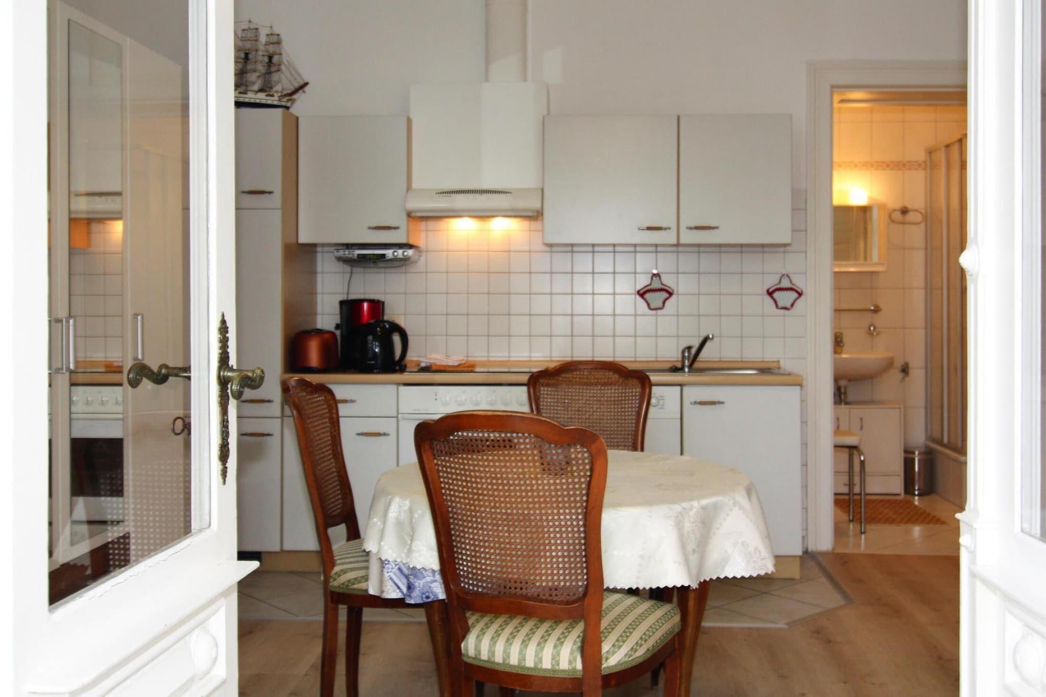 Fin leilighet i første etasje i en fullstendig restaurert villa med sentral beliggenhet. Den nydesignede strandpromenaden ligger i umiddelbar nærhet. Ahlbeck er stedet for alle som leter etter en rekke underholdning. Her kan du ikke bare spise godt og spasere langs den lange bulevarden, men også nyte en rekke kulturelle begivenheter. Hvis du vil være litt mer aktiv, kan du bruke naturen ved Østersjøen og Achterwasser til lange turer. Aktiviteter i nærheten: Verdt å se. Historiske Ahlbeck bryggen og de imponerende villaer i stil med klassisistisk spa arkitektur, som du finner langs dune veien som går parallelt med strandpromenaden ligger sentralt i de 3 keiserlige badene Ahlbeck, Heringsdorf no Bansin er det populære opplevelsesbassenget OstseeTherme, som tilbyr velvære og svømmeglede for store og små Ikke egnet for bevegelseshemmede