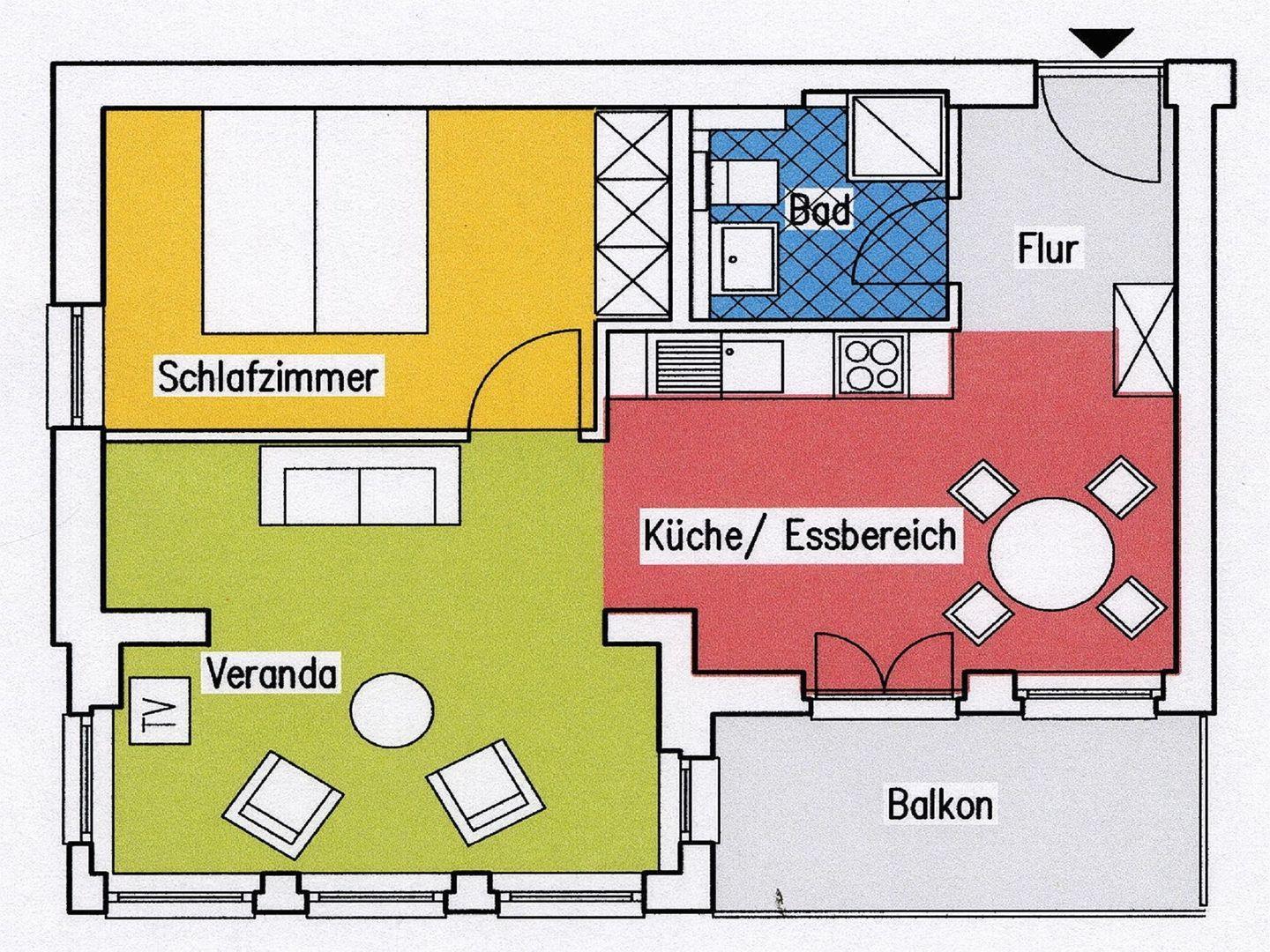 Die voll ausgestattete offene Küche mit Zugang zum Balkon lädt zum gemeinsamen Kochen und Essen ein. Im separaten Schlafzimmer erwartet Sie ein gemütliches Doppelbett ( 180 x 200 cm ) für erholsame Nächte. Das moderne Duschbad rundet das Angebot ab.