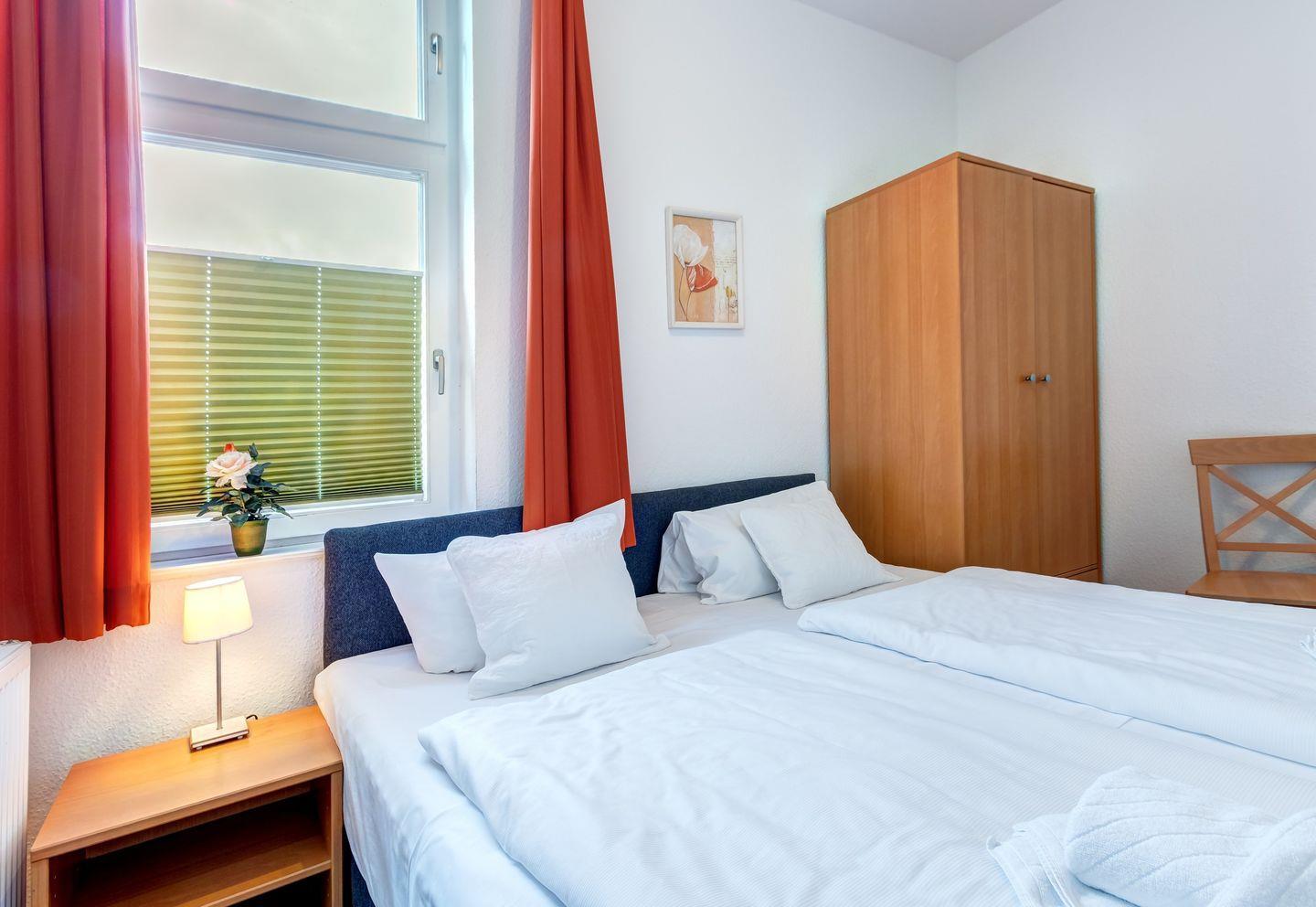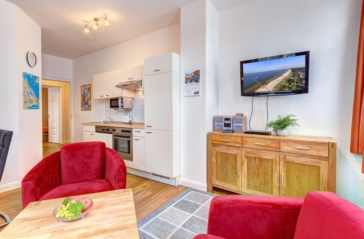 Die 60 m² große Wohnung im der Villa "Haus Meerblick" ist mit 4 DTV-Sternen zertifiziert und bietet ein großzügiges Wohnzimmer sowie zwei vollwertige Schlafzimmer mit Doppelbetten.