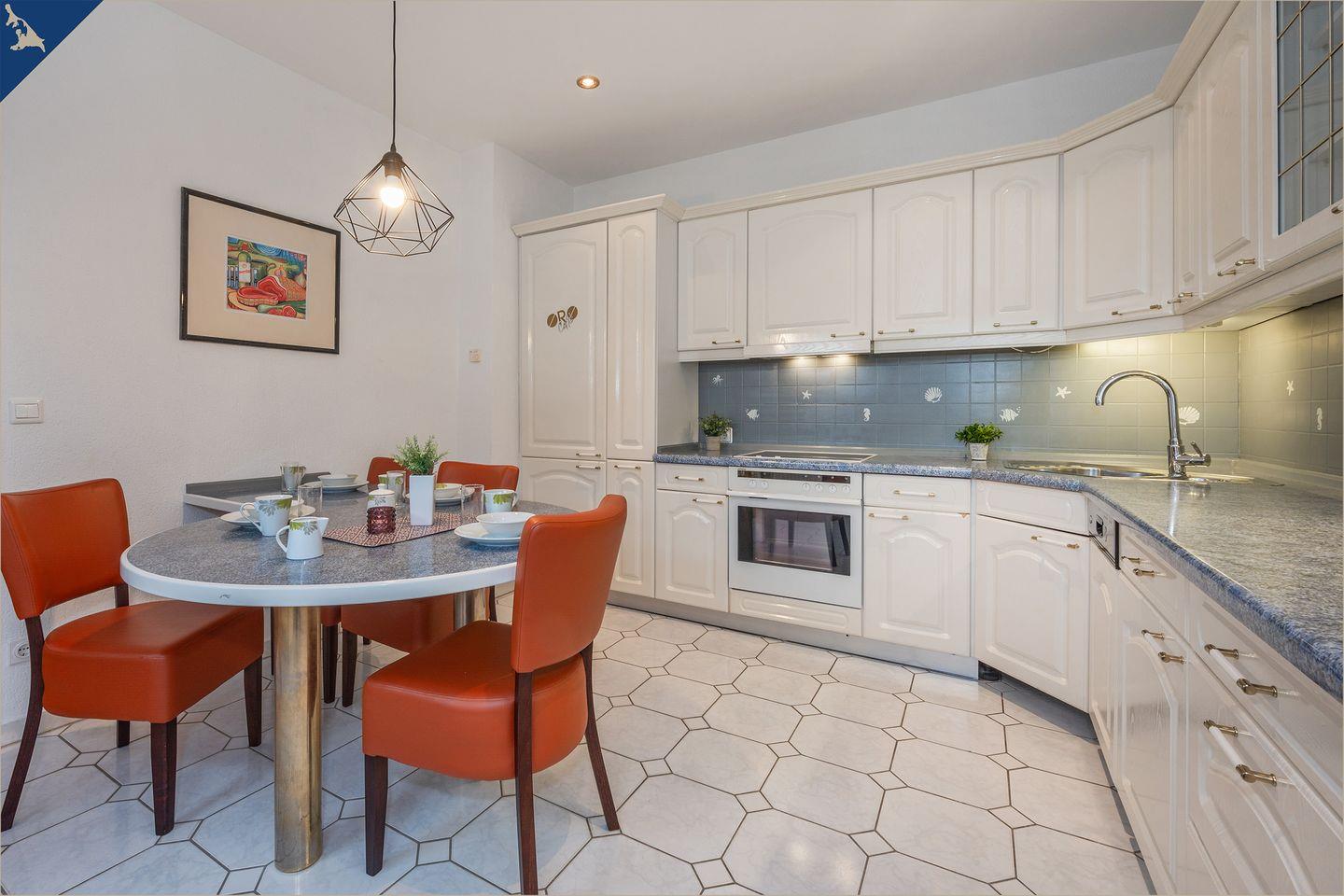Die offene Küche ist mit allem ausgestattet, was Sie brauchen: Spülmaschine, Backofen, Herd, Mikrowelle, Toaster, Kaffeemaschine, Wasserkocher und Gefrierfach. Ein Balkon sowie ein privater Garten mit Grillplatz und Gartenmöbeln bieten Ihnen zusätzlichen Freiraum im Grünen – ideal für laue Sommerabende oder ein Frühstück an der frischen Luft. WLAN, Waschmaschine, Ganzkörperspiegel, Rauchmelder sowie ein eigener Parkplatz auf dem abgeschlossenen Grundstück runden das Komfortangebot ab.