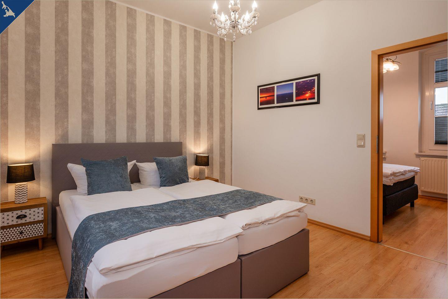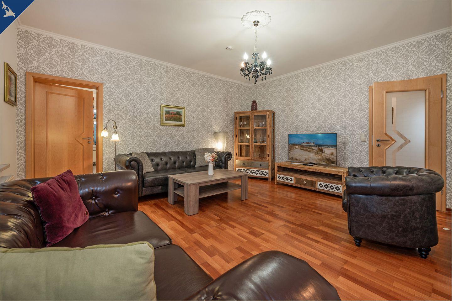 Diese moderne, ca. 120?m² große Ferienwohnung auf zwei Etagen bietet ausreichend Platz für bis zu 7 Personen – ideal für Familien oder Gruppen. Mit vier liebevoll eingerichteten Schlafzimmern, zwei voll ausgestatteten Badezimmern (inkl. Dusche und Badewanne) sowie einem großzügigen Wohnbereich erleben Sie Urlaubskomfort auf hohem Niveau. Der helle Wohnraum mit Sofaecke und TV lädt zum Entspannen ein, während der angrenzende Essbereich zu gemeinsamen Mahlzeiten einlädt.