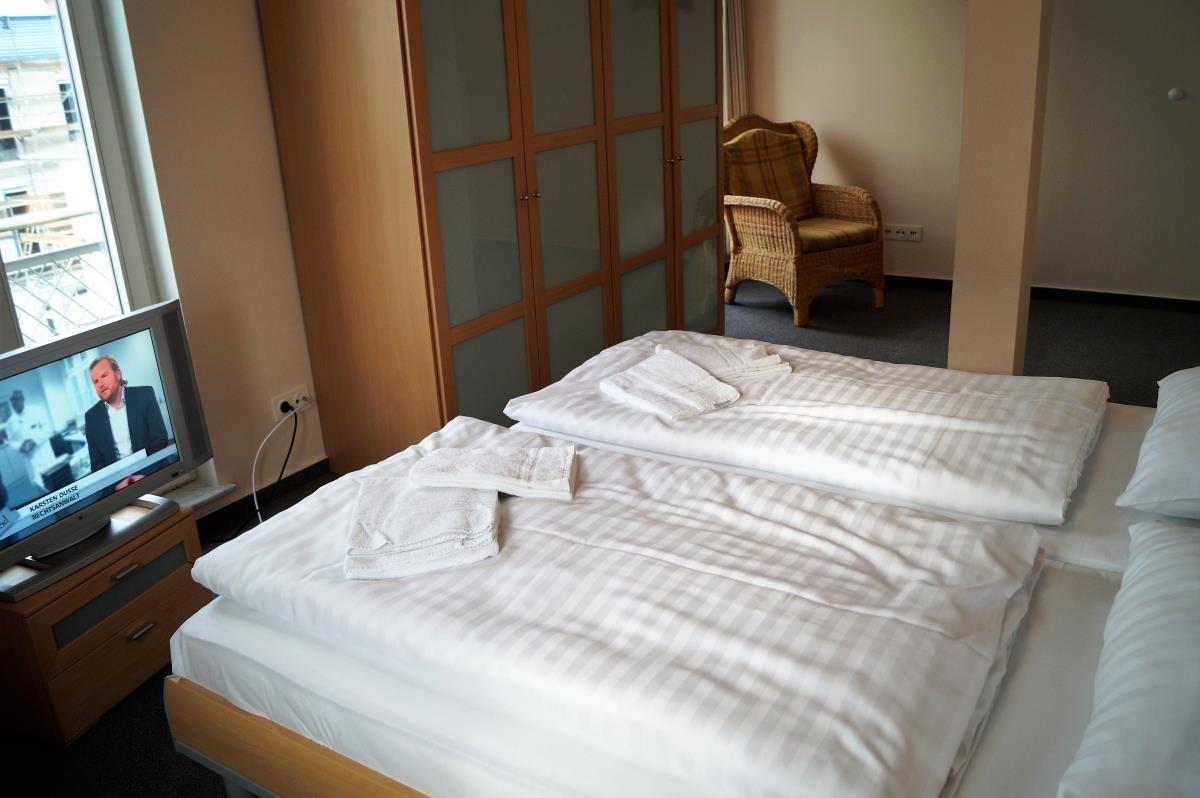 Es stehen zwei große und gleichwertige Schlafzimmer zur Verfügung, ausgestattet jeweils mit zwei Doppelbetten, je einem Kleiderschrank und Flachbild-TV. In Kombination mit den beiden Bädern ist diese Ferienwohnung somit auch hervorragend für vier Erwachsene geeignet. Zwei weitere Gäste können auf der Ausziehcouch im Wohnzimmer nächtigen.