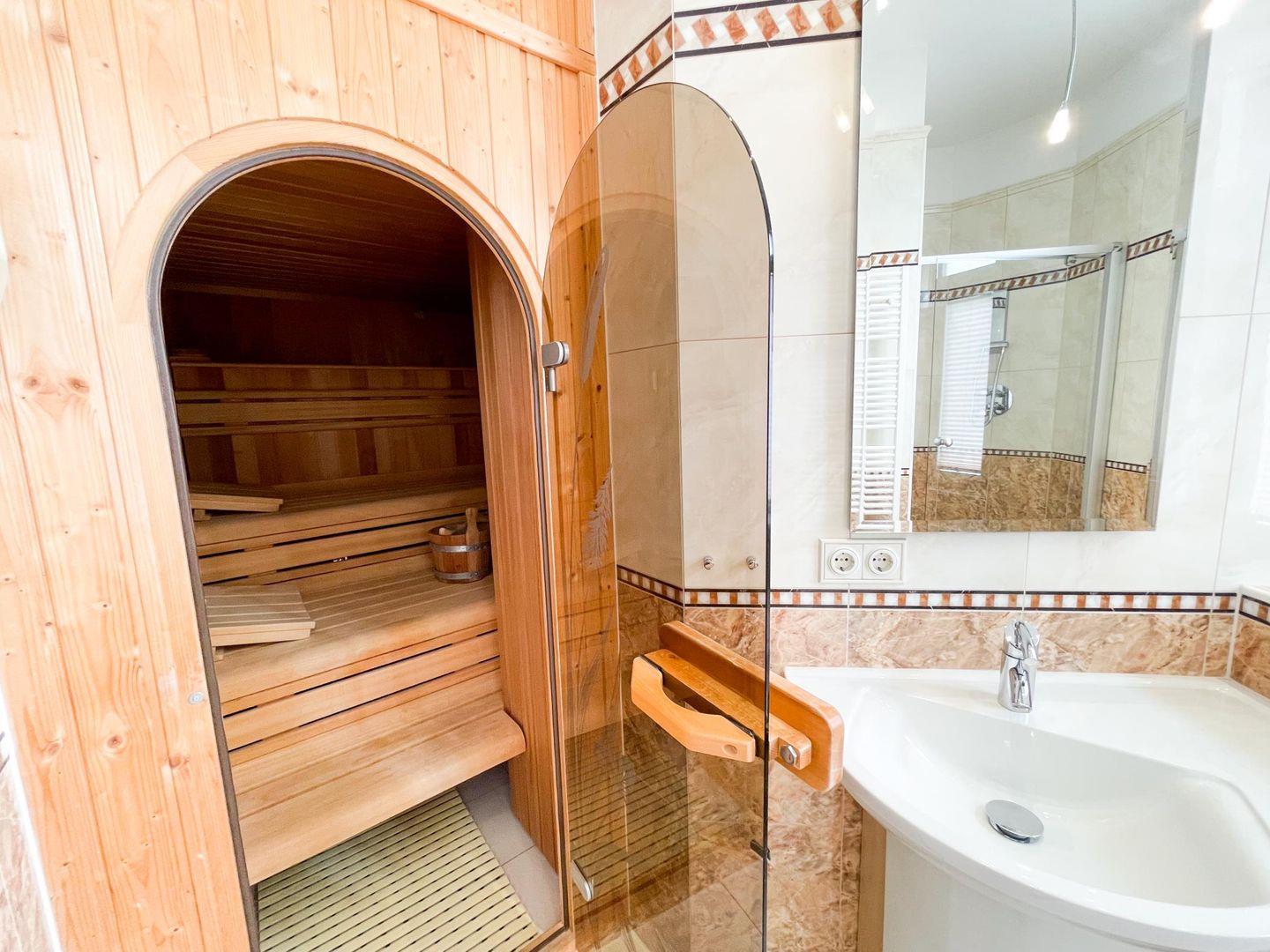 Genießen Sie einen Tag in Ihrem eigenen Wellness-Bereich: in einem der beiden Badezimmer stehen Ihnen eine Sauna, eine schöne Dusche sowie Waschbecken und WC zur Verfügung. Wem das zu "heiß" ist, gönnt sich ein ausgiebiges Bad. Das ist im zweiten Badezimmer möglich. Auch dieses ist mit hochwertigen Armaturen ausgestattet und verfügt zusätzlich über Dusche, WC und Waschbecken.