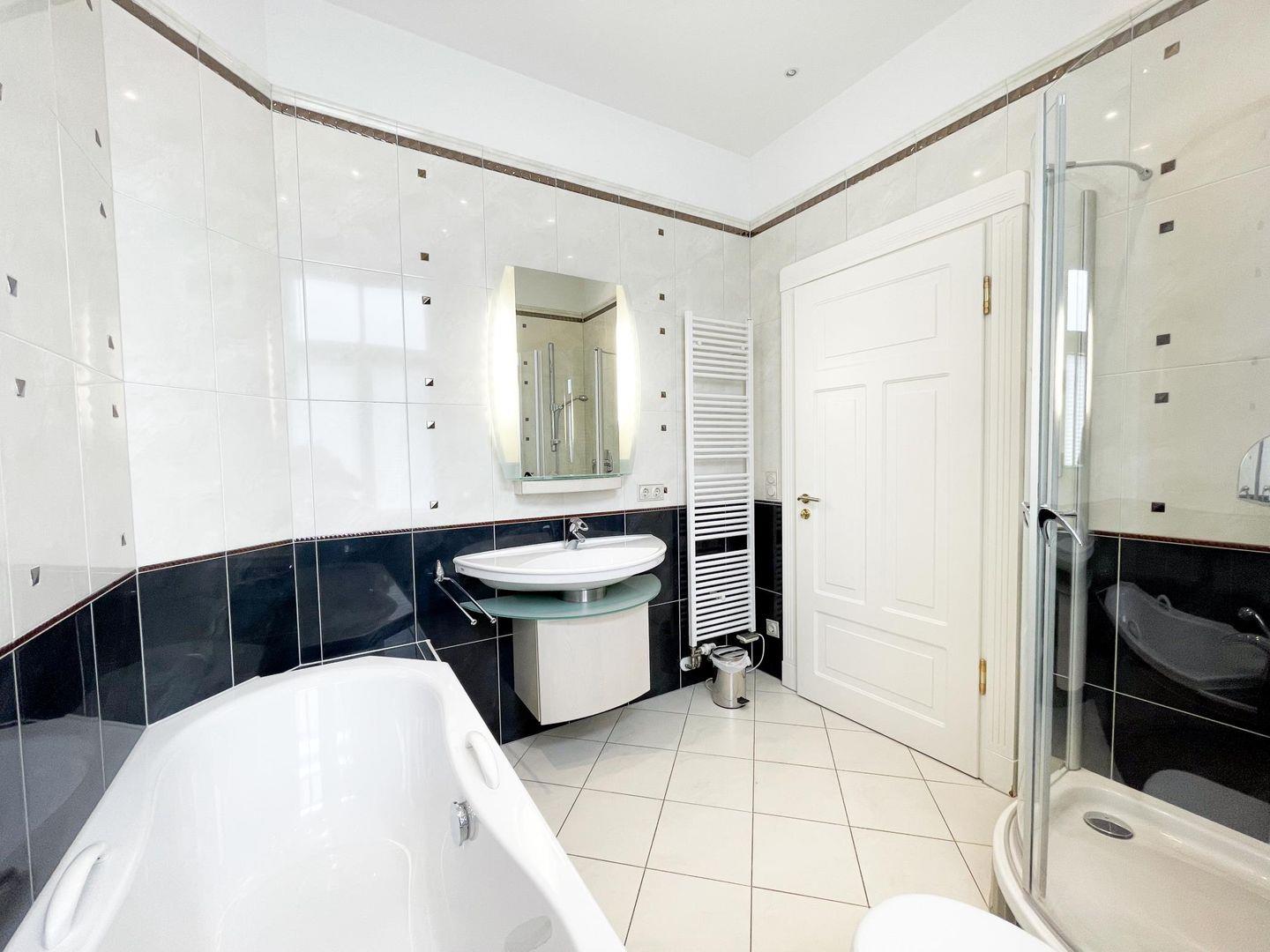 Neben zwei separaten Schlafzimmern und zwei Bädern verfügt die Wohnung zusätzlich über einen geräumigen Wohnbereich mit integrierter Einbauküche. Vom Esstisch aus im verglasten Erker haben Sie einen herrlichen Blick auf den "eigenen" Garten und die Strandpromenade. Die Küche ist mit hochwertigen Markeneinbaugeräten ausgestattet und lässt kaum einen Wunsch offen.