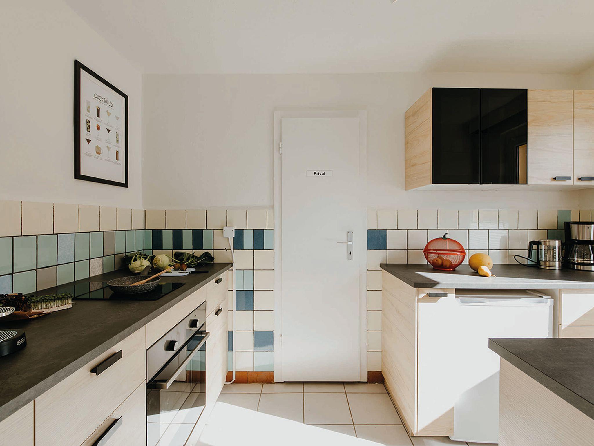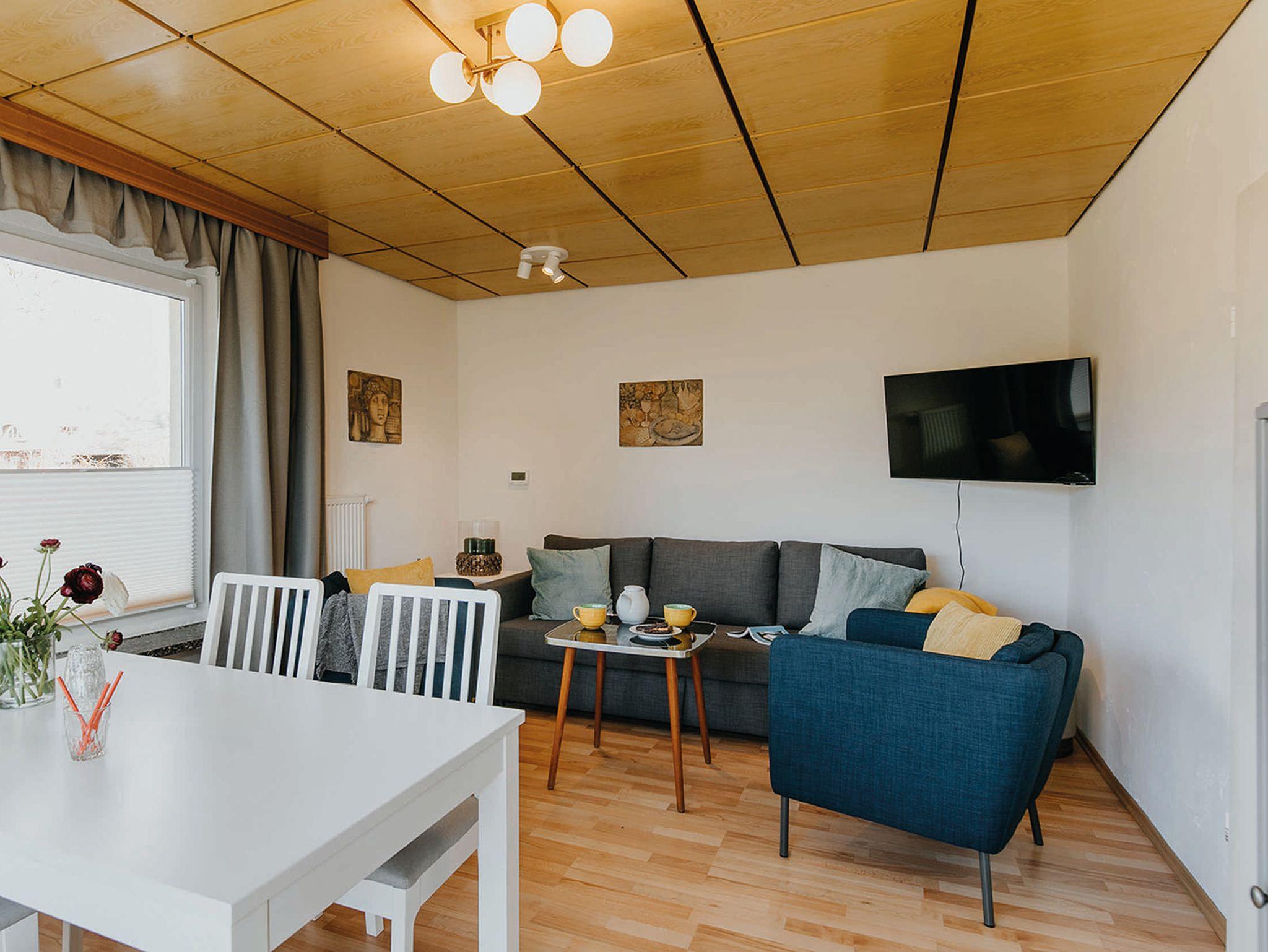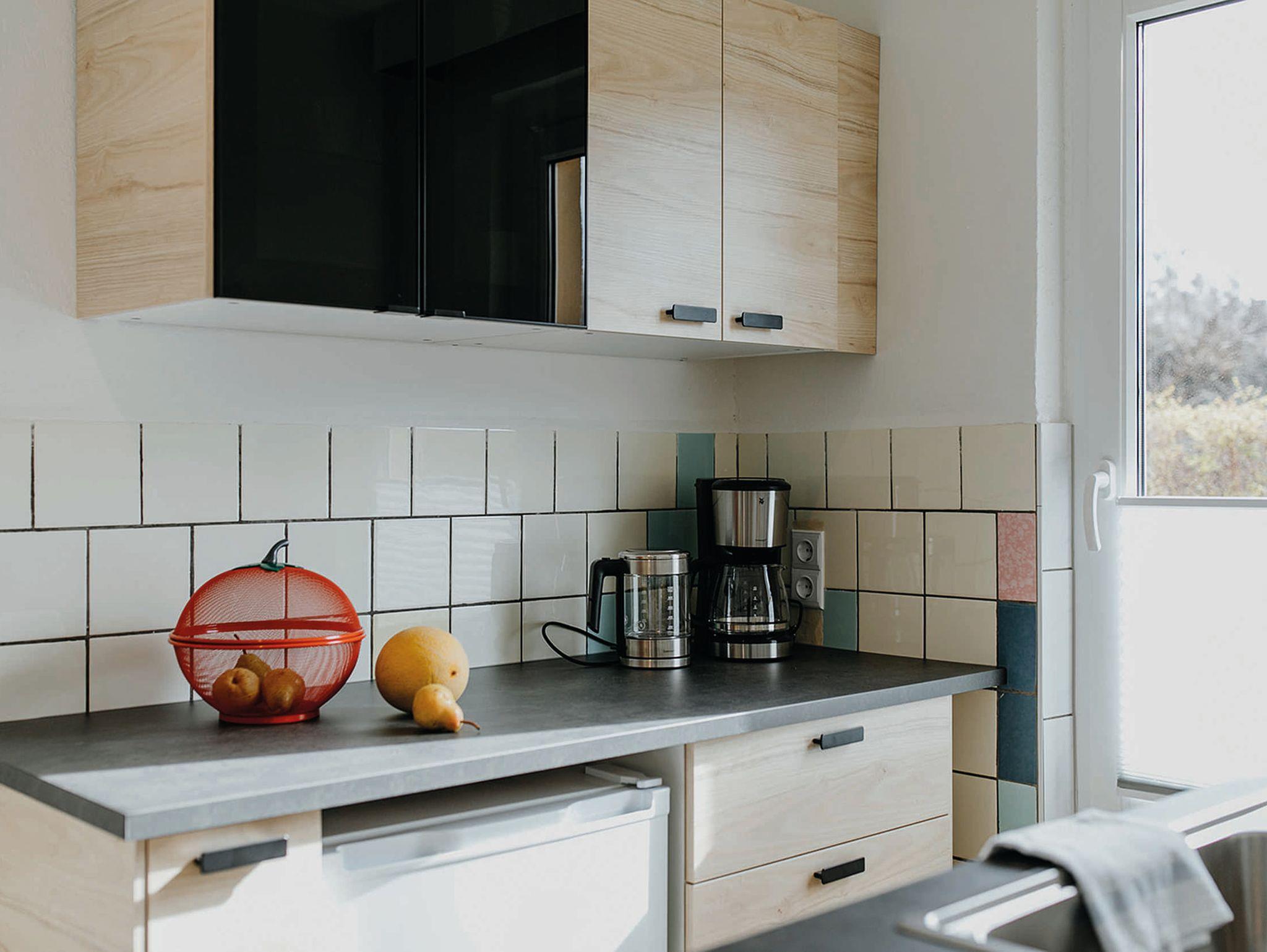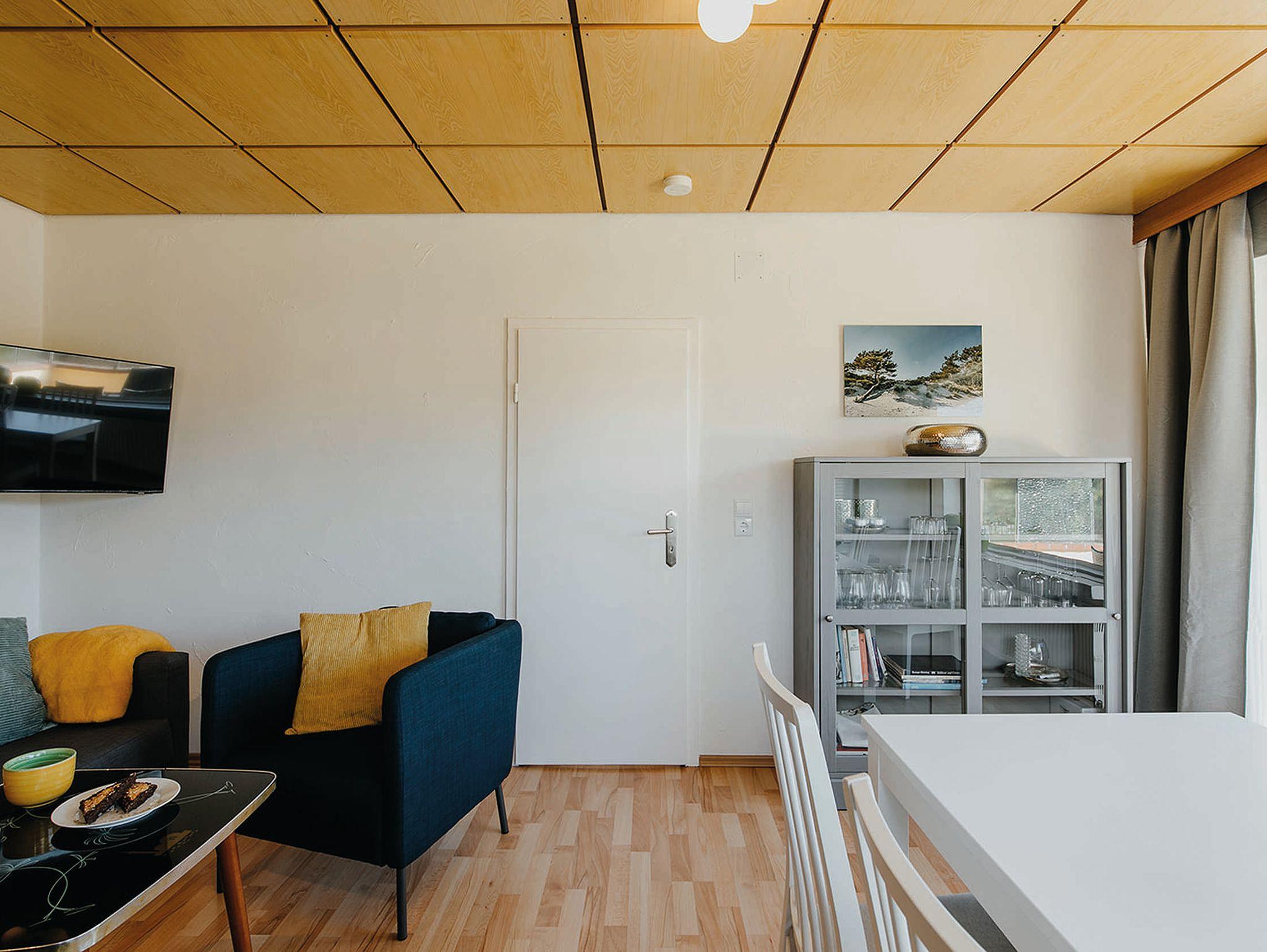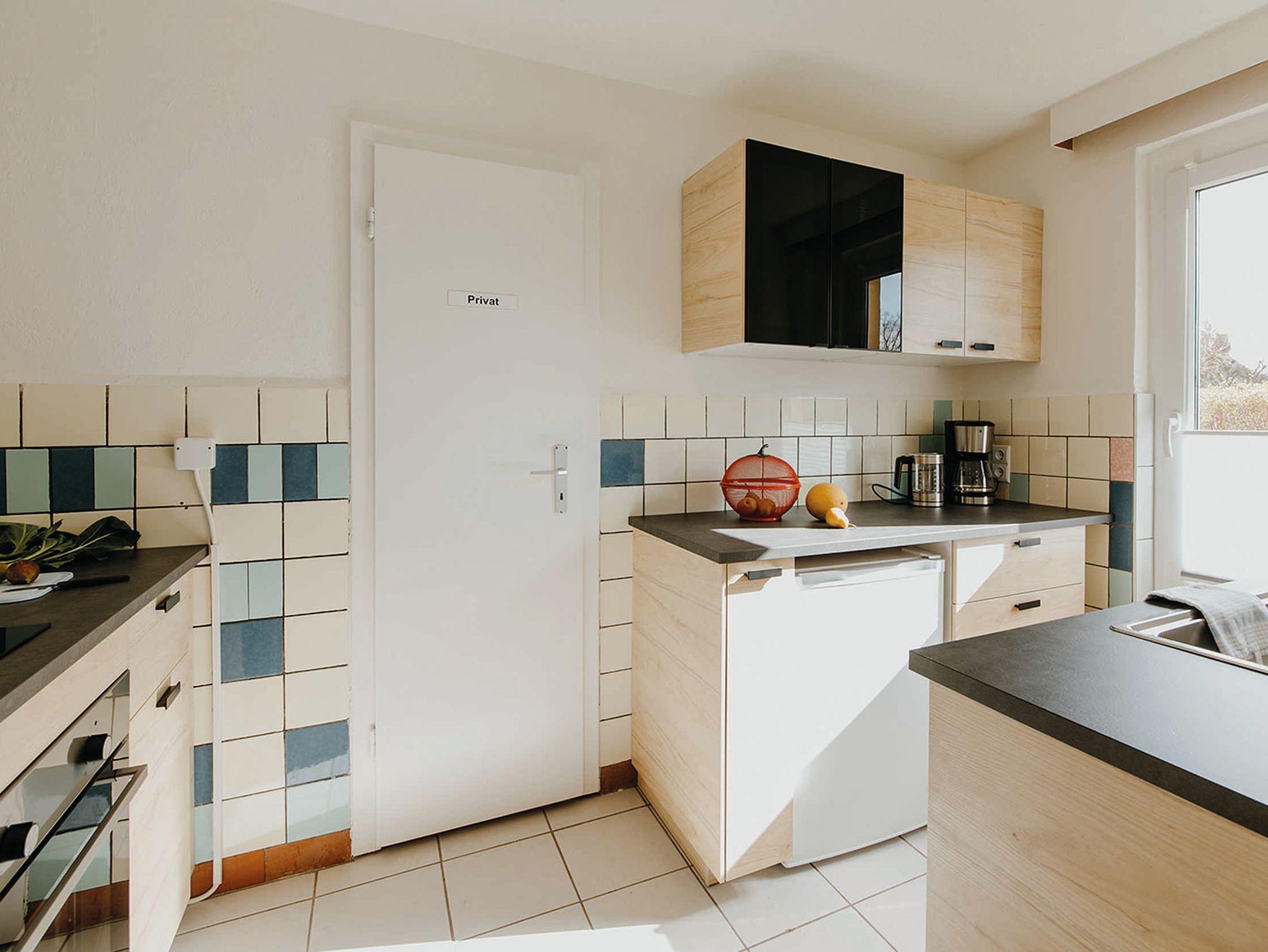 Im Erdgeschoss des Ferienhauses befinden sich neben dem Wohnzimmer mit bequemer Sitzgruppe, ein Esstisch mit 4 Stühlen, das Bad ist ausgestattet mit Dusche/WC und einer Fußbodenheizung auch eine voll ausgestattete Küche mit Cerankochfeld, Nespresso- Kaffeemaschine, Toaster, Wasserkocher, Kühlschrank mit Gefrierfach und einem Backofen.