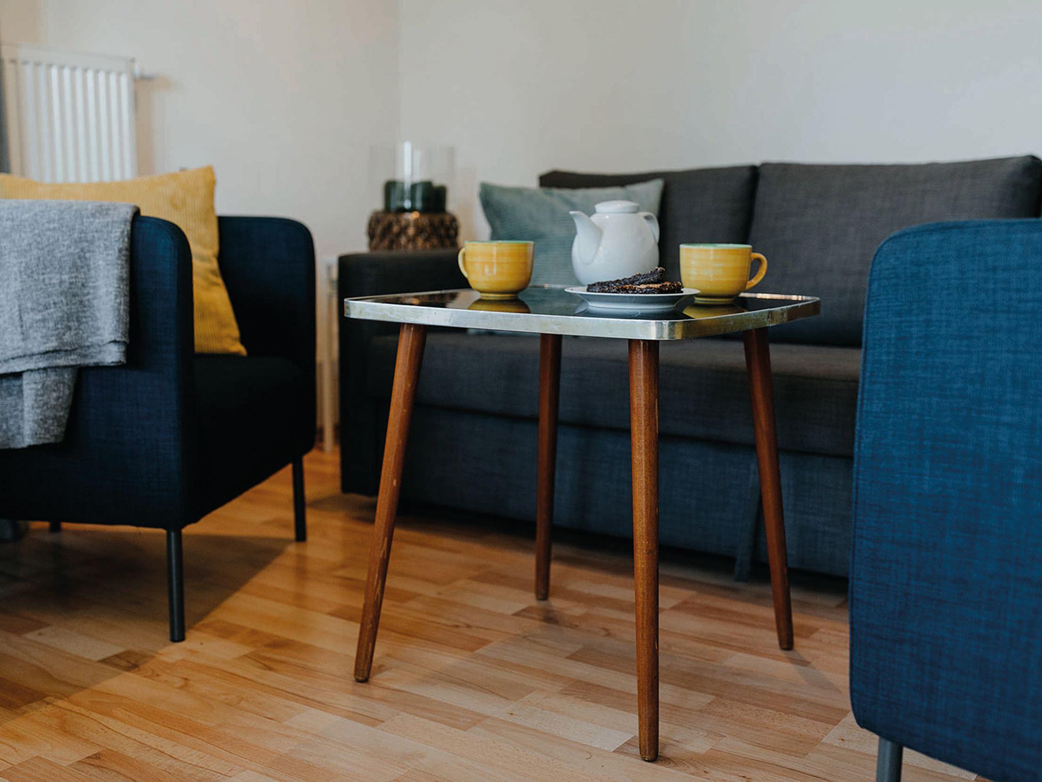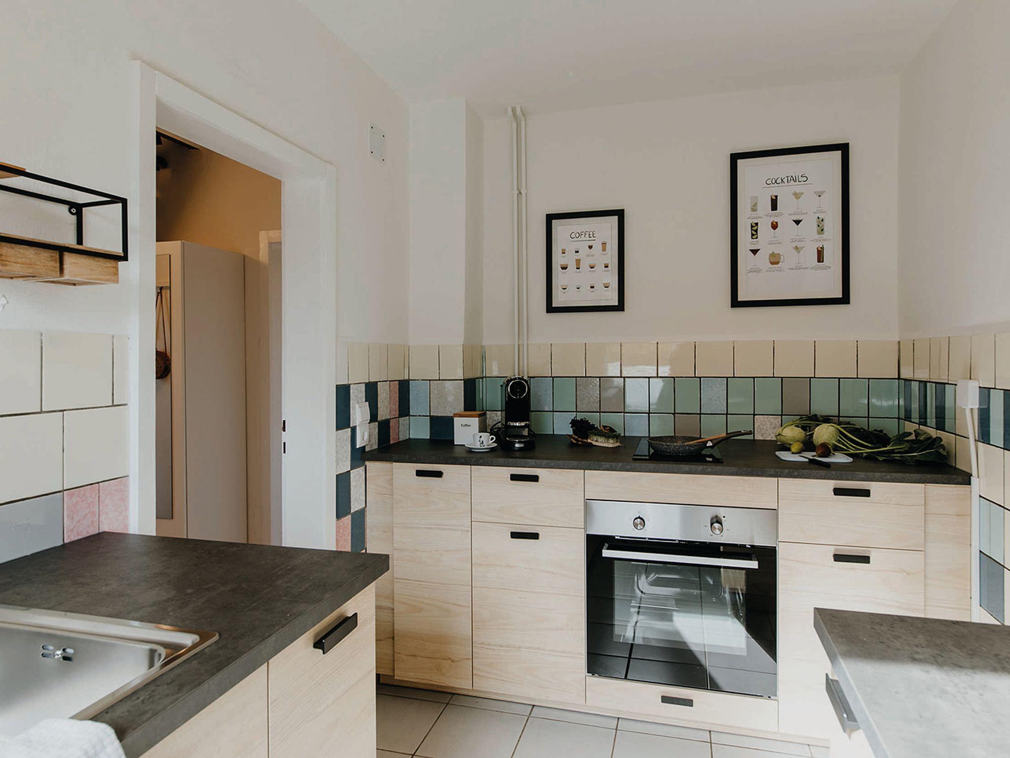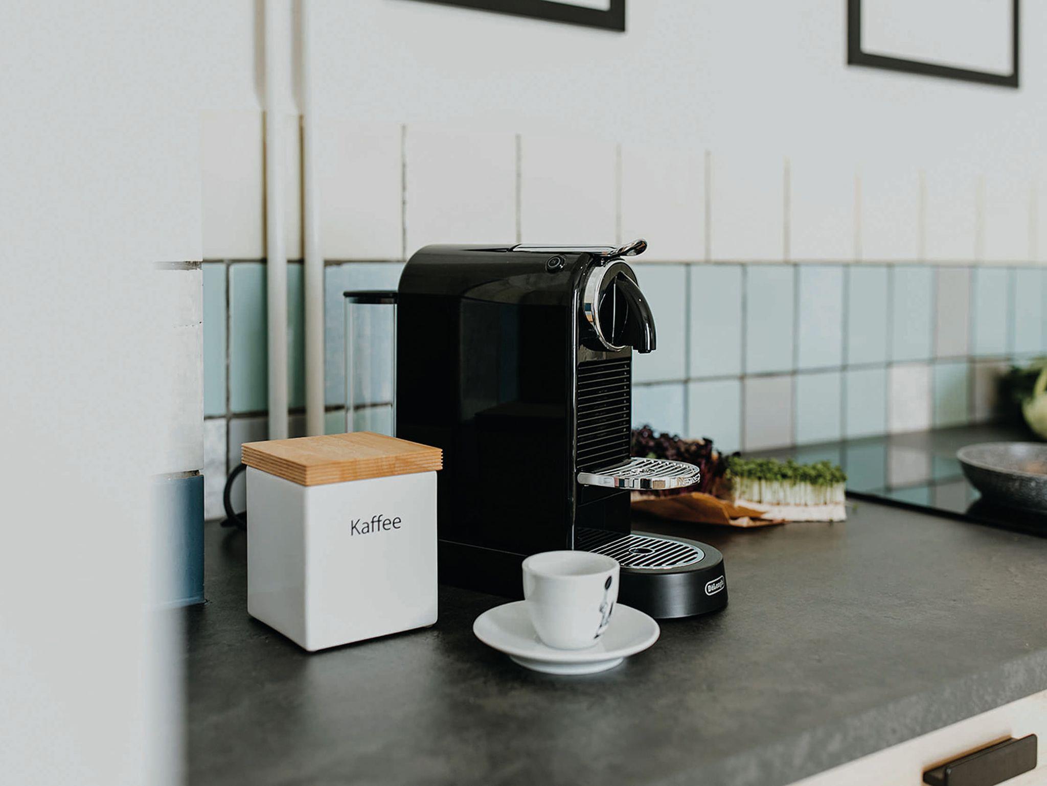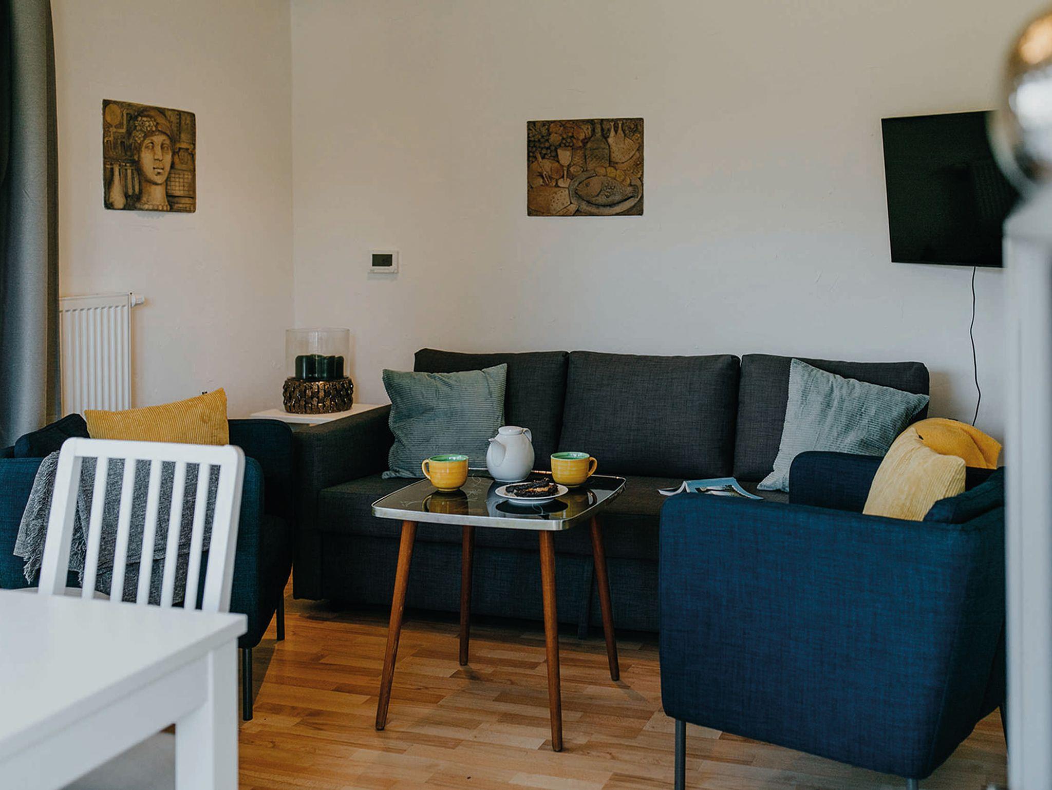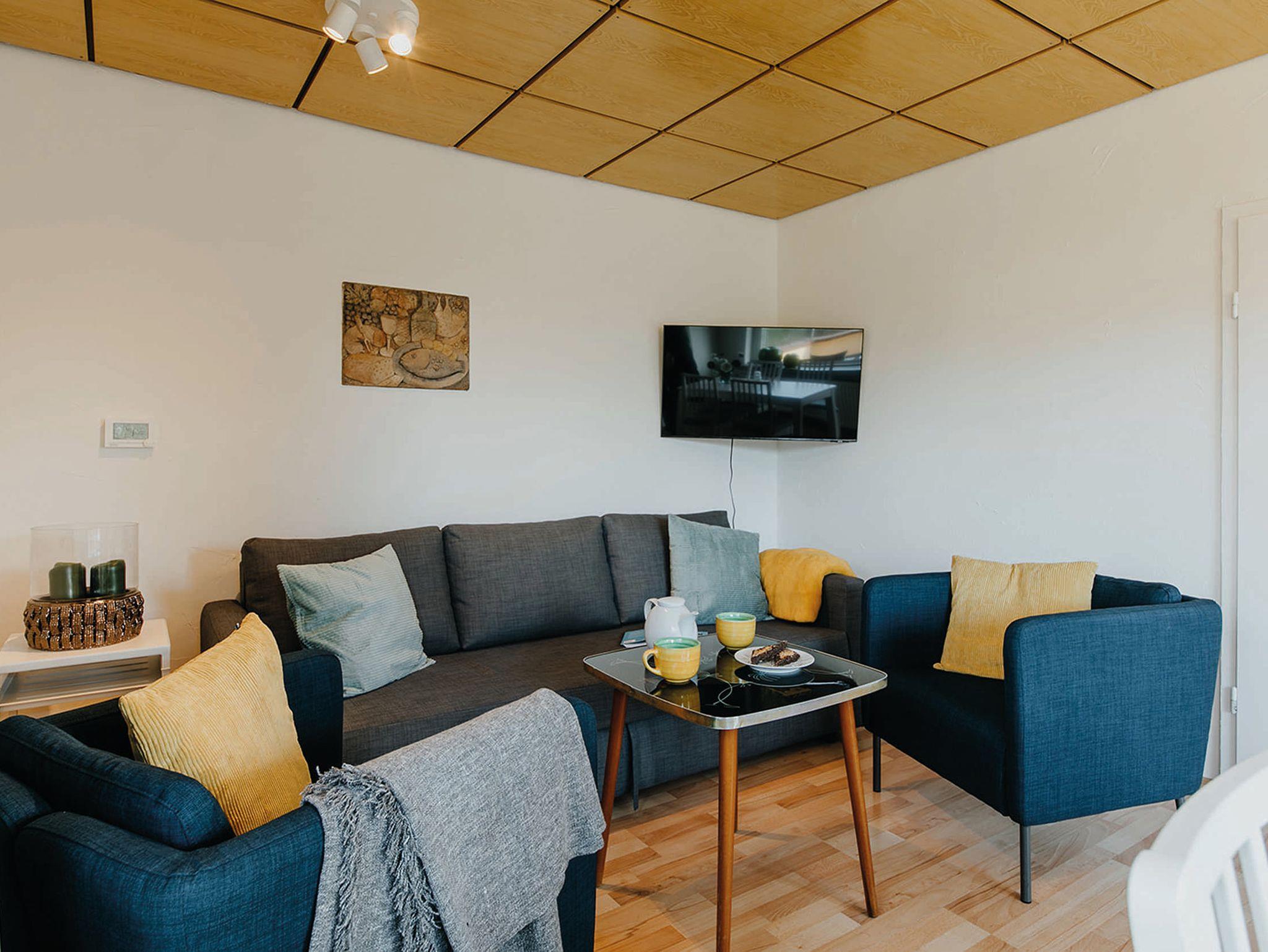 Im Erdgeschoss des Ferienhauses befinden sich neben dem Wohnzimmer mit bequemer Sitzgruppe, ein Esstisch mit 4 Stühlen, das Bad ist ausgestattet mit Dusche/WC und einer Fußbodenheizung auch eine voll ausgestattete Küche mit Cerankochfeld, Nespresso- Kaffeemaschine, Toaster, Wasserkocher, Kühlschrank mit Gefrierfach und einem Backofen.