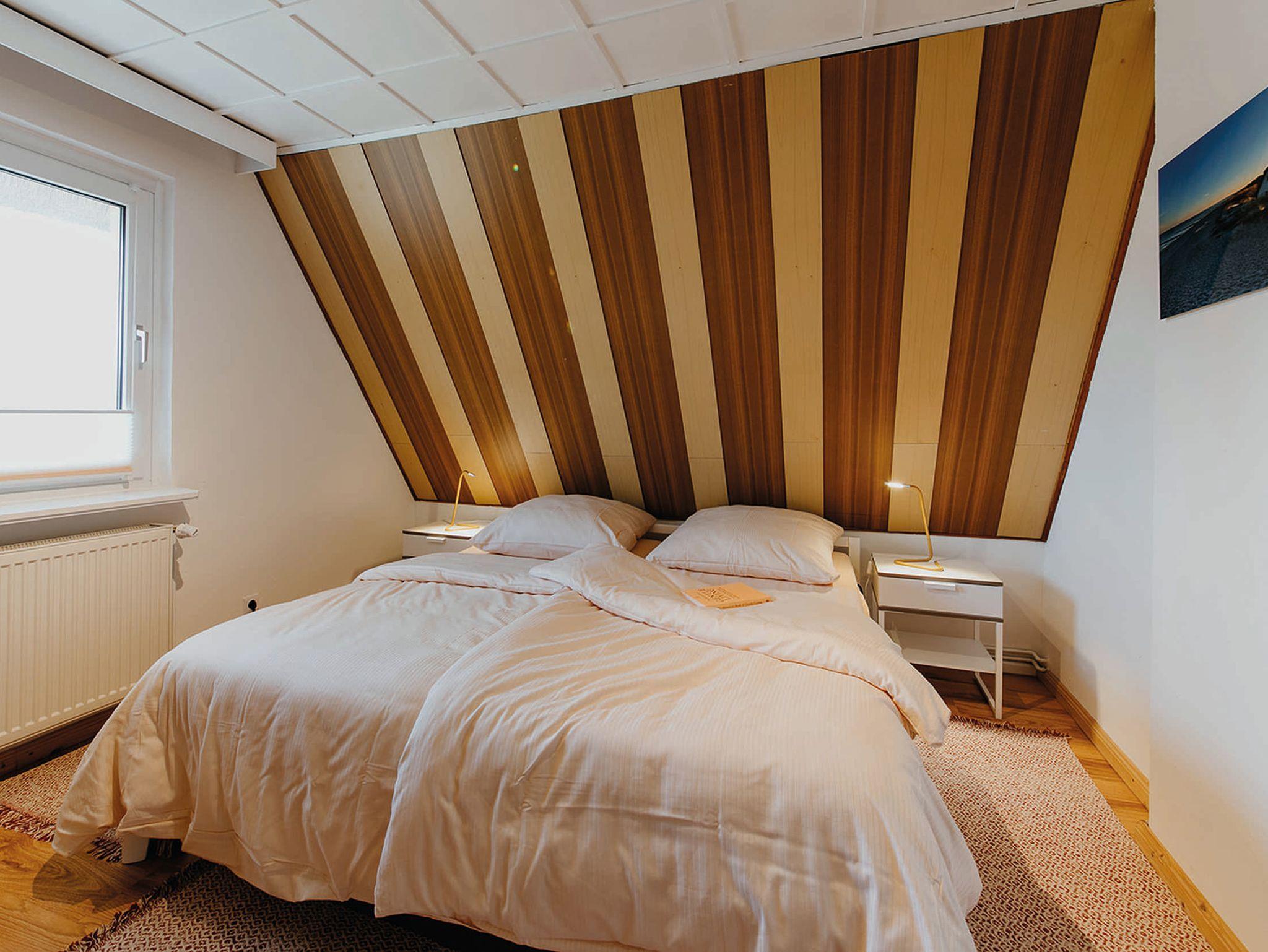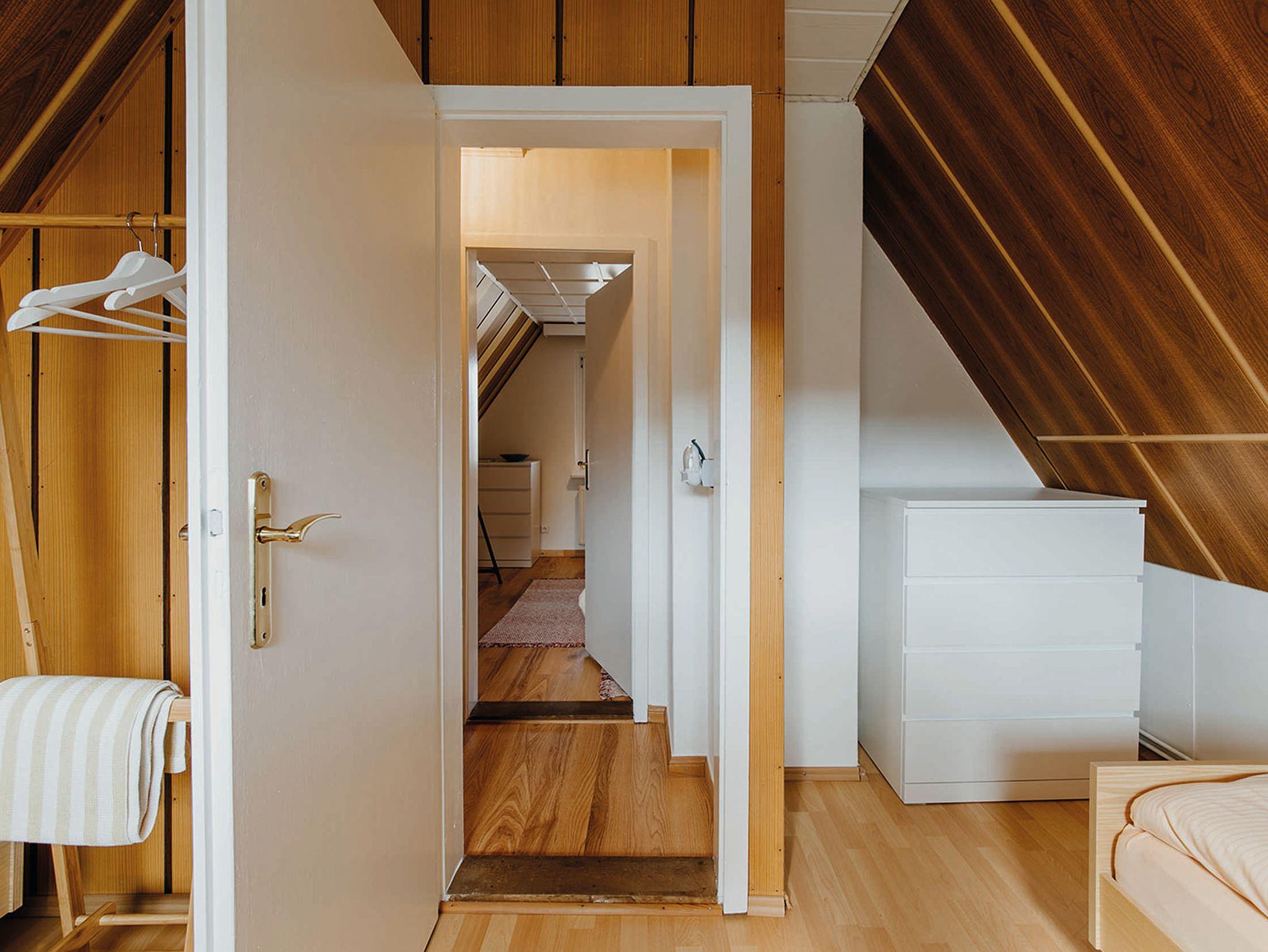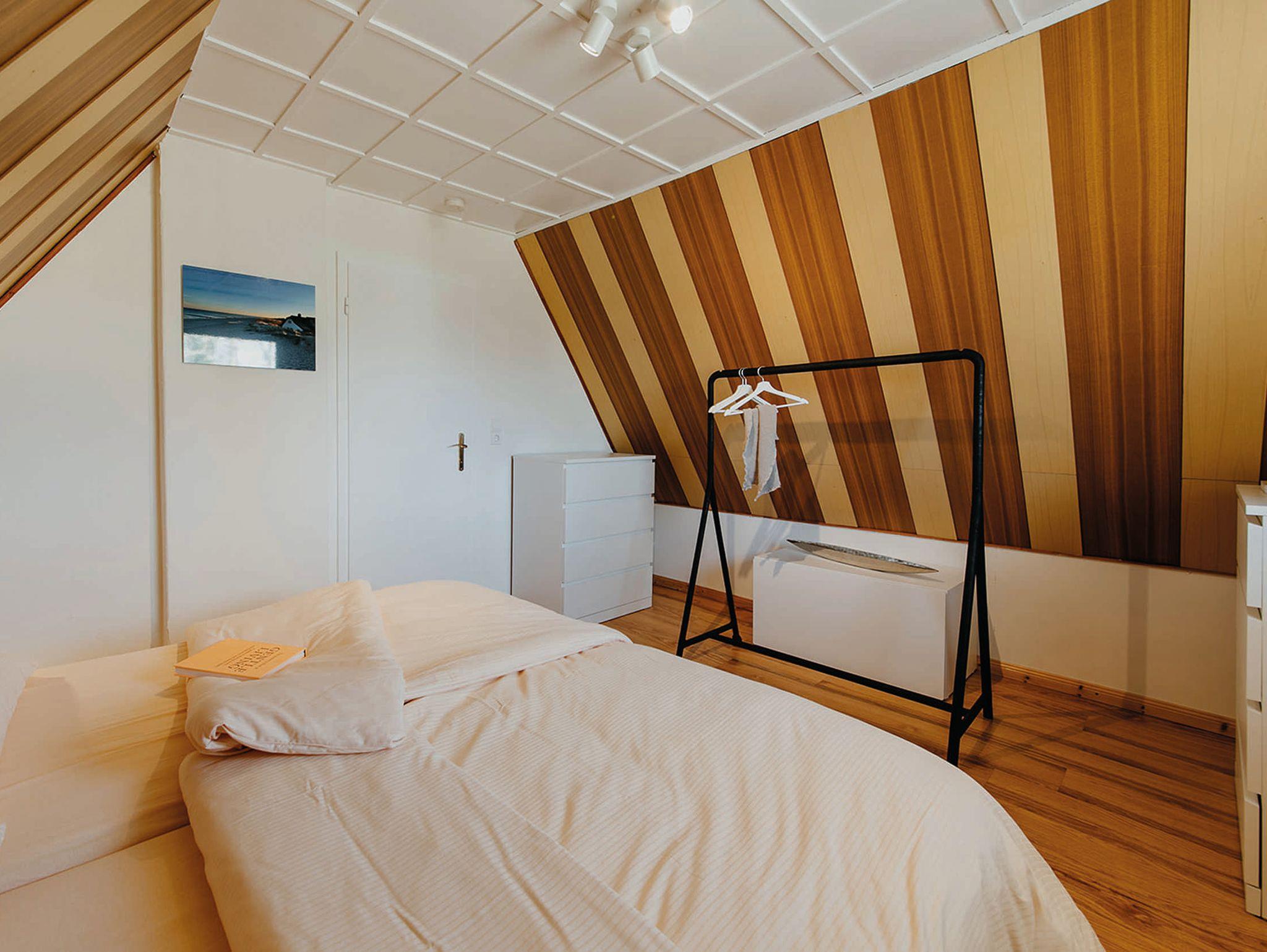 Im Obergeschoss befinden sich das Elternschlafzimmer mit einem Doppelbett (getrennte Matratzen) sowie ein weiteres Schlafzimmer mit zwei Einzelbetten.