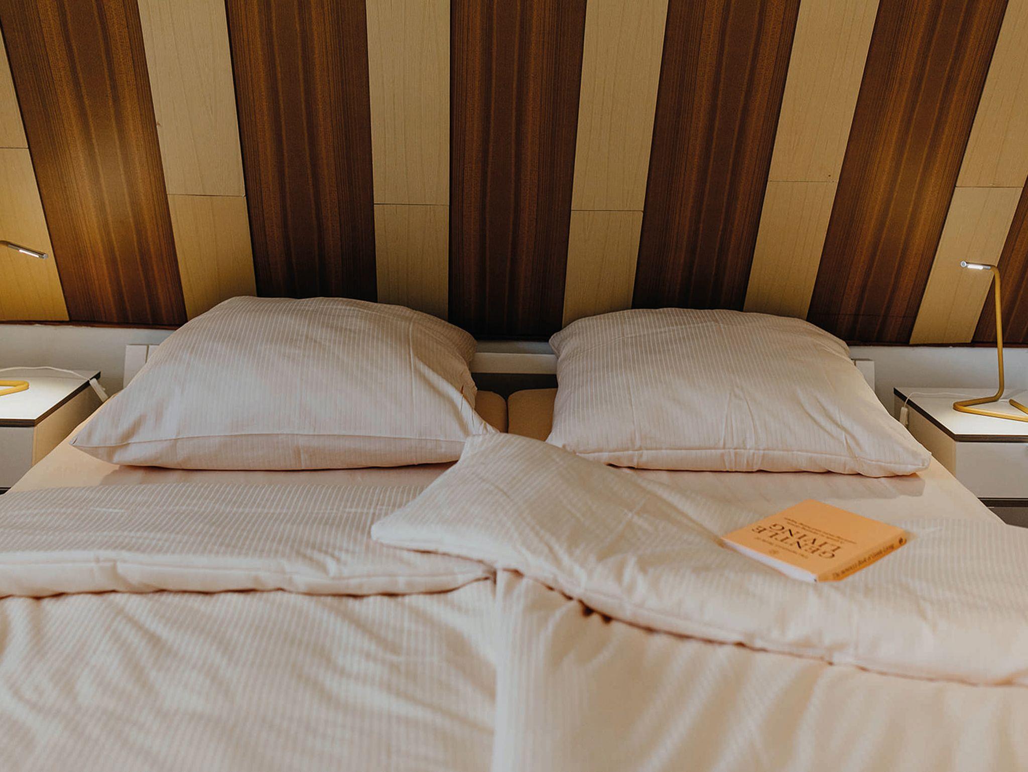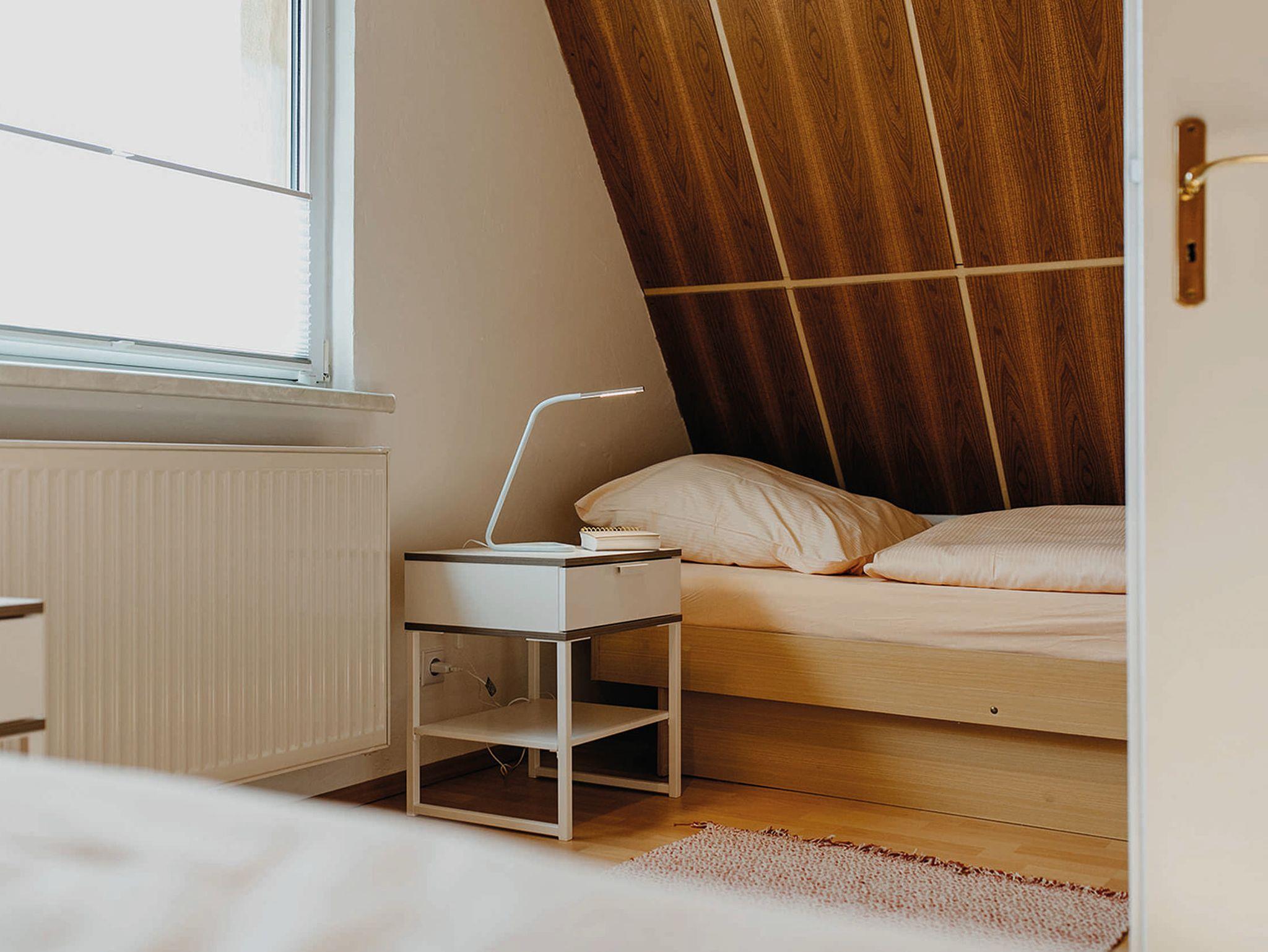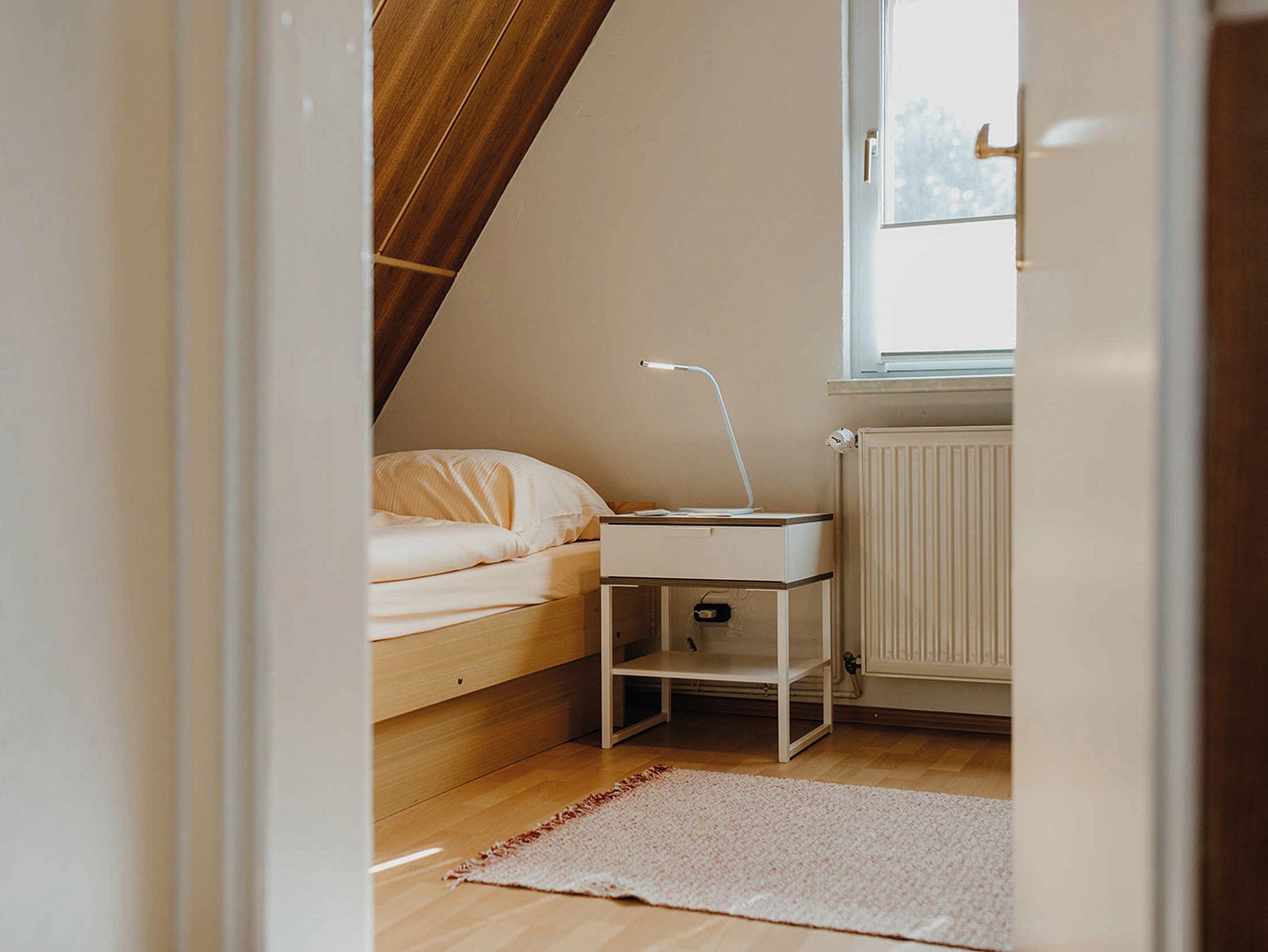 Im Obergeschoss befinden sich das Elternschlafzimmer mit einem Doppelbett (getrennte Matratzen) sowie ein weiteres Schlafzimmer mit zwei Einzelbetten.