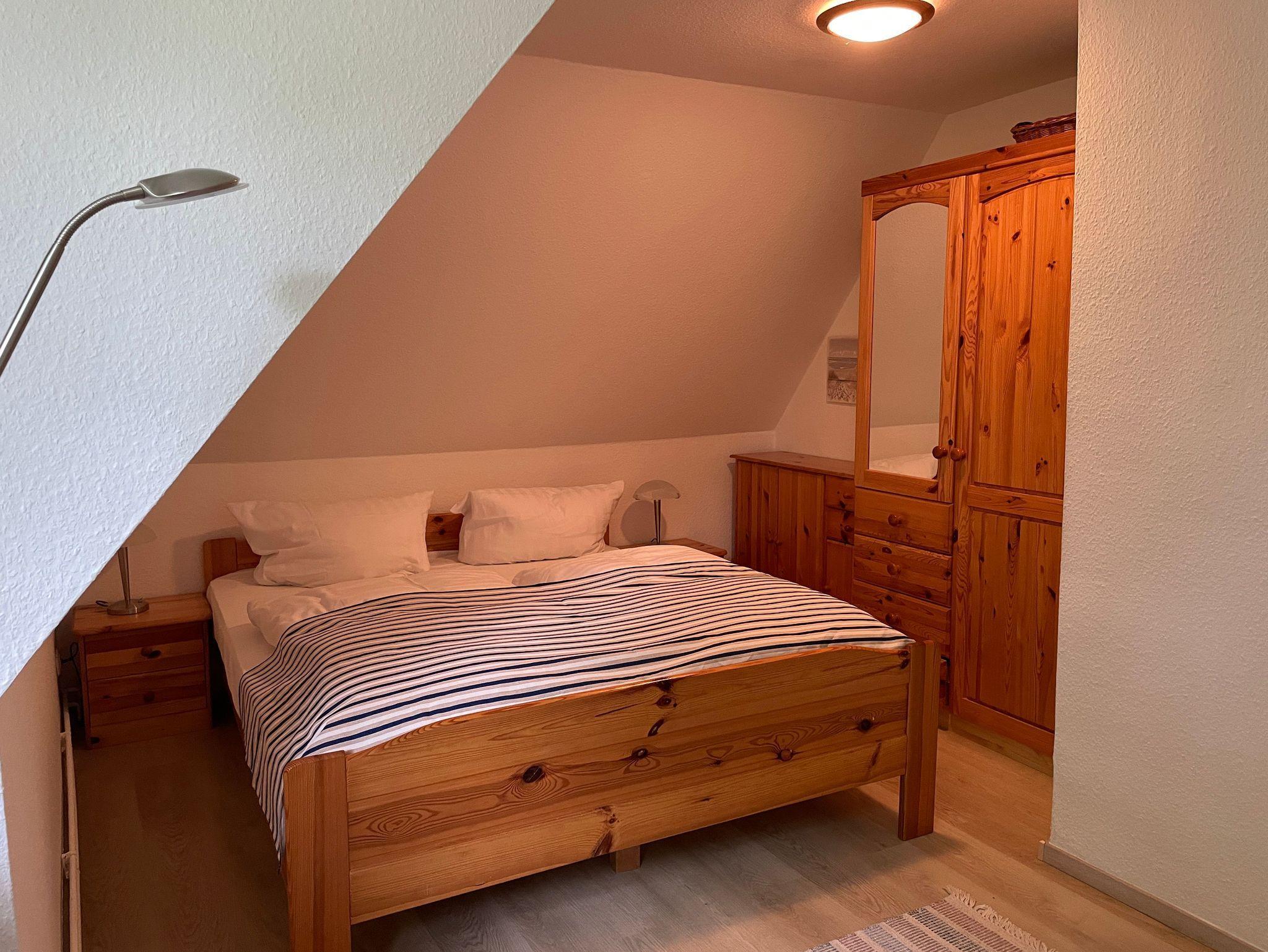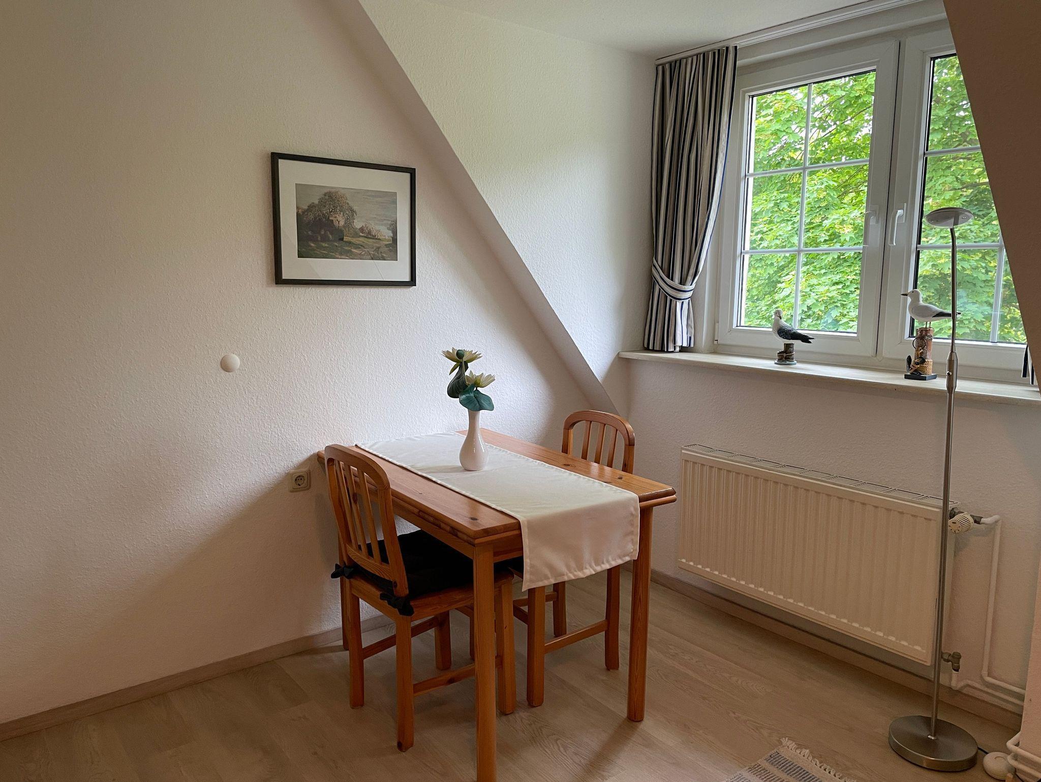 Kleine Ferienwohnung im Obergeschoss in einem schönen Reetdachhaus. Sie wohnen zentral und strandnah, aber trotzdem ruhig. Die Wohnung verfügt über ein gemütliches Wohnzimmer mit Couch und Sessel sowie einem Fernseher. Im separaten Schlafzimmer finden Sie ein Doppelbett sowie einen Essplatz. Das Tageslichtbad ist mit einer Dusche ausgestattet. Die Küche befindet sich im Eingangsbereich der Wohnung und ist ausgestattet mit einem Zwei-Platten-Cerankochfeld, einem Kühlschrank (mit Eisfach) sowie Wasserkocher, Toaster und Kaffeemaschine. Das Tageslichtbad verfügt über eine Dusche / WC. Zur Wohnung gehört ein großer Garten, der gemeinschaftlich mit anderen Gästen genutzt werden kann. Ein Parkplatz ist ebenfalls vorhanden. Der Eingang zur Wohnung führt über eine Treppe. Die Bettwäsche ist im Preis inklusive. Handtücher müssen mitgebracht werden oder können kostenpflichtig dazu gebucht werden.