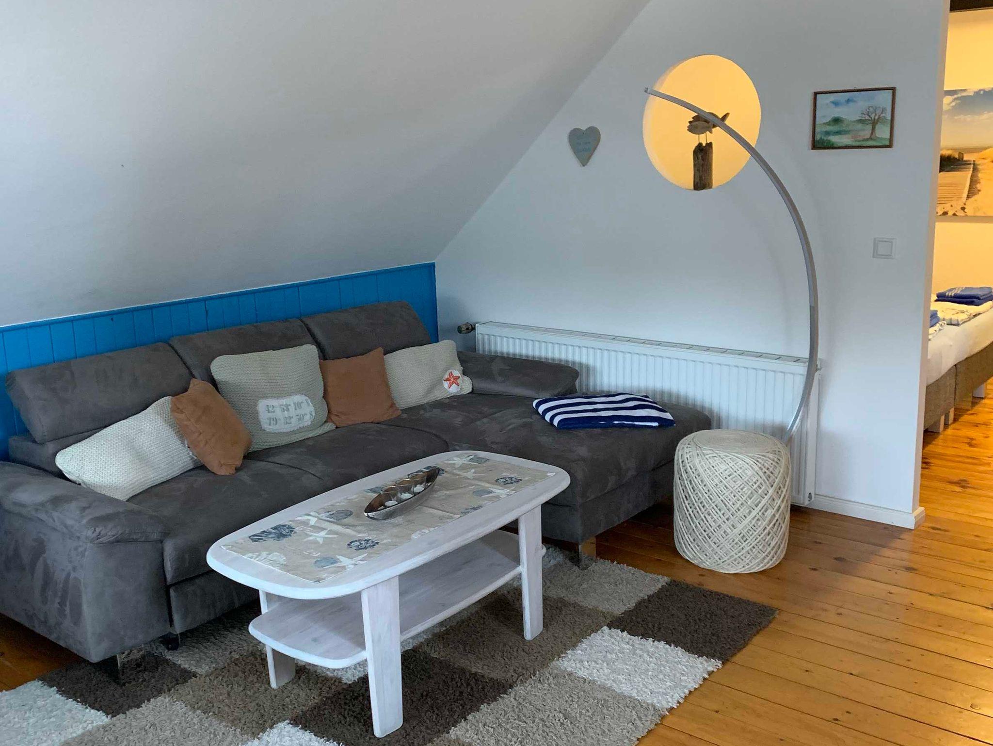 Die lichtdurchflutete offen gestaltete Dachgeschoss-Wohnung ist gemütlich eingerichtet, so dass Sie sich vom ersten Urlaubstag an wohlfühlen können. Hier gibt es ein Schlafzimmer mit Doppelbett und einer Schlafnische für ein kleineres Kind (max. 6 Jahre). Der Wohnbereich ist mit einer Schlafcouch und einer offenen Küche mit Essecke ausgestattet. Das Badezimmer verfügt über eine Dusche. Auch zu dieser Wohnung gehört eine Terrasse.