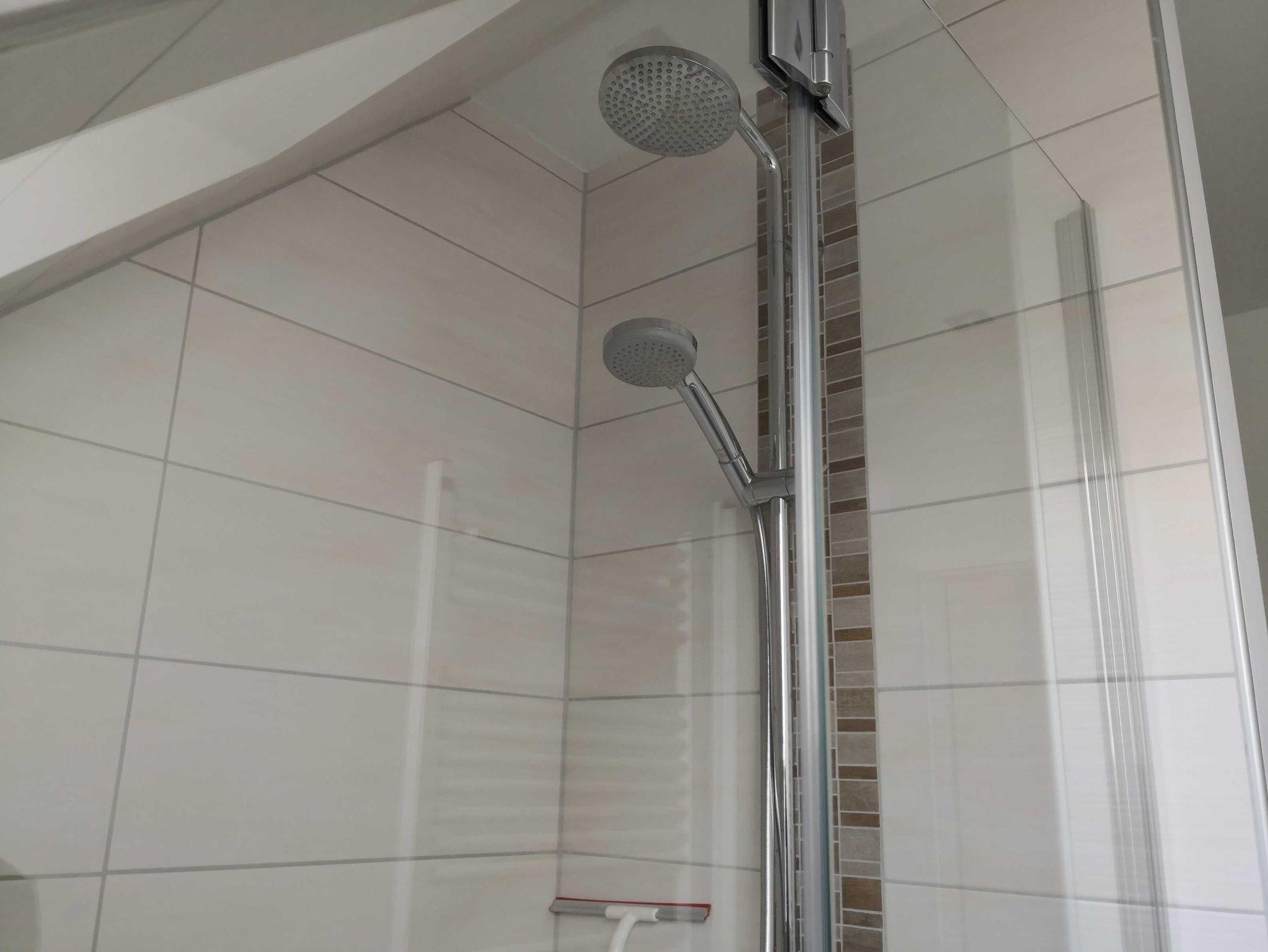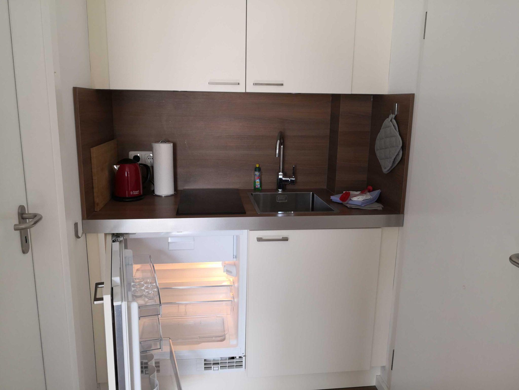 Im Zimmer finden Sie weiterhin eine Sitzgelegenheit mit einem Tisch und zwei Stühlen vor. Zur Ausstattung der Küchenzeile gehören ein Toaster, eine Kaffeemaschine und ein Wasserkocher. Der Kühlschrank ist mit einem Eisfach ausgestattet. Ein Zwei-Platten-Herd zählt ebenfalls zur Küchenausstattung. Die Badezimmer sind mit Dusche und WC ausgestattet. Eine Erstaustattung Handtücher & Bettwäsche ist im Mietpreis enthalten.