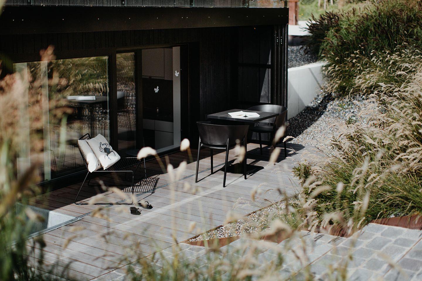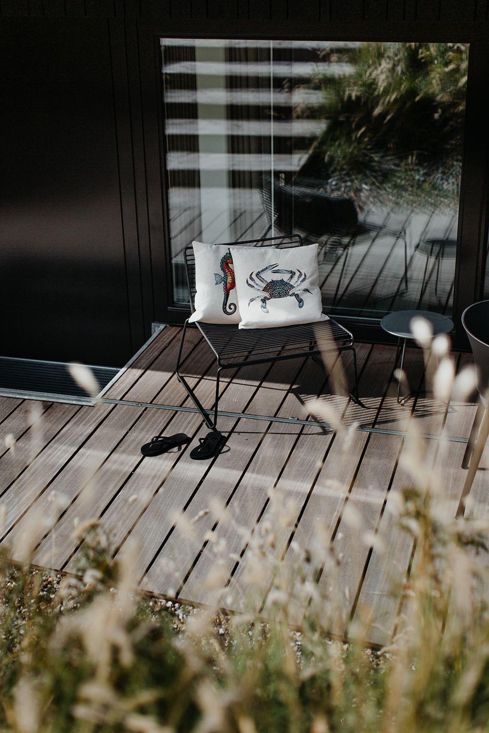 Großflächige Fensterfronten verschaffen der Ferienwohnung an der Ostsee für 2 Personen Transparenz und geben den Blick frei auf den liebevoll und aufwändig gestalteten Außenbereich und die eigene Terrasse. Verschiedene Gräser auf den Steindünen, die sich im Wind wiegen, verwandeln das außergewöhnliche Apartment in einen Ort der Ruhe und Entspanntheit.