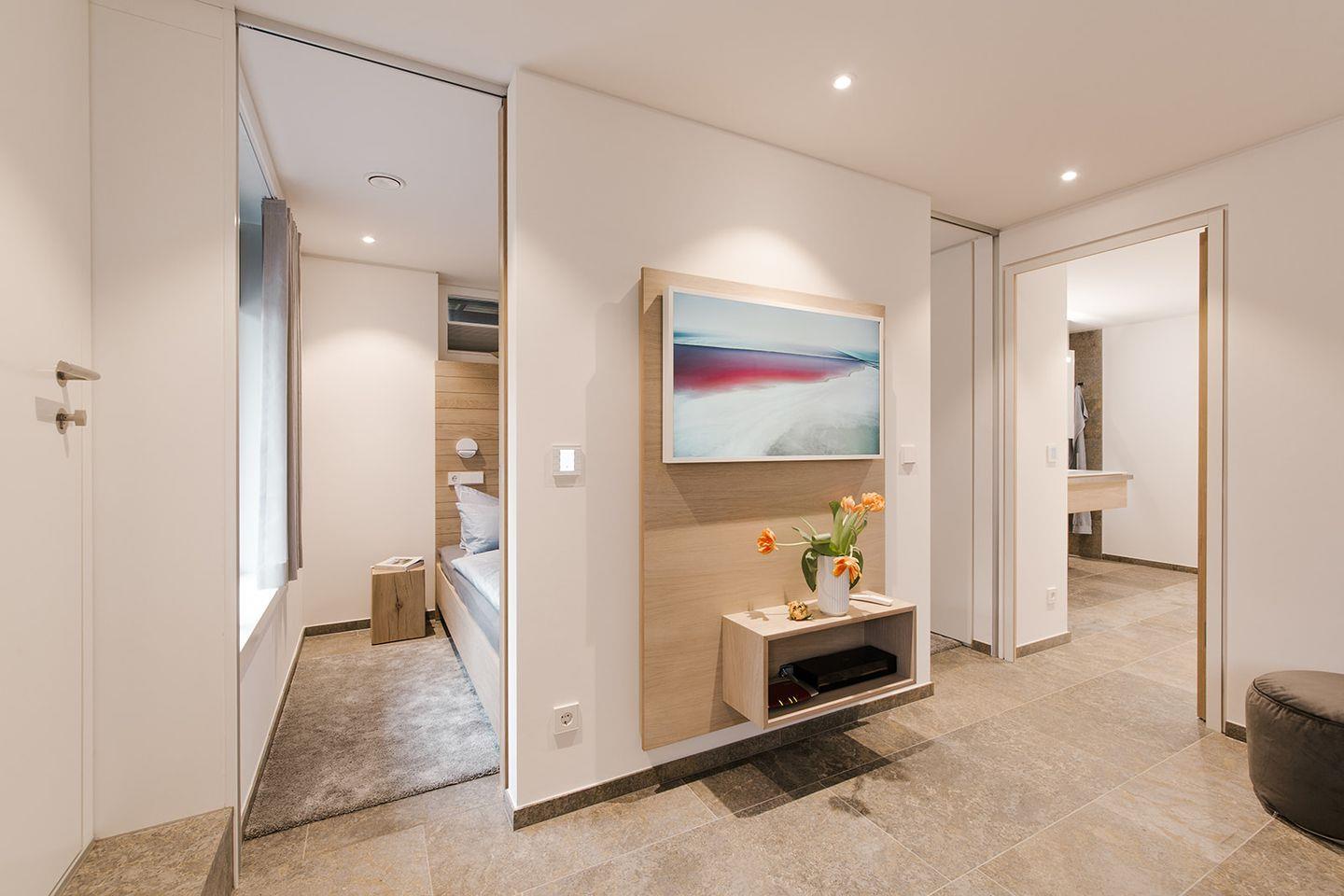 Durch Schiebetüren vom Wohnraum getrennt, gelangt man in den Schlafbereich mit reichlich Stauraum in den Einbauschränken.