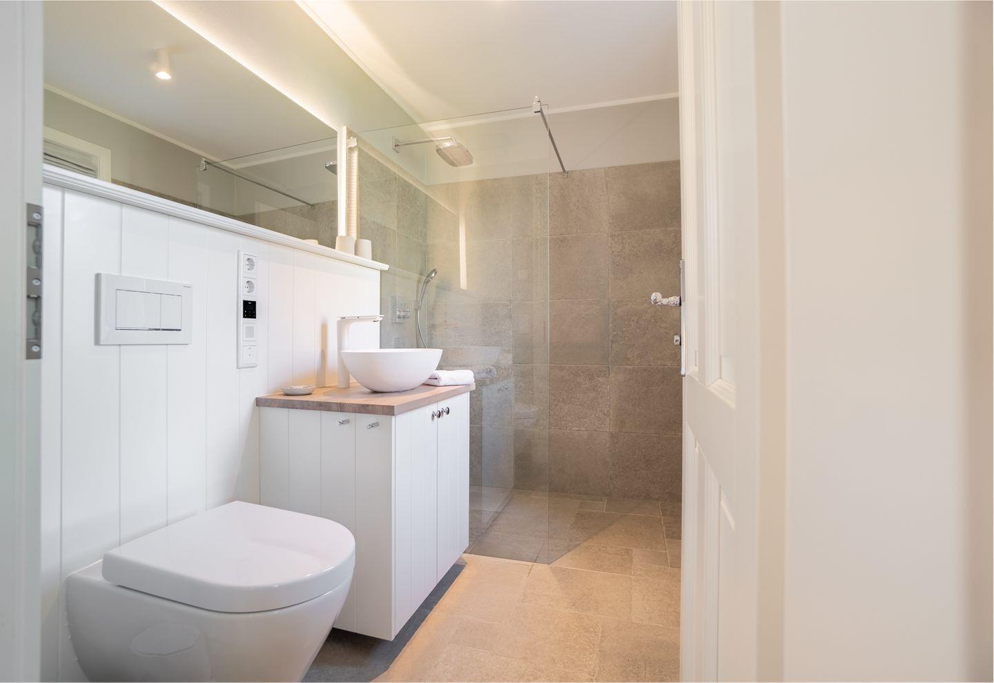 Im Erdgeschoss befindet sich der großzügige Wohn- und Essbereich mit angrenzender Küche, eines der zwei Schlafzimmer, ein Duschbad sowie ein Hauswirtschaftsraum. Die Küche aus Massivholz (Eiche) wurde von einem hiesigen Tischler handgefertigt. Sie ist mit hochwertigen Markengeräten ausgestattet und verfügt über eine Holzarbeitsplatte. Es wird Ihnen weder zum Kochen noch zum Backen an etwas fehlen. Ein Weinkühlschrank ist ebenfalls vorhanden. Den Hauswirtschaftsraum erreichen Sie über die Küche. Dort befinden sich die Waschmaschine und ein Trockner. Im Wohnbereich sorgt der Kachelofen für eine einzigartige, wohlige Atmosphäre. Die Terrasse erreichen Sie bequem über den Wohn- und Essbereich. Ein Schlafzimmer mit Doppelbett und Duschbad en Suite befindet sich im Erdgeschoss.