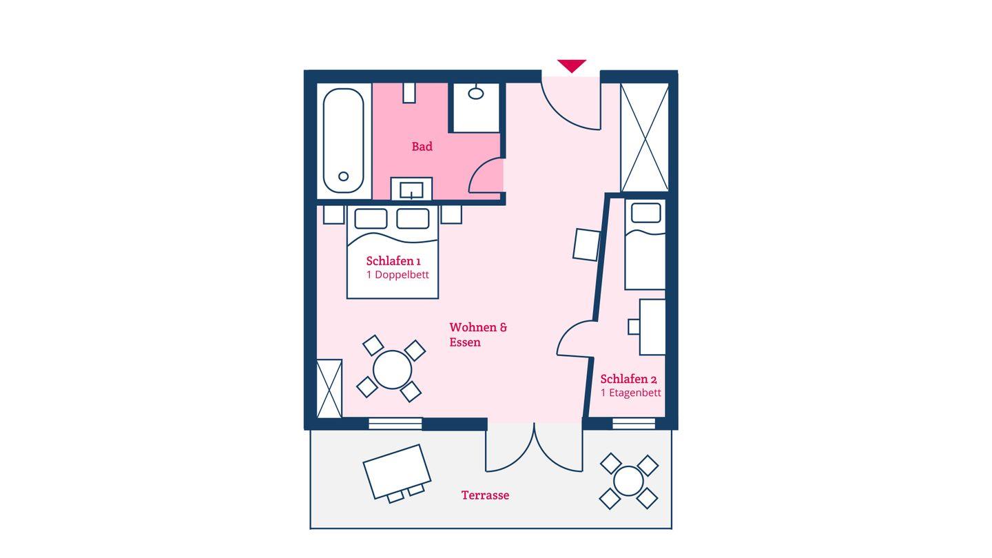 Das Familienzimmer 2 ist in ein Wohn-Schlafzimmer mit einem Doppelbett, ein weiteres Schlafzimmer mit einem Stockbett, sowie ein Vollbad unterteilt und bietet somit komfortabel Platz für bis zu 4 Personen zuzüglich einer Kleinkinderaufbettung. Zudem steht Ihnen eine eigene Terrasse zur Verfügung.