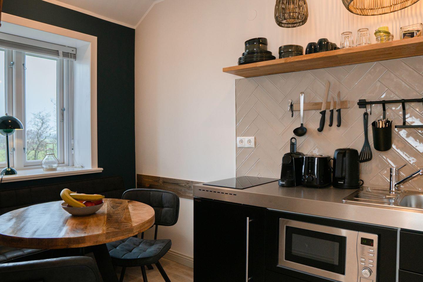Zu den gemeinschaftlich genutzten Räumen der Ferienanlage zählen der Lounge-Bereich mit eigenem Kamin und die großzügige, hochwertig ausgestattete Küche mit 4 Kochstationen, 2 Backöfen, einem Thermomix sowie einem Geschirrspüler.
