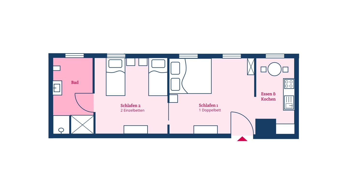 Das Appartement 9 ist in ein Wohn-Schlafzimmer mit einem Doppelbett und einer Pantryküche, ein Schlafzimmer mit zwei Einzelbetten und ein Duschbad unterteilt und bietet somit komfortabel Platz für bis zu 4 Personen zuzüglich einer Kleinkinderaufbettung.