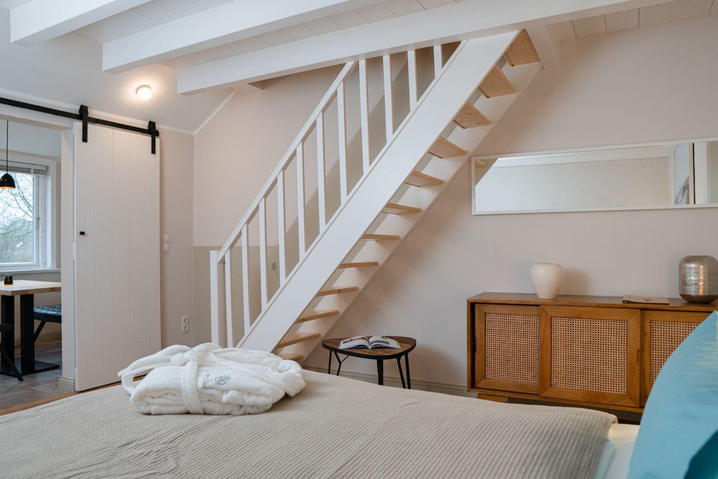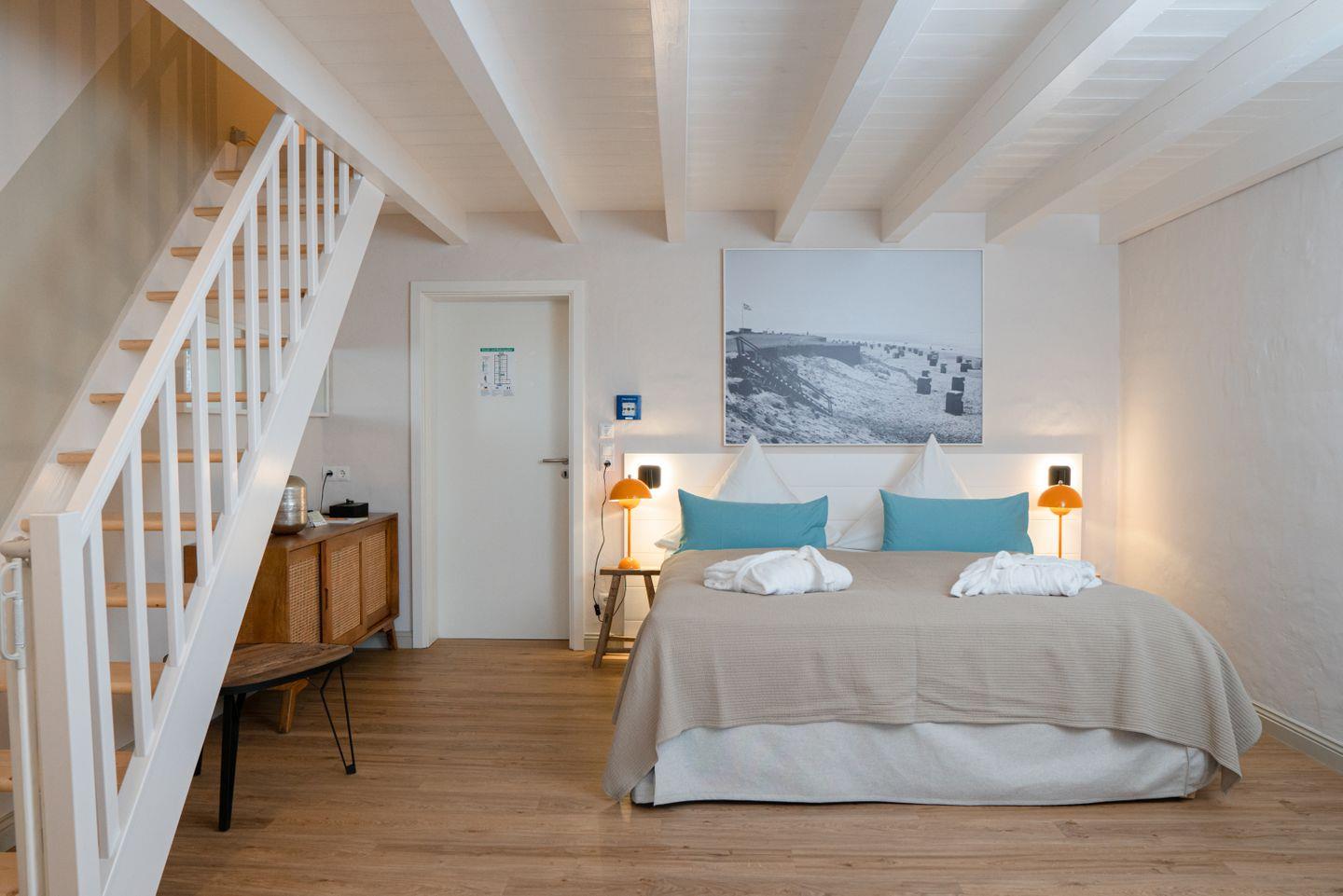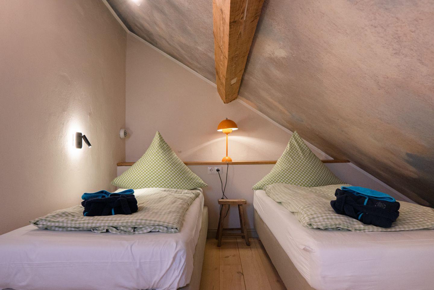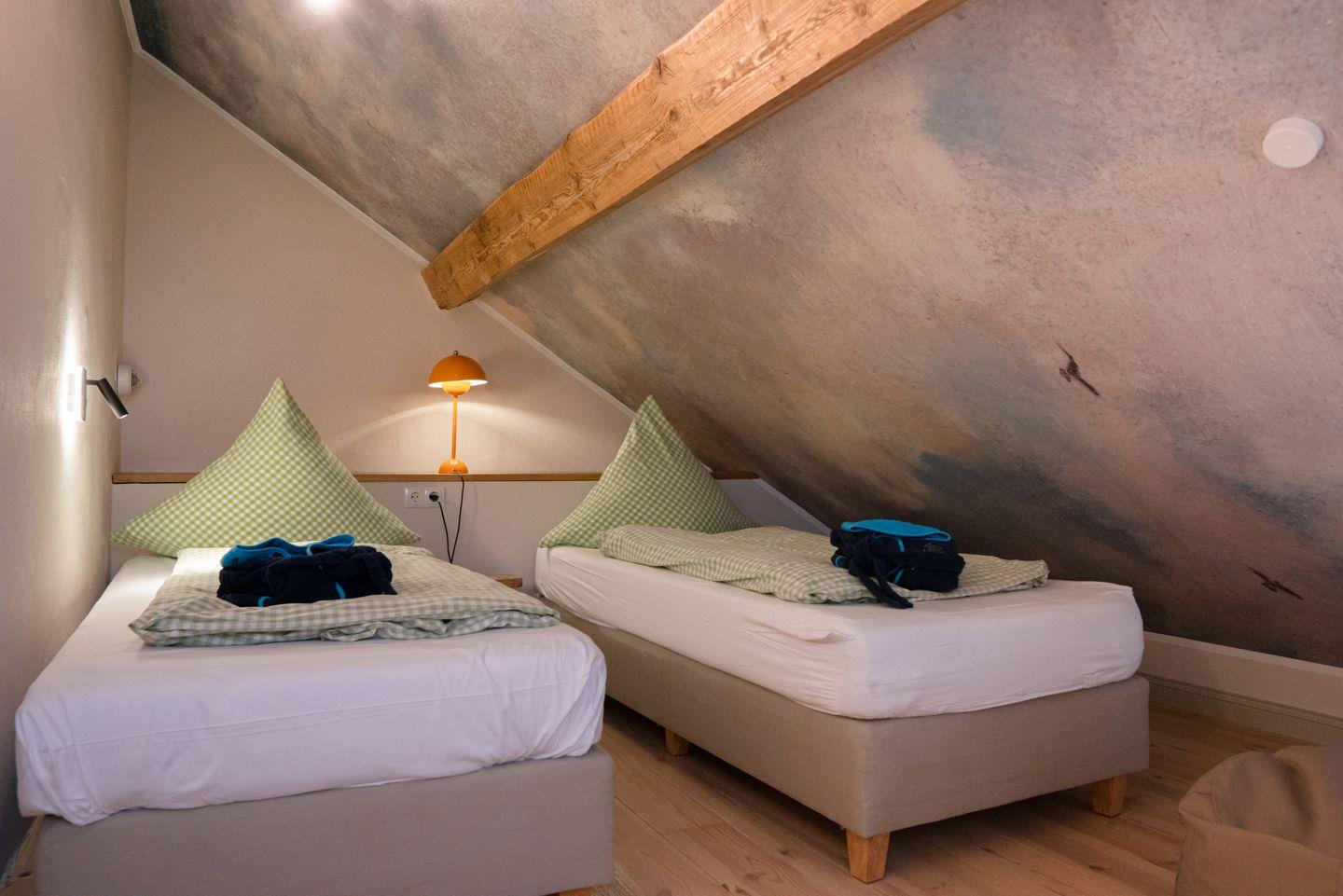 Die Familiensuite 12 ist in ein Wohn-Schlafzimmer mit einem Doppelbett, einen kleinen Schlafboden mit zwei Einzelbetten und ein Duschbad unterteilt und bietet somit komfortabel Platz für bis zu 4 Personen zuzüglich einer Kleinkinderaufbettung.