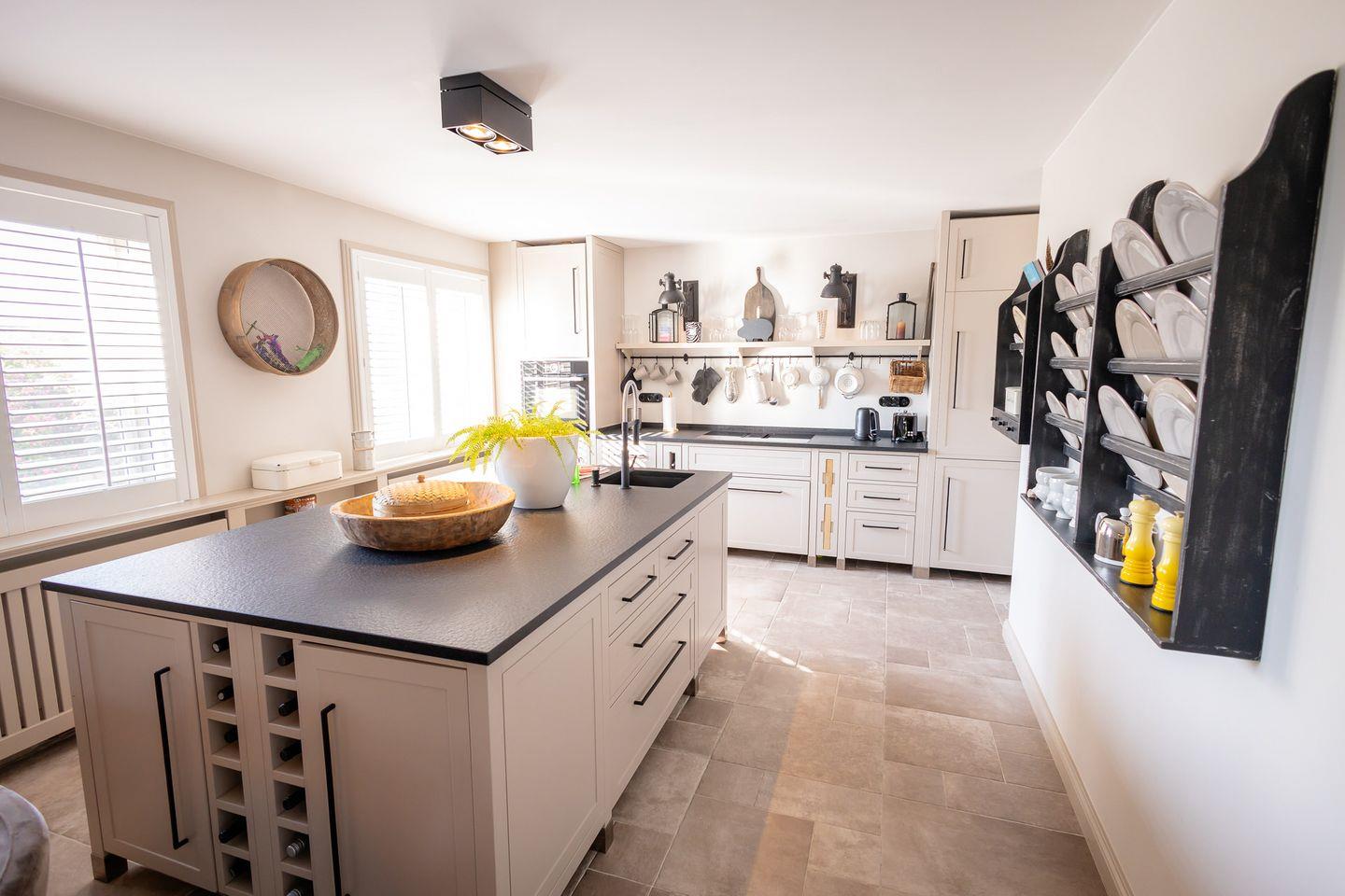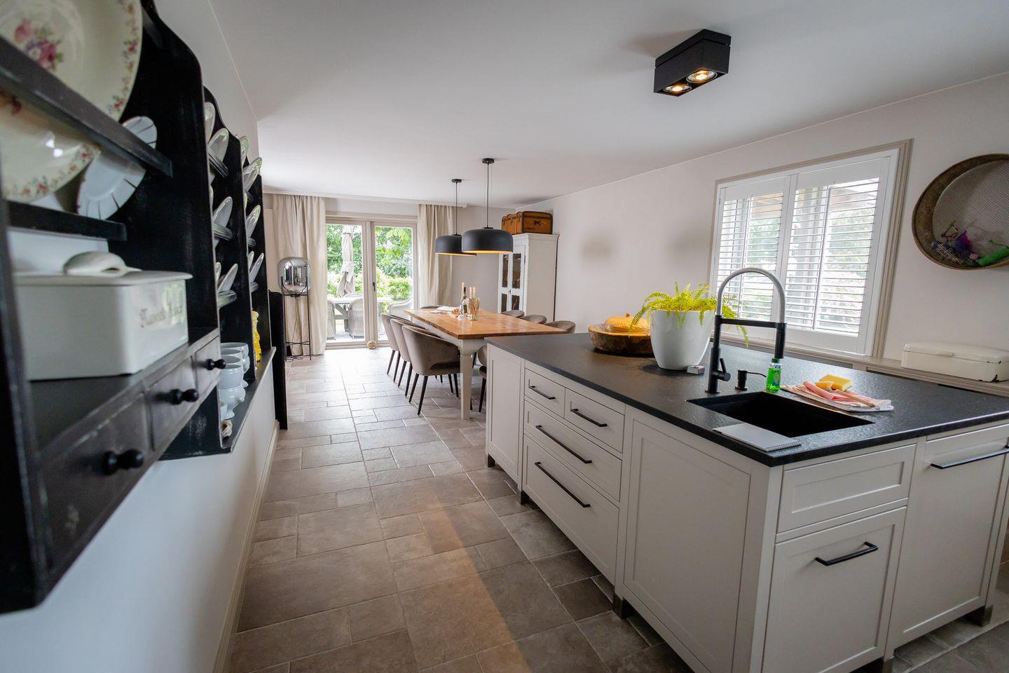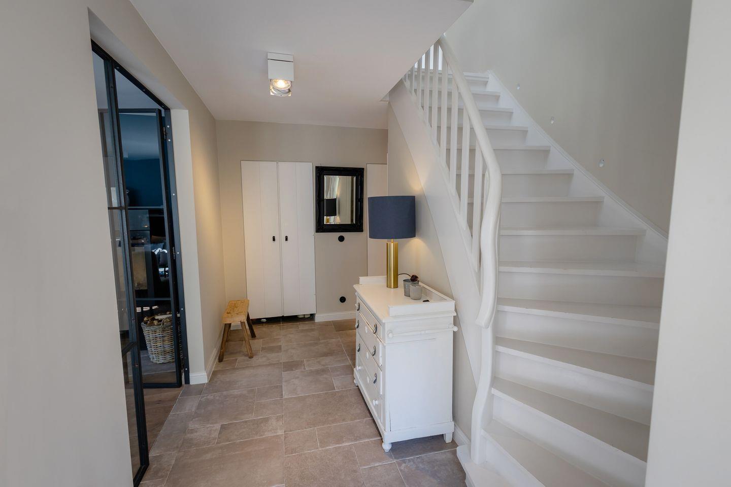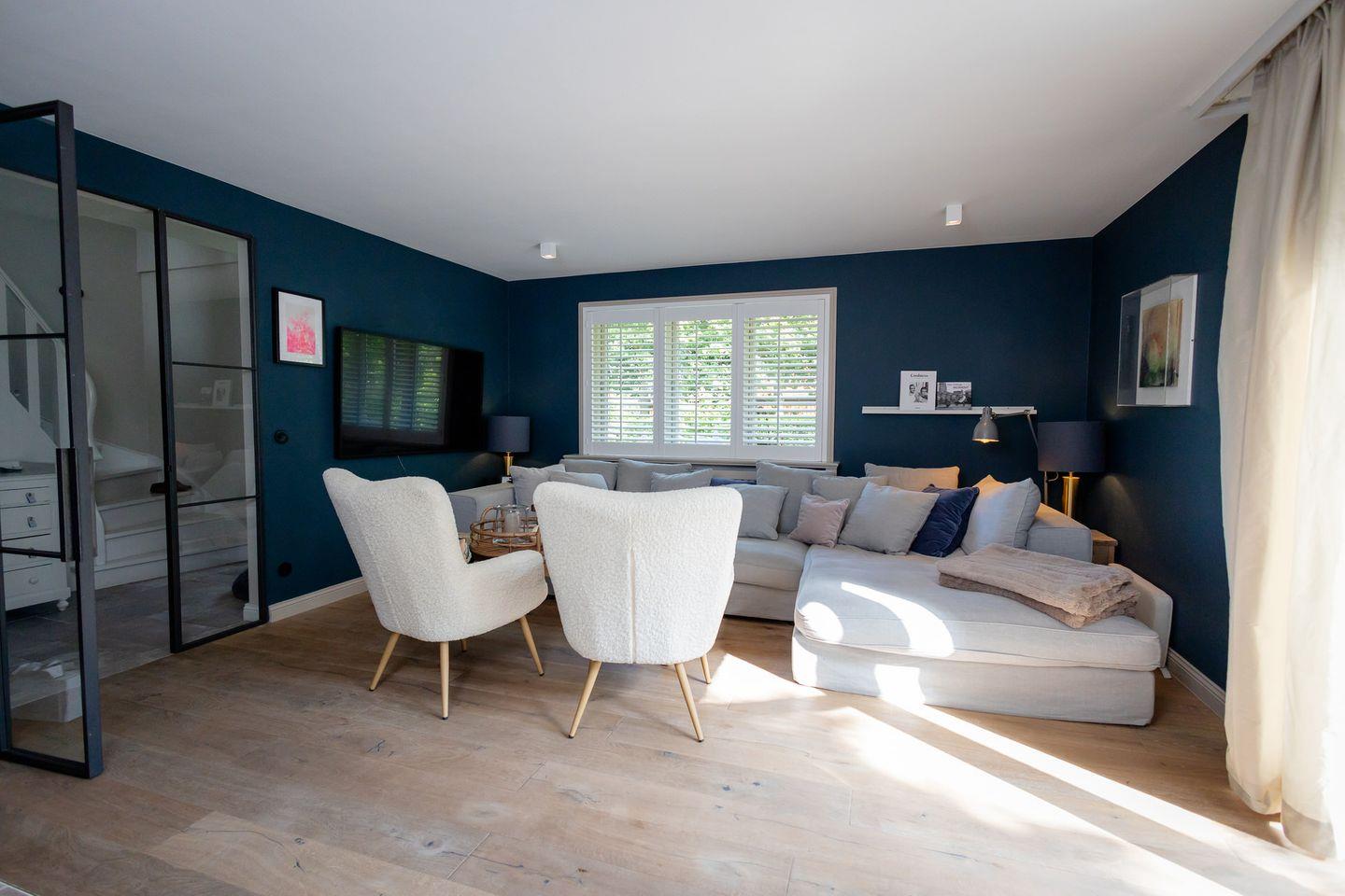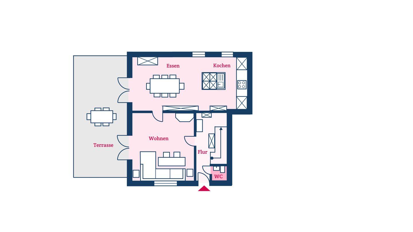 Im Erdgeschoss sind der großzügige Wohn- und Essbereich mit offener Küche und Kamin sowie das Gäste-WC gelegen.