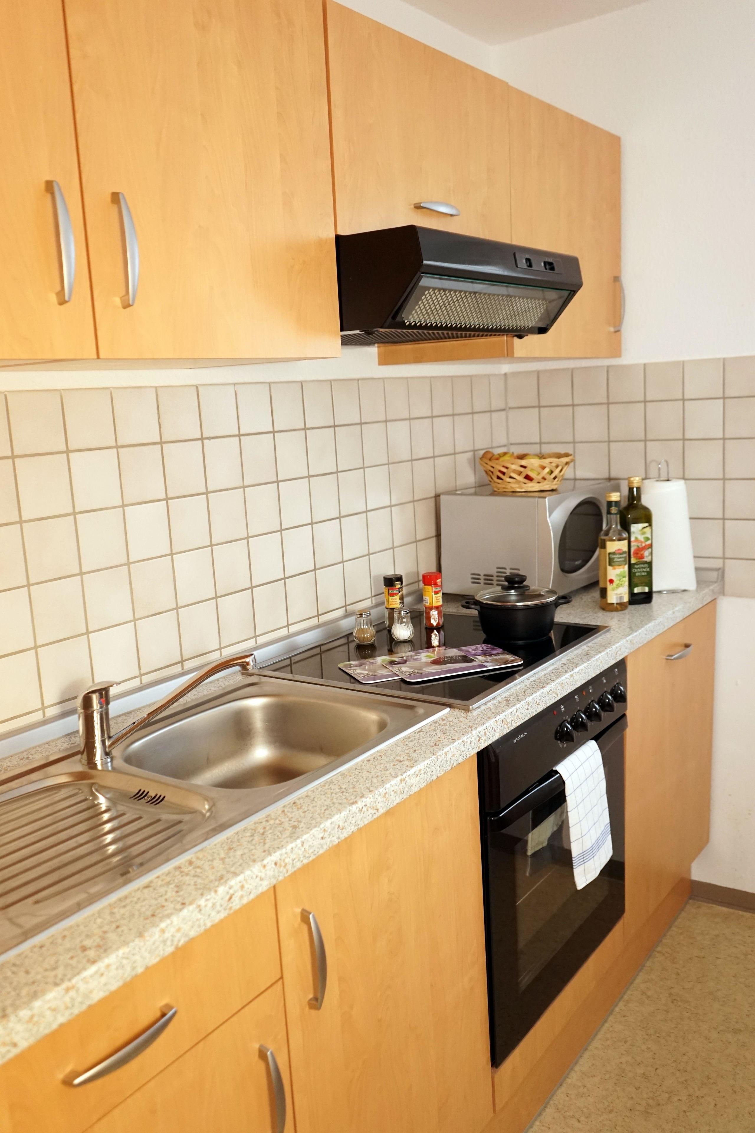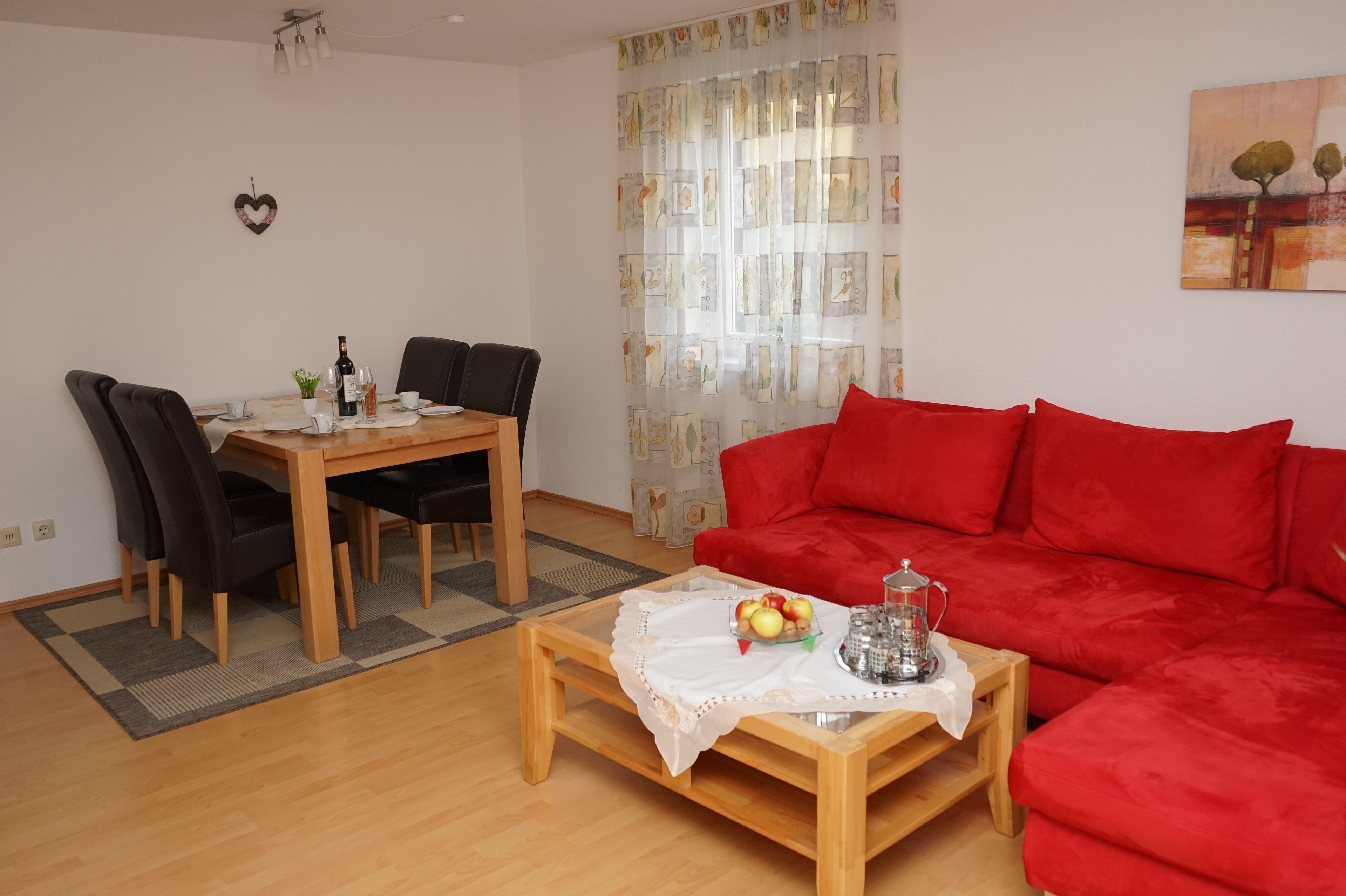Der große Wohn- und Essbereich bietet mit einer gemütlichen Sitzgruppe und Fernsehsessel alle Möglichkeiten zum entspannten Beisammensein und Relaxen. Neben dem vorhandenen LCD-Fernseher stellen wir Ihnen gerne einen DVD/CD-Player und Internetzugang zur Verfügung. Die Ferienwohnung bietet zwei große Schlafzimmer mit Doppelbett und großem Kleiderschrank. Bei Bedarf ist die Sitzgruppe im Wohnzimmer als Schlafmöglichkeit für 2 Personen erweiterbar. Die Einbauküche ist komplett mit Kühlschrank und Gefrierfach, Herd mit Backofen, Mikrowelle, Spülmaschine, Toaster, Kaffeemaschine, Eierkocher, Wasserkocher, sowie allem notwendigen Koch- und Essgeschirr ausgestattet. Das geräumige Badezimmer (inklusive Fön), sowie ein Abstellraum für Koffer und dergleichen runden das Raumangebot ab. Der große überdachte Balkon ist möbliert mit einer Sitzgruppe für 4 Personen, damit Sie in der Morgensonne in gemütlicher Runde im Freien frühstücken und entspannt in den Tag starten können.
