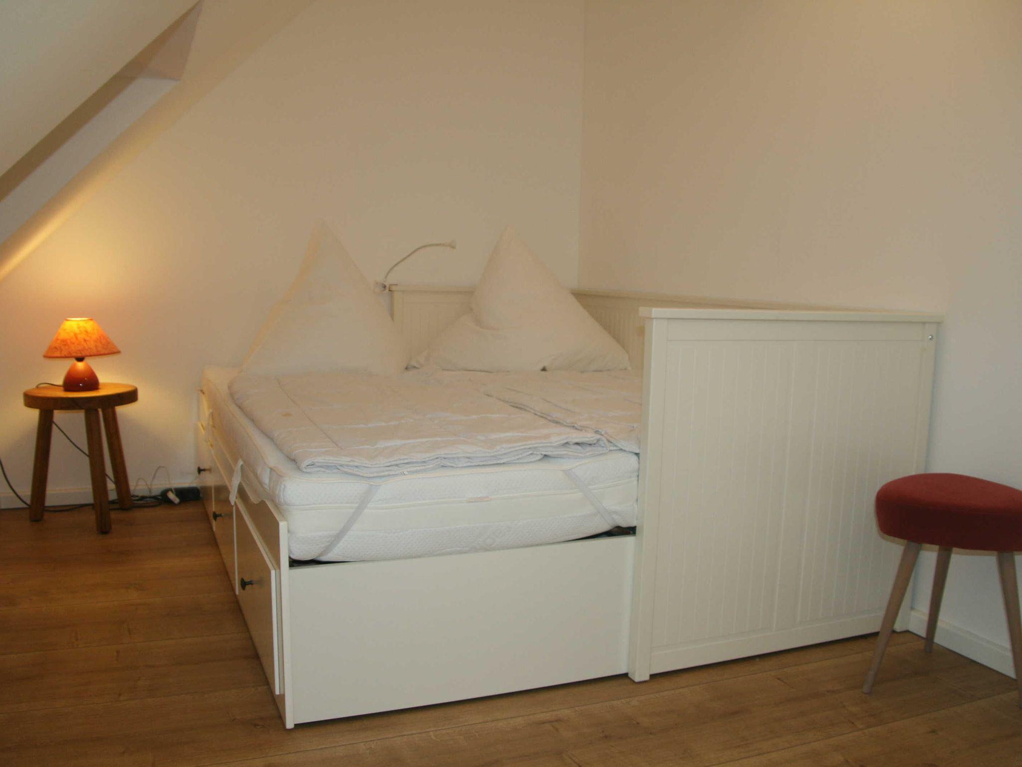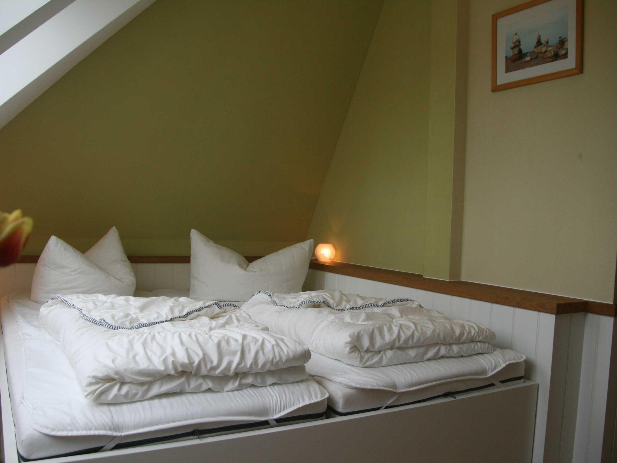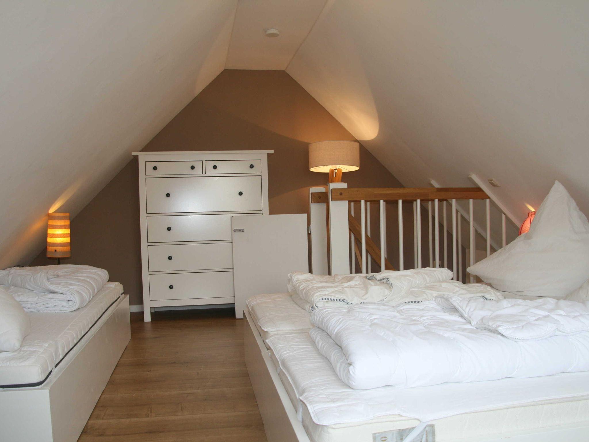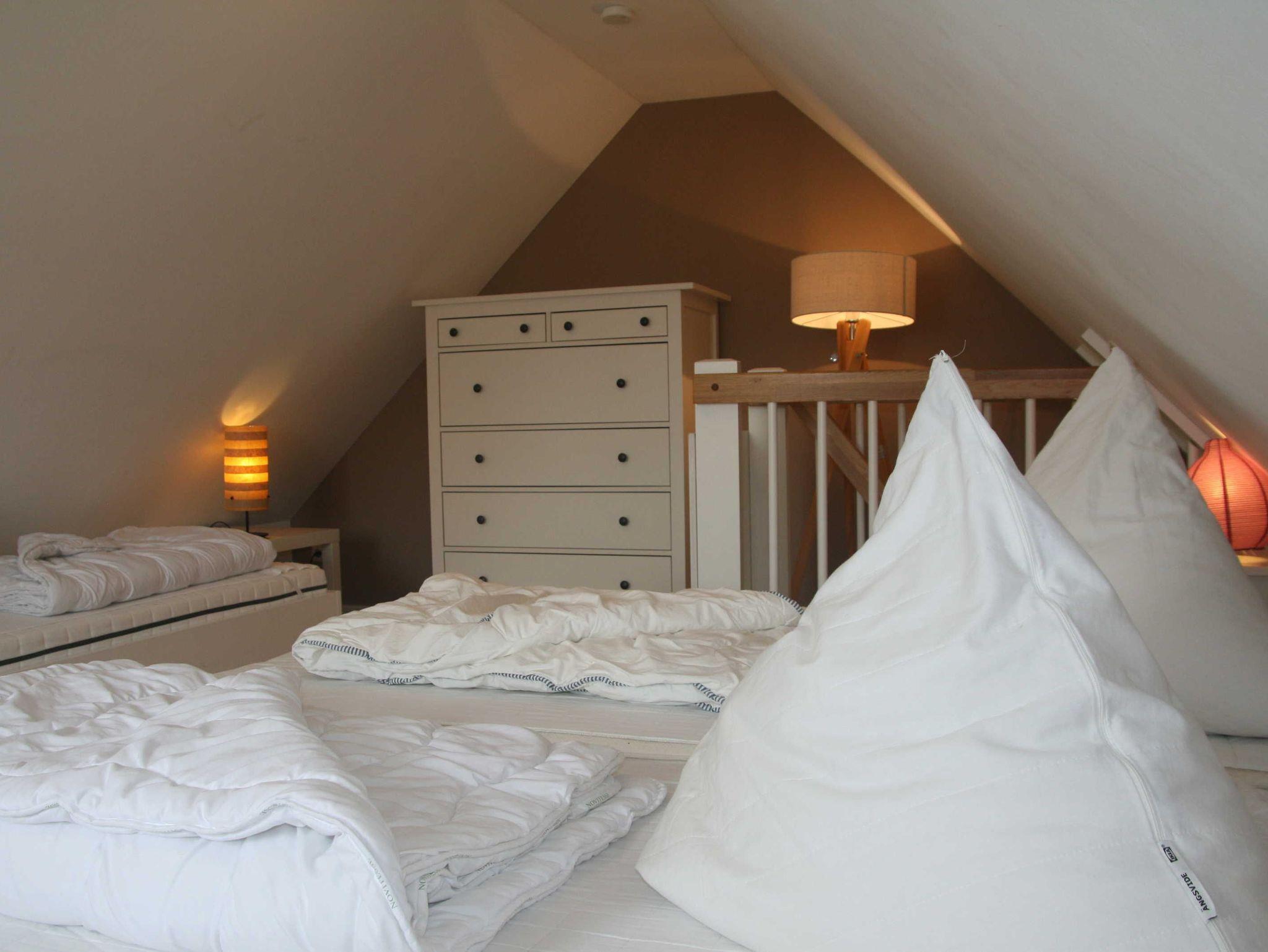 • 1 Schlafgalerie mit 3 Einzelbetten (beliebig auch als Doppelbett stellbar) im Dachgeschoss