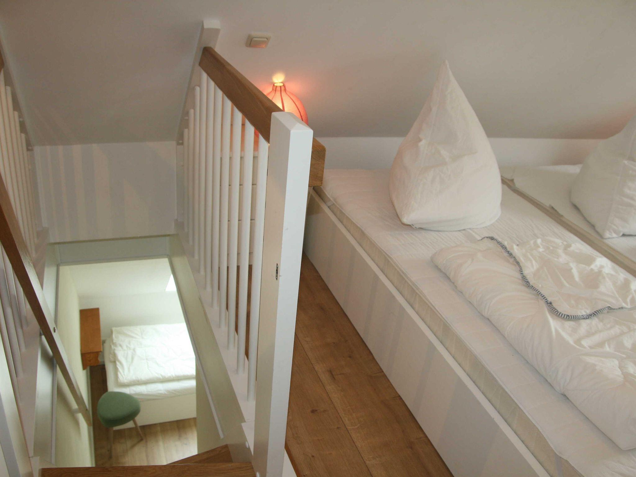 • Kleiner Durchgangsraum mit Einzelbett und Treppenaufgang zur Schlafgalerie