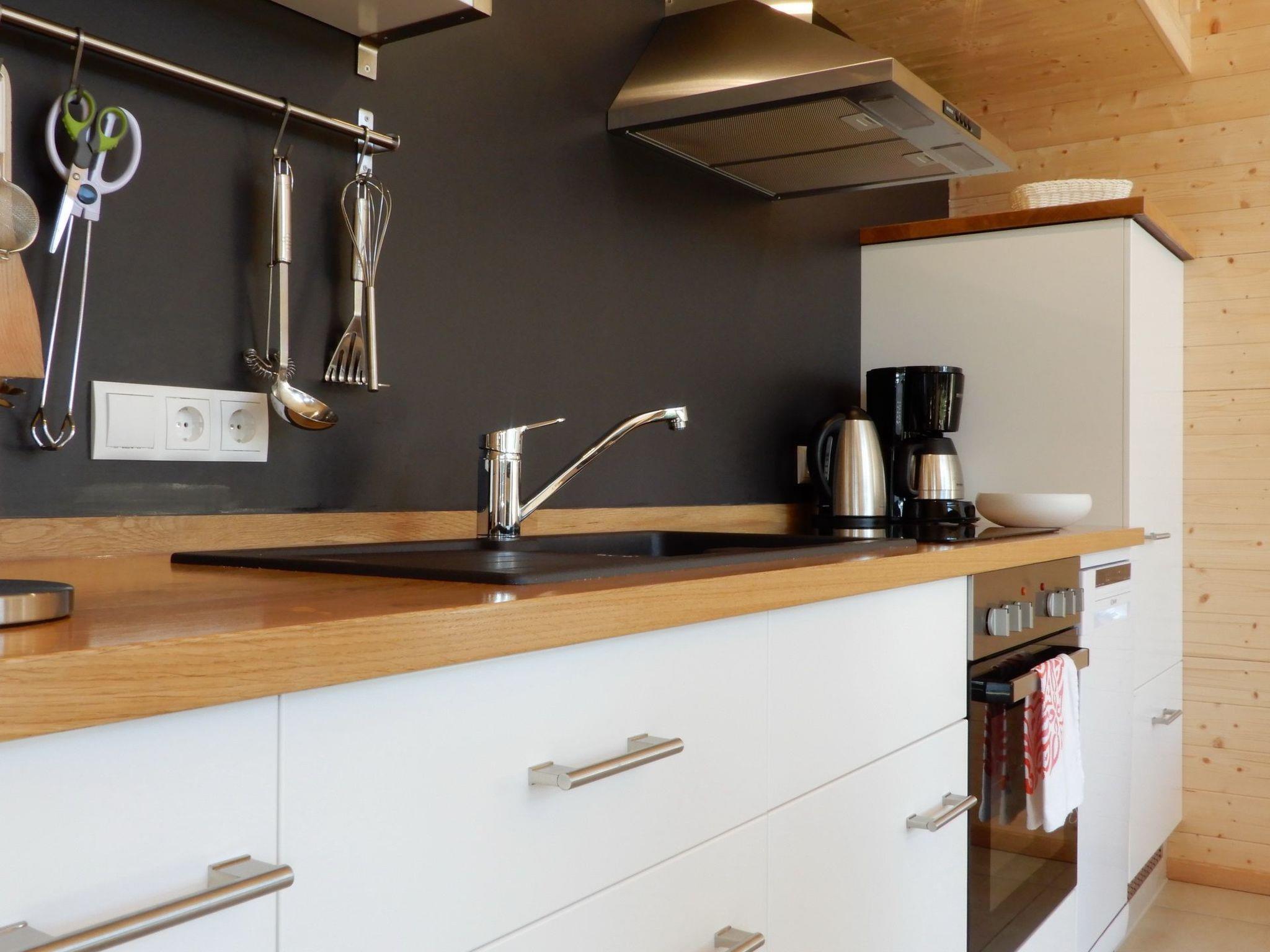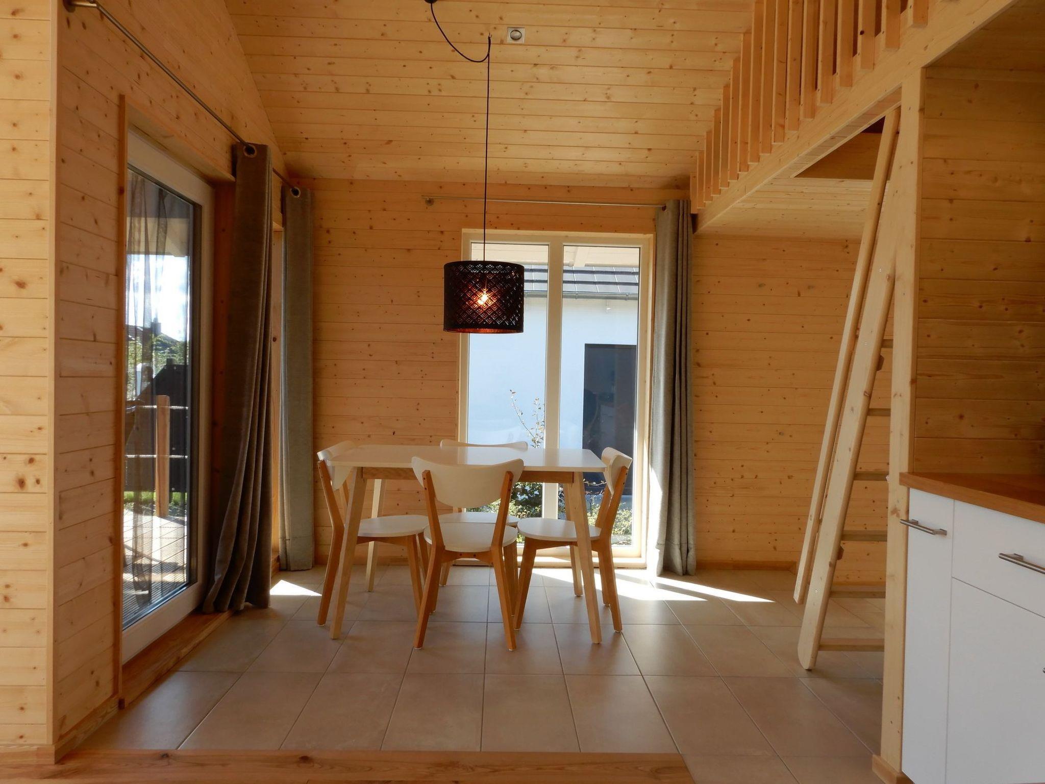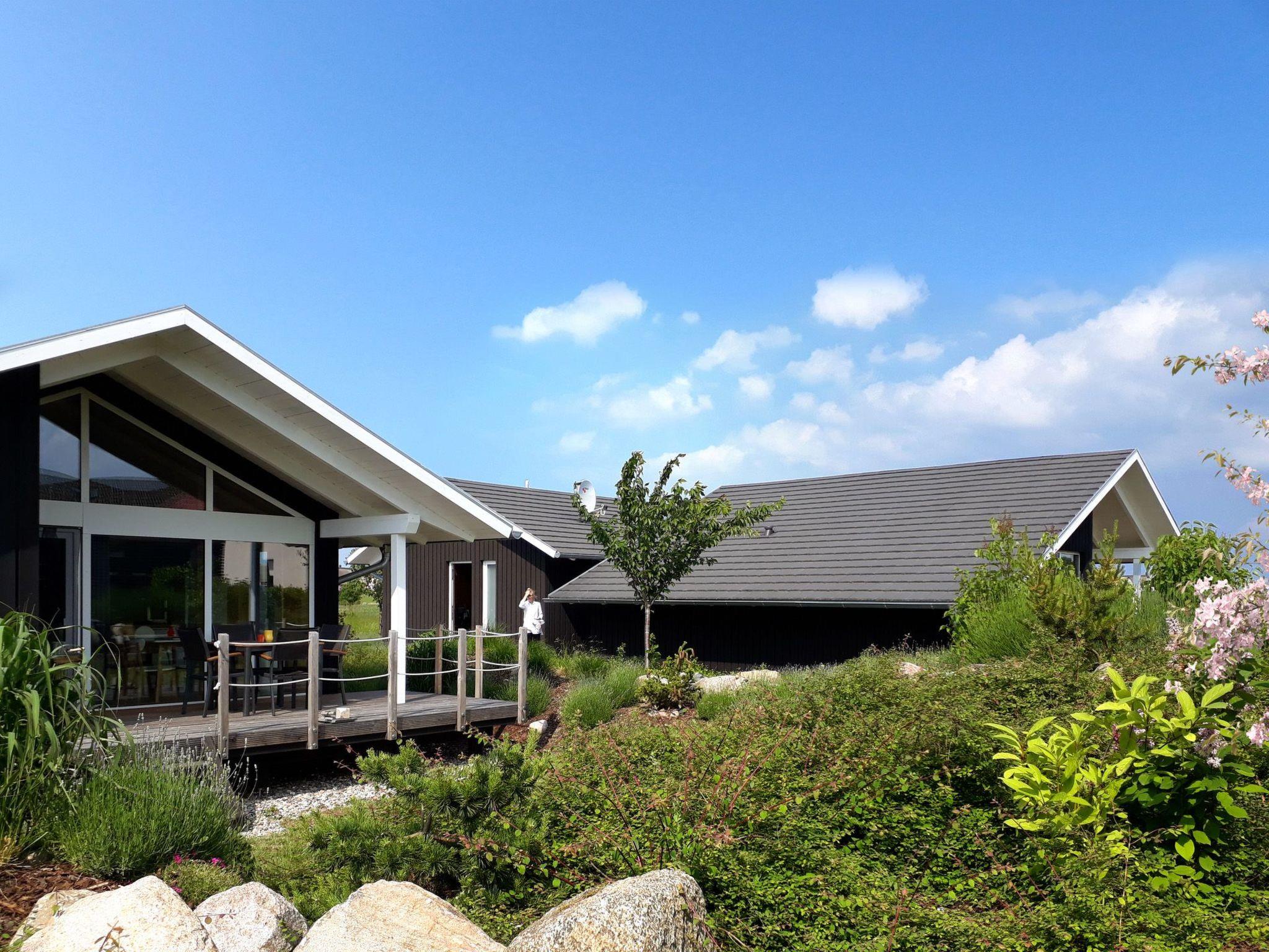 Inside the house, you will find an individual and functional floor plan that offers a practical yet cosy room layout. The customised built-in furniture not only creates a cosy atmosphere in the bedrooms. The centrepiece is undoubtedly the open-plan kitchen-living room, from which you can look directly into the lushly landscaped garden through the large glass front. Thanks to the underfloor heating and an ecological geothermal heat pump, your feet will stay warm even in the colder months, and the spacious sauna, which is shared by all four holiday homes, invites you to relax.